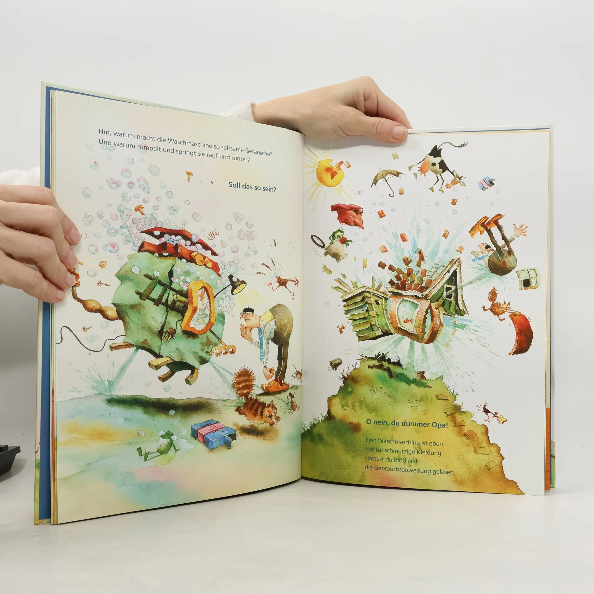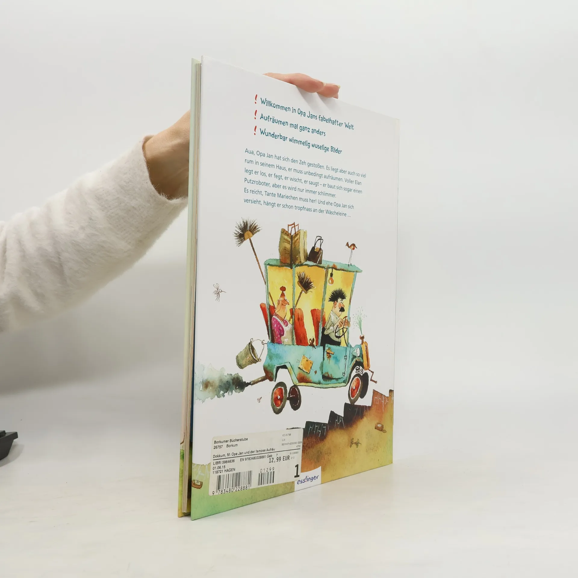 Aua, Opa Jan hat sich den Zeh gestoßen. Es liegt aber auch so viel rum in seinem Haus, Opa Jan muss mal aufräumen. Voller Elan legt er los, er fegt, er wischt, er saugt - aber es wird nur immer schlimmer. Auch der selbstgebaute Putzroboter produziert nur Dreck. Es reicht, Tante Mariechen muss her! Und ehe Opa Jan sich versieht, hängt er schon tropfnass an der Wäscheleine. Ach, wie schön war doch das Leben, als noch alles ein bisschen unordentlich war.