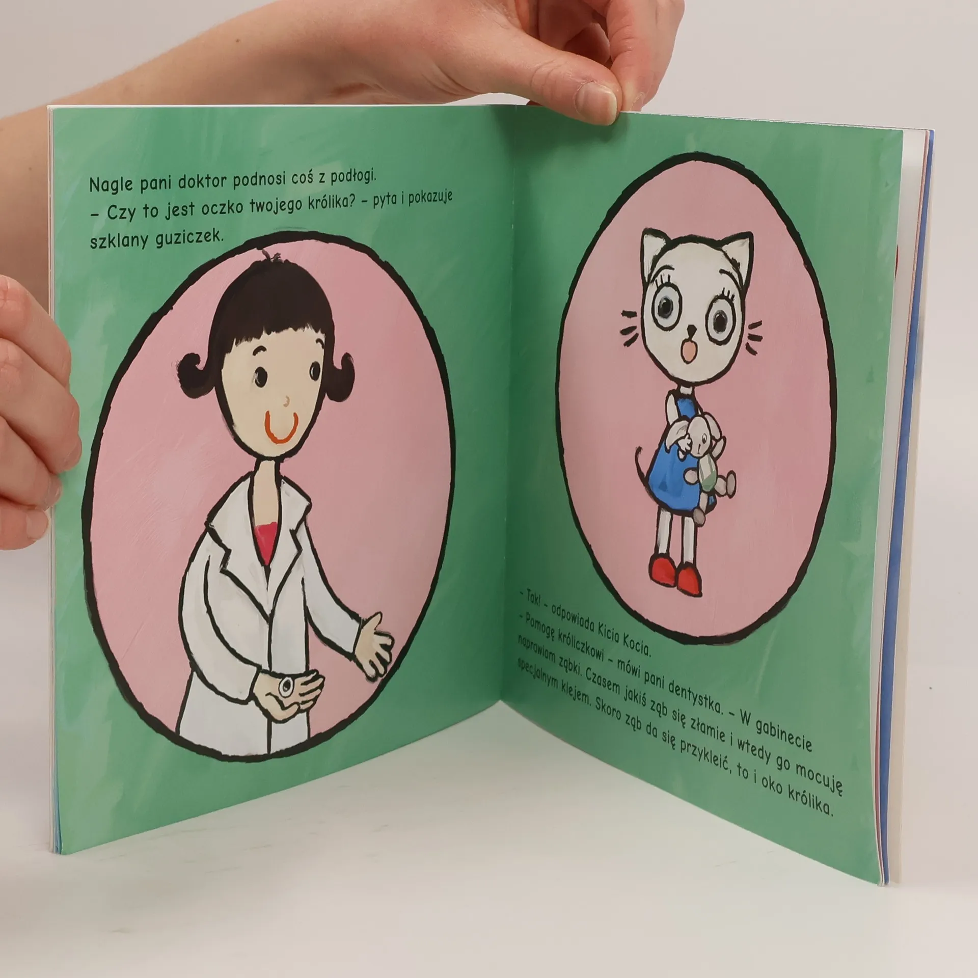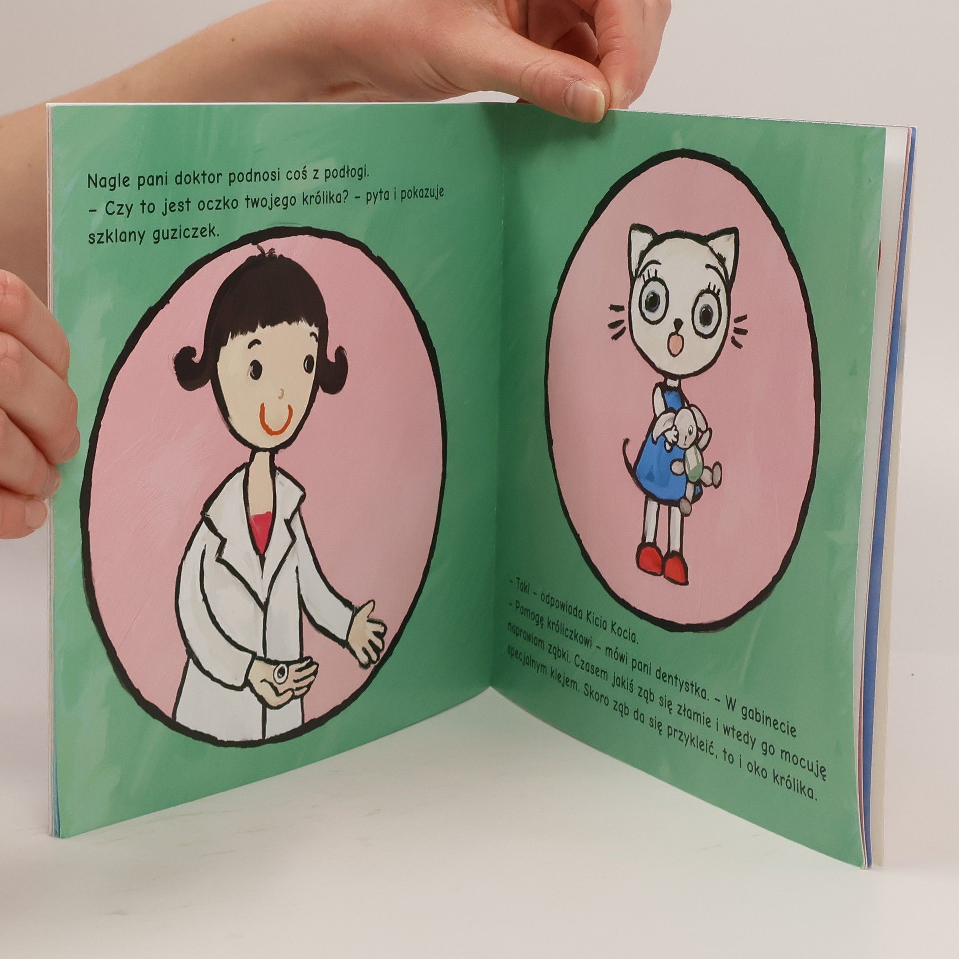 Kicia Kocia wybiera się do dentysty! Nigdy jeszcze nie była w dentystycznym gabinecie. Jest ciekawa, ale trochę się boi. Starannie myje ząbki, pani doktor je obejrzy, żeby stwierdzić, czy są zdrowe. Ząbki są zdrowe, Kicia Kocia już się nie boi i obiecuje, że będzie o nie dbała i zachęci do tego swoich przyjaciół.