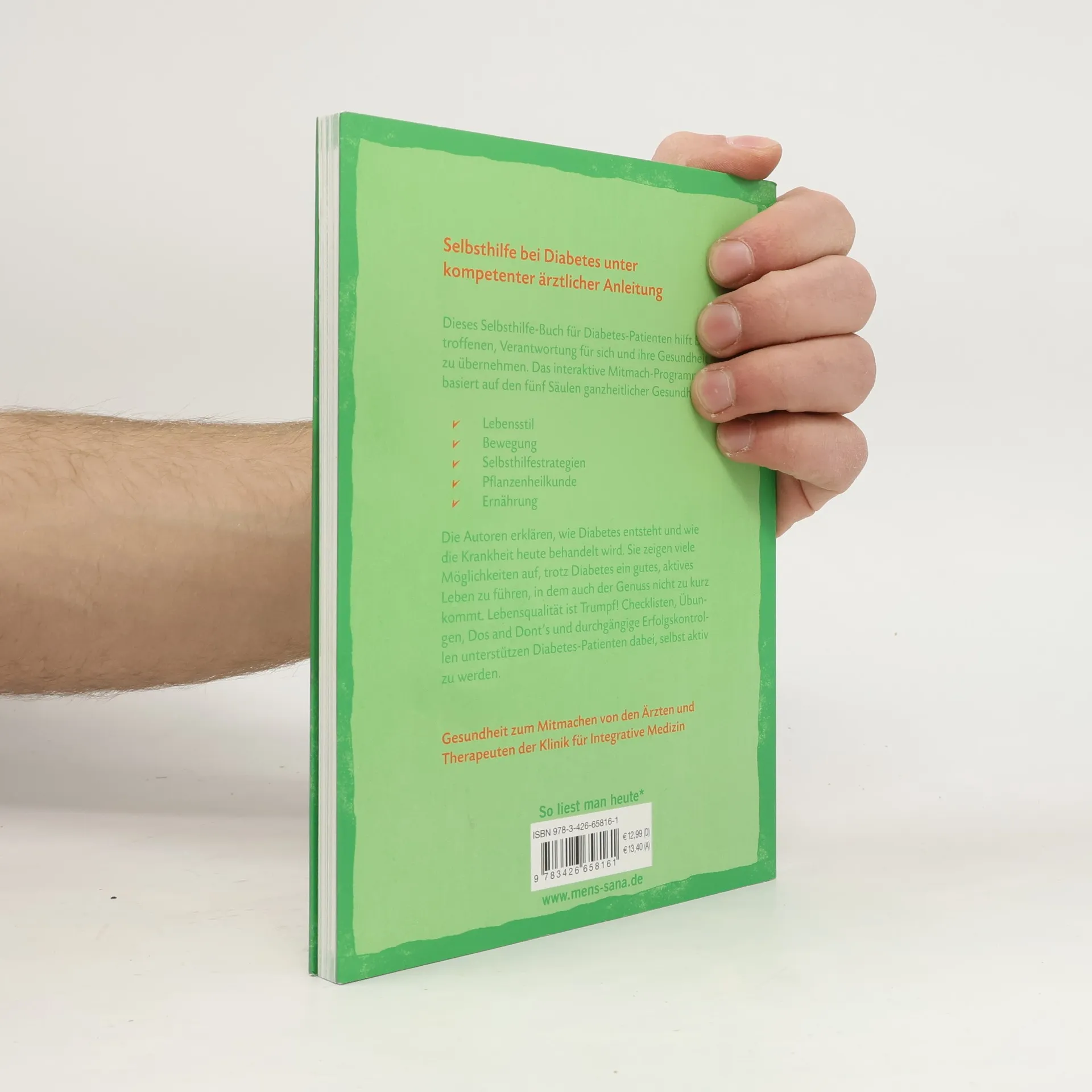 Selbsthilfe bei der erste Gesundheitsratgeber zum Mitmachen unter kompetenter therapeutischer Anleitung von den Spezialisten der Klinik für Naturheilkunde und integrative Medizin in Essen.Der Diabetesberater Mario Althaus und die Ökotrophologin Sabine Pork sind seit Jahren im Bereich Diabetes und in der Naturheilkunde tätig. Gemeinsam haben sie ihre Erfahrungen in diesen interaktiven Patienten-Coaching aufbereitet.Diabetes mellitus ist eine chronische Stoffwechselerkrankung, die erhöhte Blutzuckerwerte nach sich zieht. Langfristig führen diese zu Folgeschäden. Jedoch kann durch eine gesunde Lebensweise jenen Folgeschäden weitgehend entgegengewirkt werden, sodass Lebensqualität und Selbstständigkeit entsprechend erhalten bleiben.Die naturheilkundlichen Möglichkeiten sind nicht unbedingt Ersatz für Diabetes-Medikamente oder Insuline, sondern verstehen sich auch als hilfreiche Ergänzung und ein Mehr an Möglichkeiten zur Unterstützung der Diabetes-Therapie.Das Mitmach-Programm basiert auf den fünf Säulen ganzheitlicher Entspannung, Bewegung, Hydrotherapie, Pflanzenheilkunde und Ernährung.Checklisten, Fragebögen, Ernährungs-Coaching, Mitmach-Übungen, Dos and Don'ts und durchgängige Erfolgskontrollen unterstützen dabei, selbst aktiv zu werden und das eigene Wohlempfinden und die Lebensqualität zu verbessern.