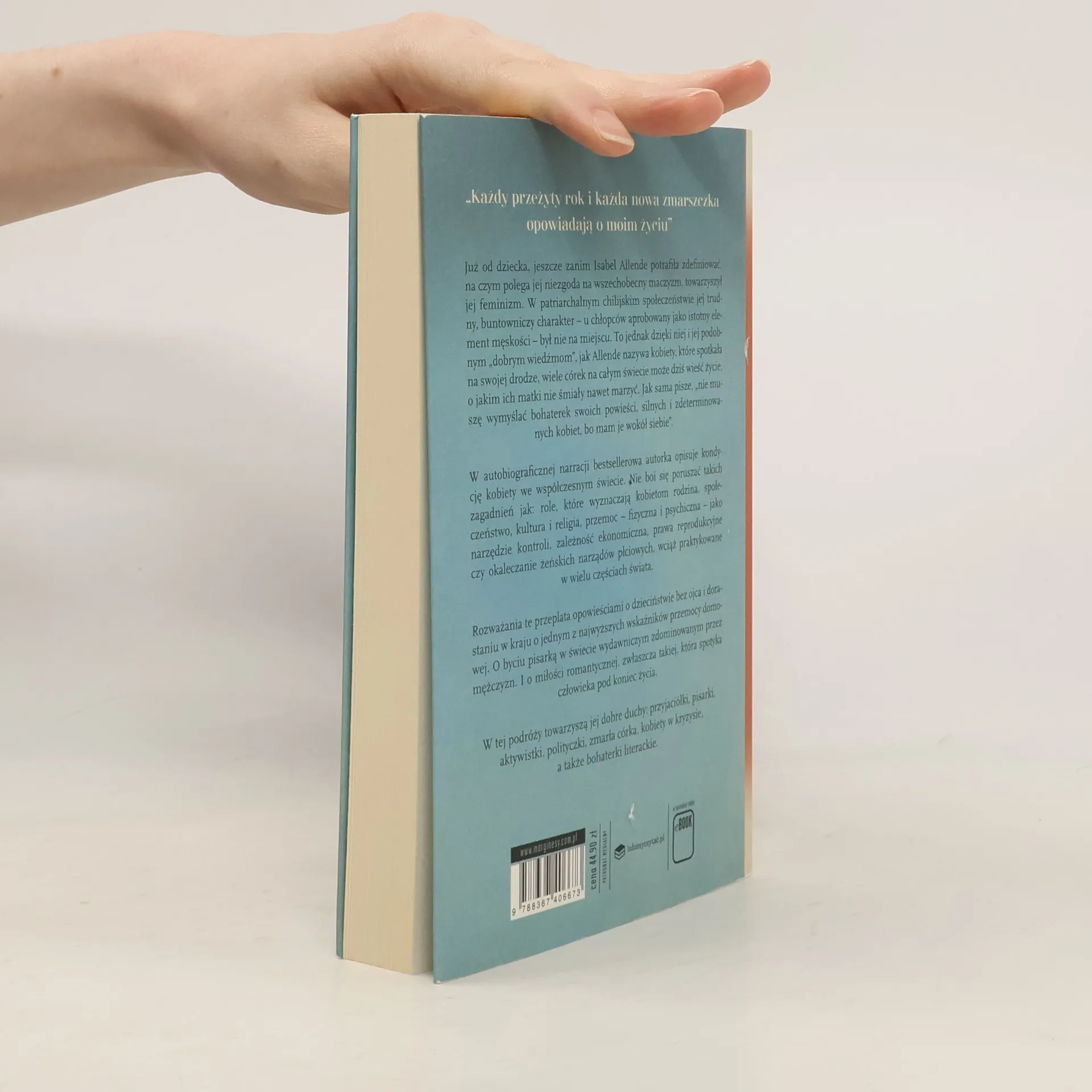 Już od dziecka, jeszcze zanim potrafiła zdefiniować, na czym polega jej niezgoda na wszechobecny maczyzm, Isabel Allende towarzyszył feminizm. W patriarchalnym chilijskim społeczeństwie jej trudny, buntowniczy charakter--u chłopców aprobowany jako istotny element męskości--był nie na miejscu. To jednak dzięki niej i jej podobnym „dobrym wiedżmom", jak Allende nazywa kobiety, które spotkała na swoje drodze i które razem z nią budowały feminizm drugiej fali, wiele córek na całym świecie może dziś wieść życie, o którym ich matki nie mogły nawet marzyć. Jak sama pisze, „nie muszę wymyślać bohaterek swoich powieści, silnych i zdeterminowanych kobiet, bo mam je wokół siebie". W autobiograficznej narracji bestsellerowa autorka opisuje kondycję kobiety we współczesnym świecie. Mimo dotychczasowych zdobyczy feminizmu wciąż jest bowiem wiele do zrobienia. Allende nie boi się poruszać takich zagadnień jak: role, które wyznaczają kobietom rodzina, społeczeństwo, kultura i religia, przemoc-- fizyczna i psychiczna--jako narzędzie kontroli, zależność ekonomiczna, prawa reprodukcyjne czy okaleczanie żeńskich narządów płciowych, wciąż praktykowane w wielu częściach świata.