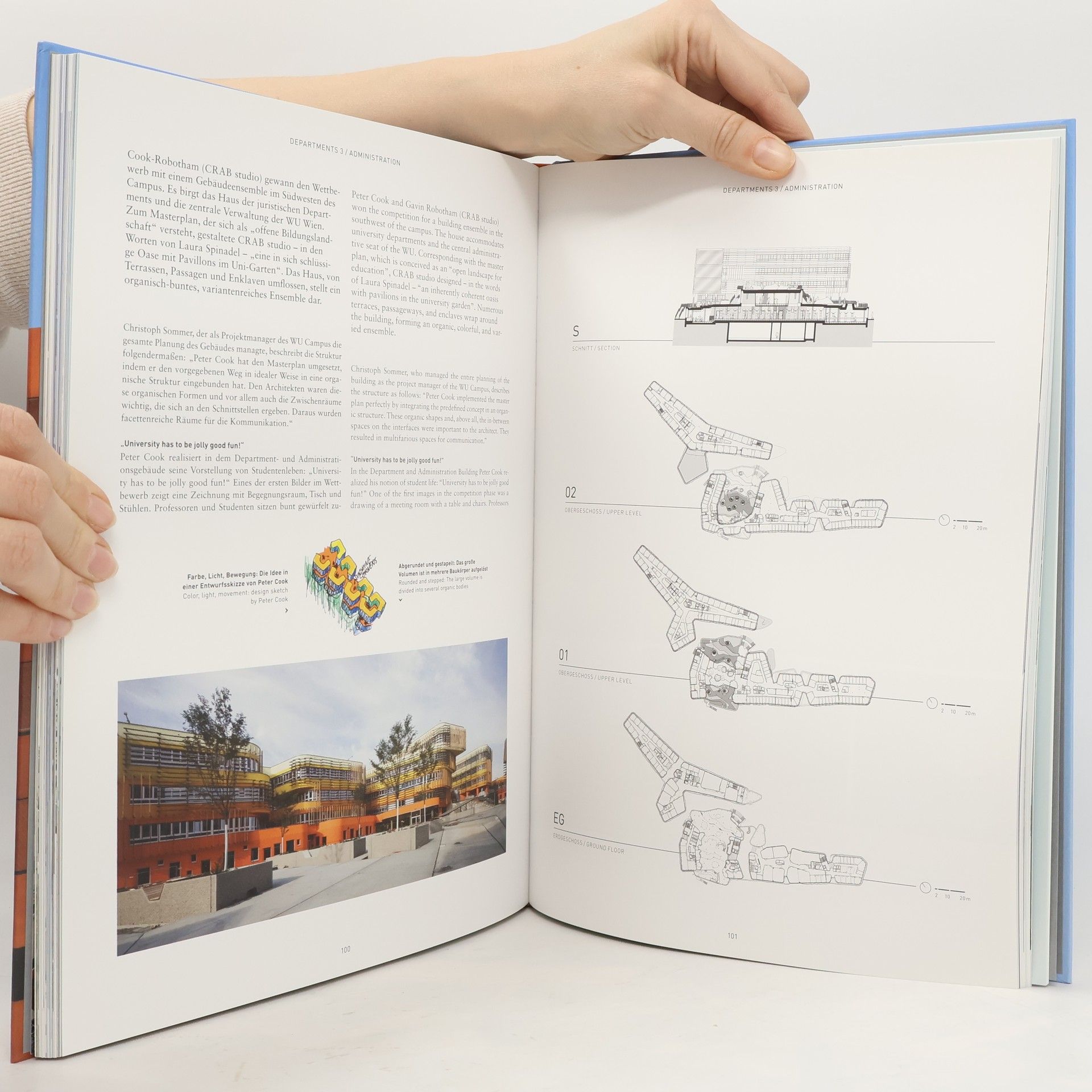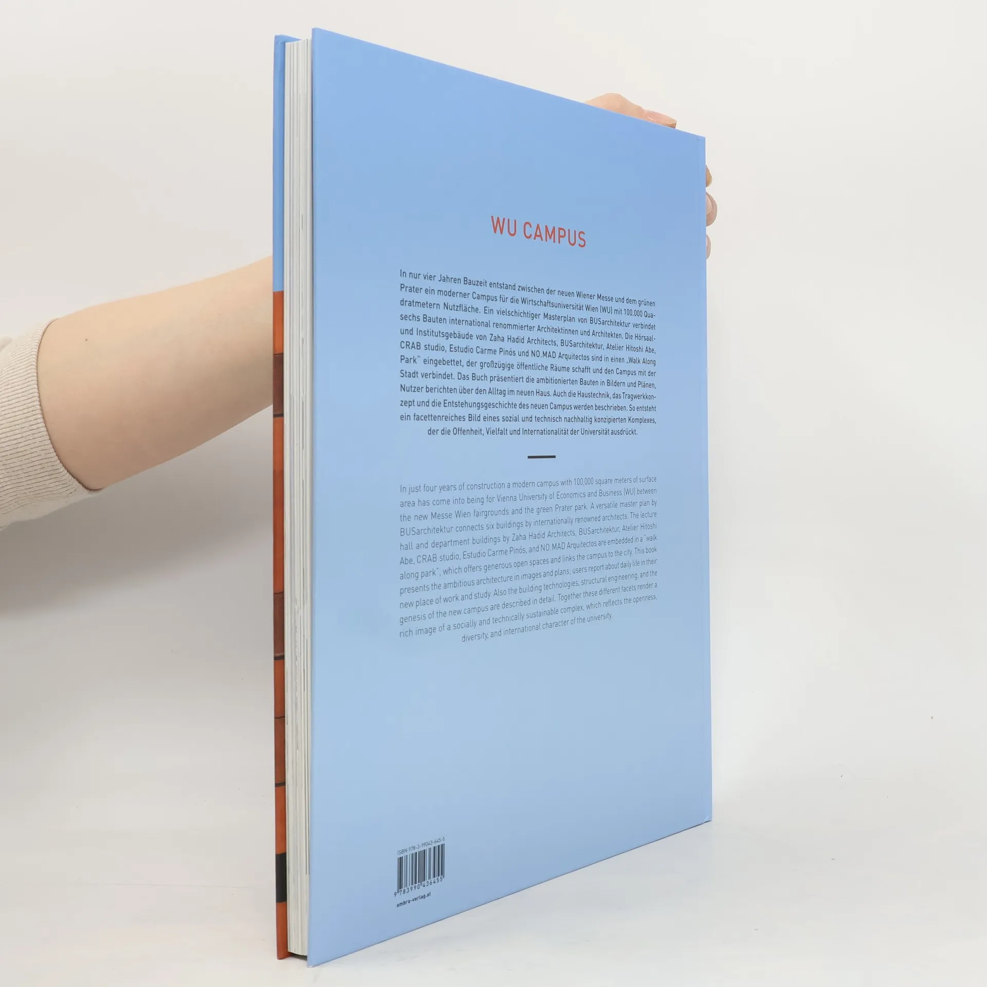 Six top architects built a campus and a "walking along park". Master plan by bus architecture. Contributions of leading architecture critics, user statements and lavish image series. In just four years of construction a modern campus with 100,000 square meters of surface area has come into being for Vienna University of Economics and Business (WU) between the new Messe Wien fairgrounds and the green Prater park. A versatile master plan by BUSarchitektur connects six buildings by internationally renowned architects. The lecture hall and department buildings by Zaha Hadid Architects, BUSarchitektur, Atelier Hitoshi Abe, CRAB studio, Estudio Carme Pinós, and NO. MAD Arquitectos are embedded in a "walk along park", which offers generous open spaces and links the campus to the city. This book presents the ambitious architecture in images and plans; users report about daily life in their new place of work and study. Also the building technologies, structural engineering, and the genesis of the new campus are described in detail. Together these different facets render a rich image of a socially and technically sustainable complex, which reflects the openness, diversity, and international character of the university.