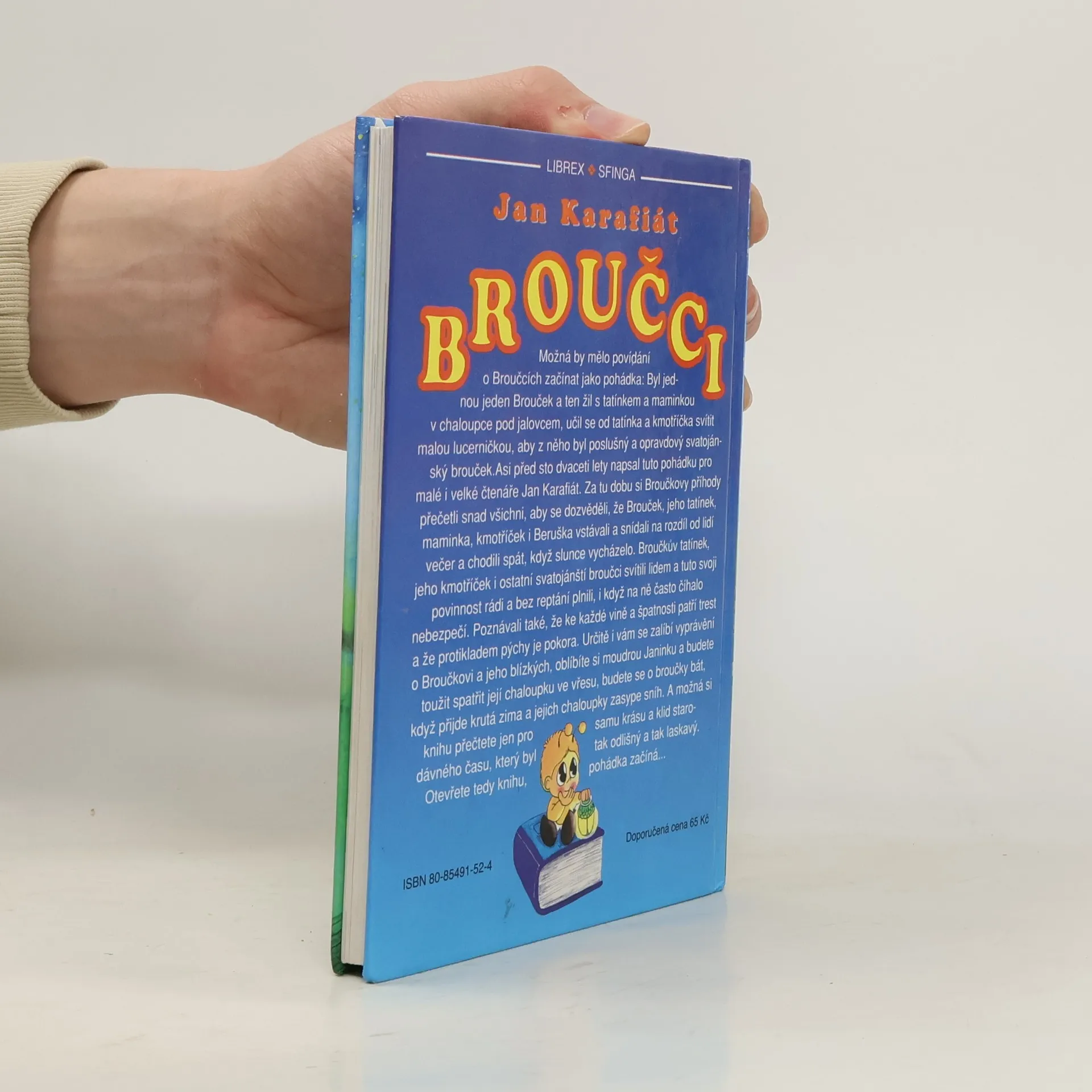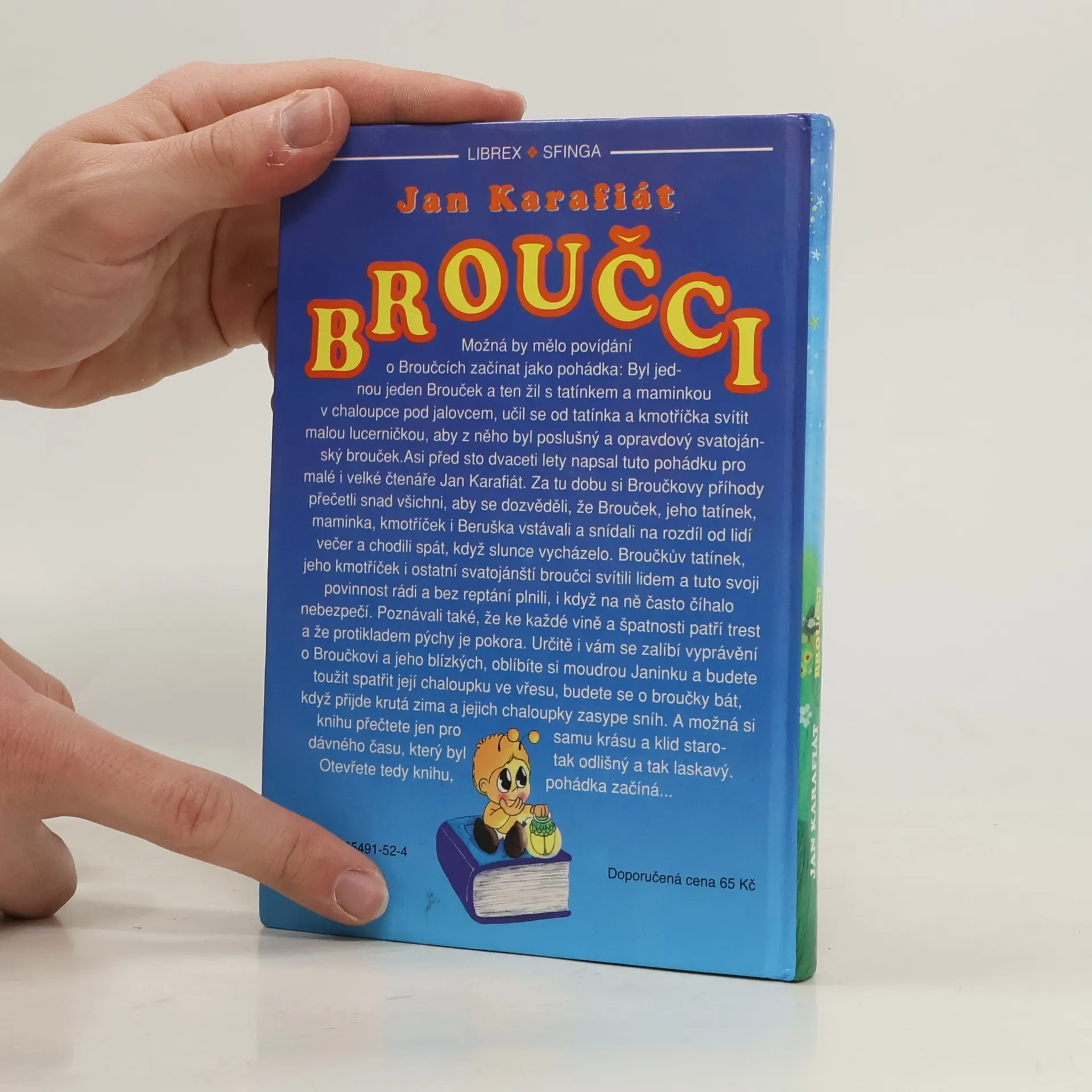 Broučky, jediné umělecké literární dílo Jana Karafiáta (1846–1929), potkaly nejednoduché osudy. Roku 1876 anonymně vyšel skromný, neilustrovaný svazek – tehdy s názvem Broučci pro malé i velké děti – a zapadl vcelku bez povšimnutí. Až teprve po sedmnácti letech knížku objevil a zpopularizoval novinář Gustav Jaroš, který ji označil jako „snad nejkrásnější květ naší české literatury dětské“ a jejího autora nazval „českým Andersenem“. Poetická obraznost Broučků, citlivý přírodní lyrismus a ušlechtilý humanismus si dále uchovávají nepomíjející platnost. I jazykově, svým jadrným básnickým slohem šťastně spojujícím hovorovost lidové řeči s vytříbenými biblismy, je dílo Jana Karafiáta pozoruhodné. Čtenářsky i posluchačsky stále přitažlivé zůstávají postavičky malých hrdinů, broučků a berušek, které při všech svých světlých stránkách nejsou zbaveny pravdivých lidských vlastností. Spolehlivým průvodcem Broučků jsou ilustrace národního umělce Jiřího Trnky, které přes časový odstup od svého vzniku na počátku čtyřicátých let nic nepozbyly ze svého půvabu.