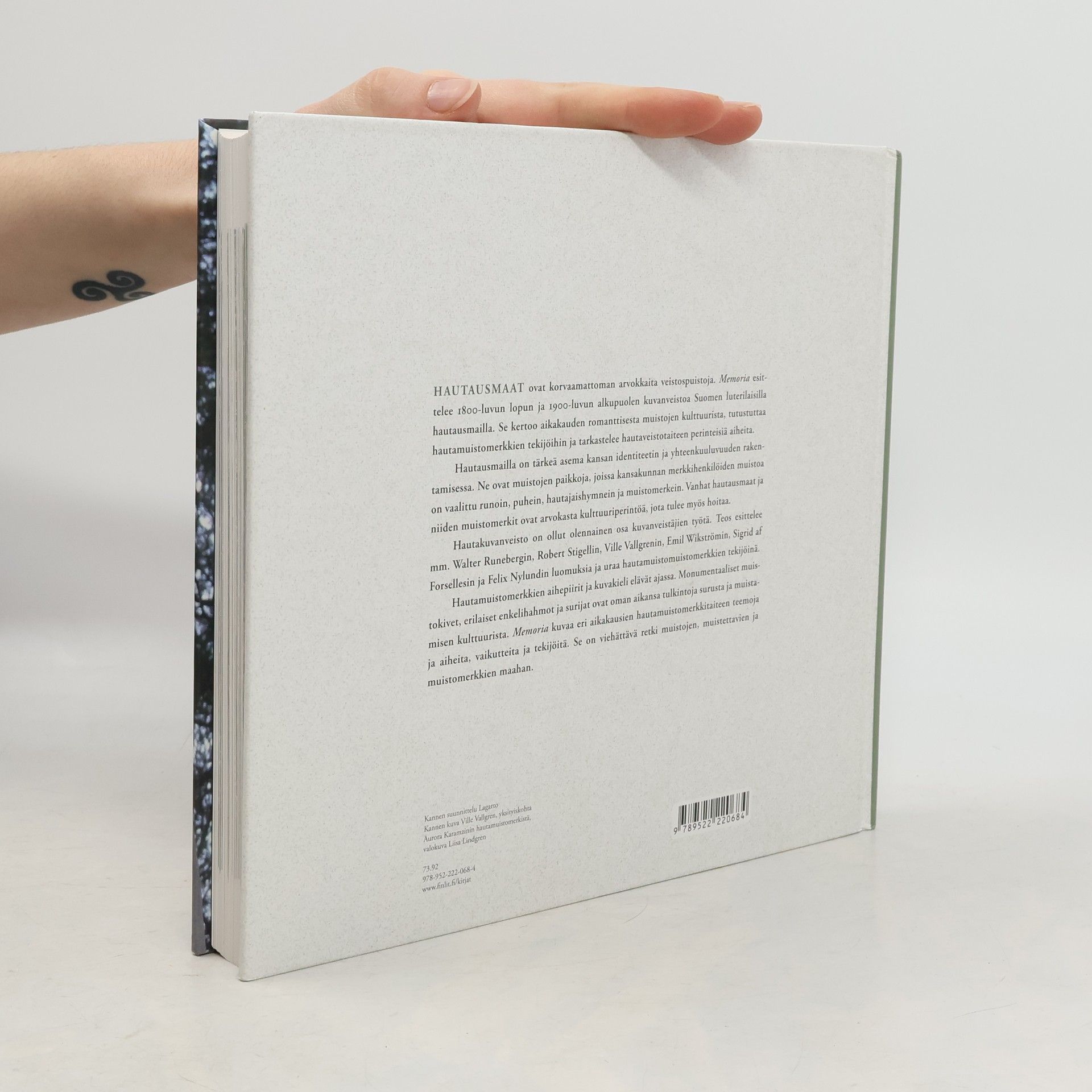 Hautausmailla on tärkeä asema kansan identiteetin ja yhteenkuuluvuuden rakentamisessa. Vanhat hautausmaat ja niiden muistomerkit ovat myös korvaamattoman arvokkaita veistospuistoja ja siten arvokasta kulttuuriperintöä, jota tulee hoitaa.Memoria esittelee 1800-luvun lopun ja 1900-luvun alkupuolen kuvanveistoa Suomen luterilaisilla hautausmailla. Se kertoo aikakauden romanttisesta muistojen kulttuurista, tutustuttaa hautamuistomerkkien tekijöihin ja tarkastelee hautaveistotaiteen perinteisiä aiheita ja vaikutteita. Hautamuistomerkkien aihepiirit ja kuvakieli elävät ajassa. Monumentaaliset muistokivet, erilaiset enkelihahmot ja surijat ovat oman aikansa tulkintoja surusta ja muistamisen kulttuurista. Hautakuvanveisto on ollut olennainen osa kuvanveistäjien työtä. Teos esittelee mm. Walter Runebergin, Robert Stigellin, Ville Vallgrenin, Emil Wikströmin, Sigrid af Forsellesin ja Felix Nylundin luomuksia ja uraa hautamuistomuistomerkkien tekijöinä.Memoria on viehättävä retki muistojen, muistettavien ja muistomerkkien maahan. Svenska litteratursällskapet i Finland julkaisee teoksen ruotsiksi.
