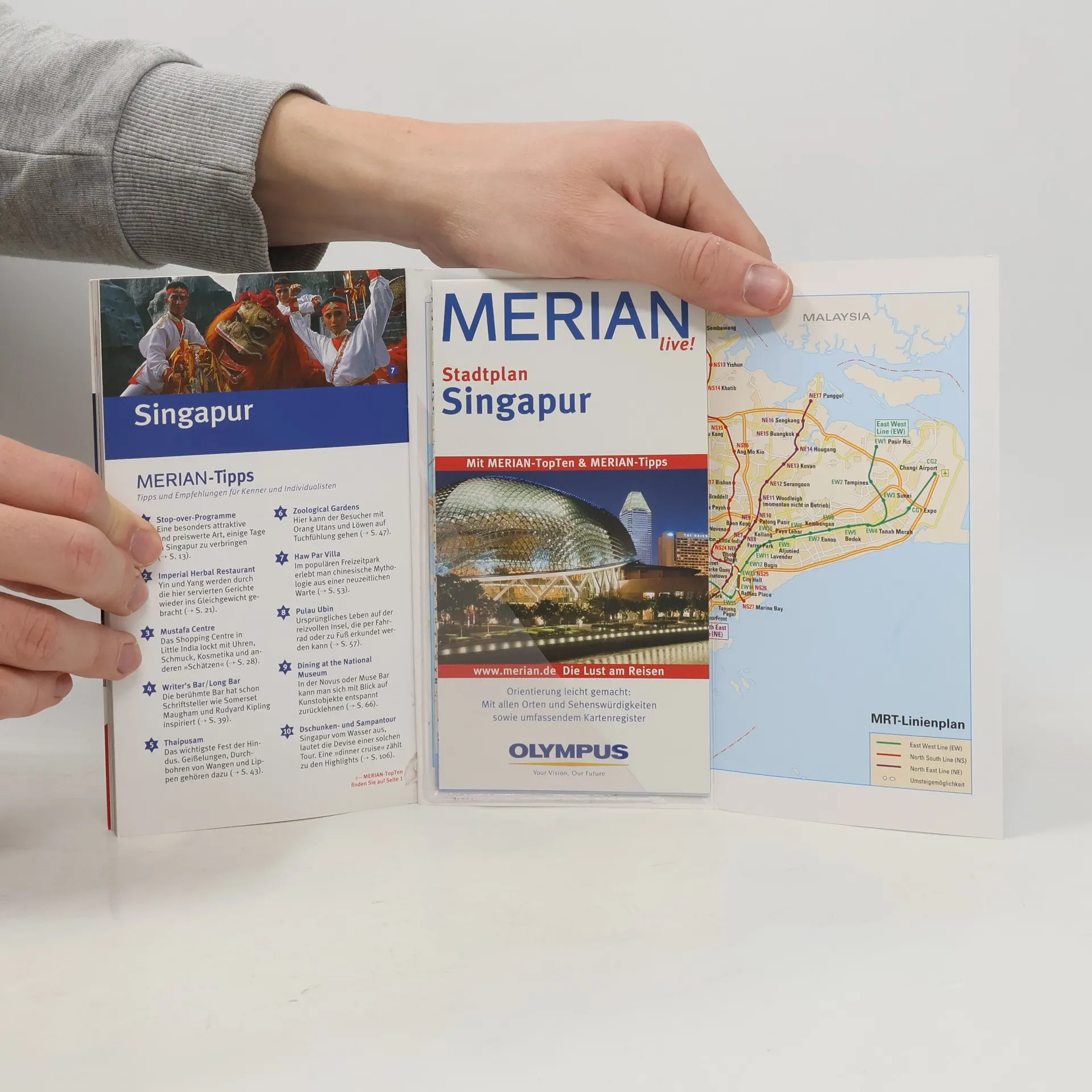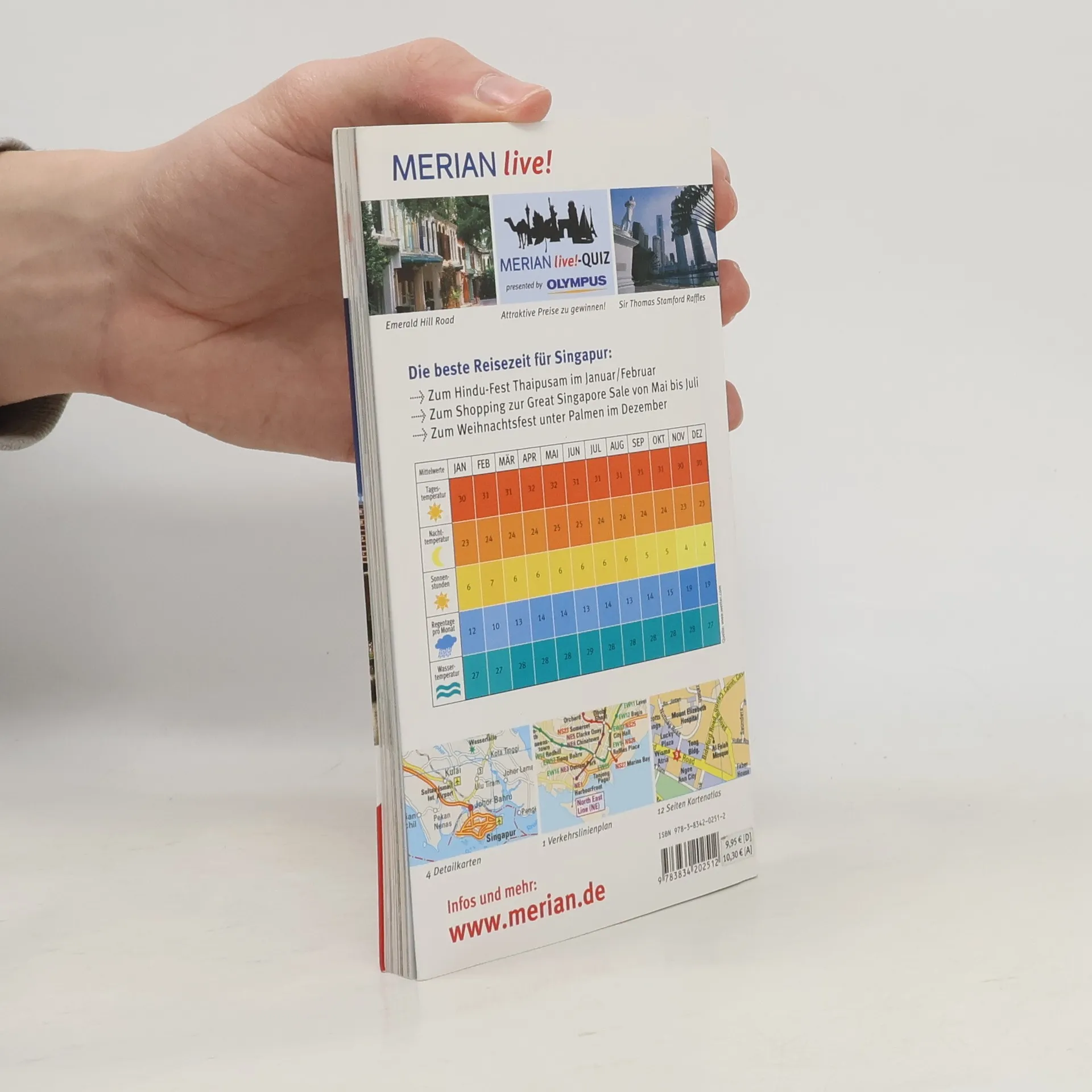 Mehrfach ausgezeichnet als bester Kompakt-Reiseführer: 1. Platz ITB BuchAward! Jetzt neu mit herausnehmbarem Stadtplan zusätzlich zum Kartenatlas. Extra: MERIAN-Quiz mit Gewinnspiel! Eine Auswahl aus dem Inhalt des MERIAN live! Singapur:§Sehenswertes:Orchard Road, Raffles Hotel, Sentosa, Night Safari im Singapore Zoo u.v.m.§Museen und Galerien: Art Museum, History Museum, Philatelic Museum u.v.m.§Die 5 schönsten Stadtrundgänge: Arab Street, Little India, Colonial District, Chinatown, River Valley District§Die 5 lohnendsten Ausflüge in die Umgebung: Singapurs Inseln, Johore Bahru/Malaysia, Malacca/Malaysia, Bintan Island/Indonesien, Zu den Kopfjägern auf Borneo.§ Ca. 60 Farbfotos, herausnehmbarer Stadtplan plus 12 Seiten Kartenatlas, 1 Übersichtskarte, 2 Detailpläne, Verkehrslinienplan, Sprachführer und Essdolmetscher, MERIAN-TopTen und MERIAN-Tipps. MERIAN-Spezial-Themen: Einkaufsparadies Singapur - Tipps und Tricks für die Shoppingtour.