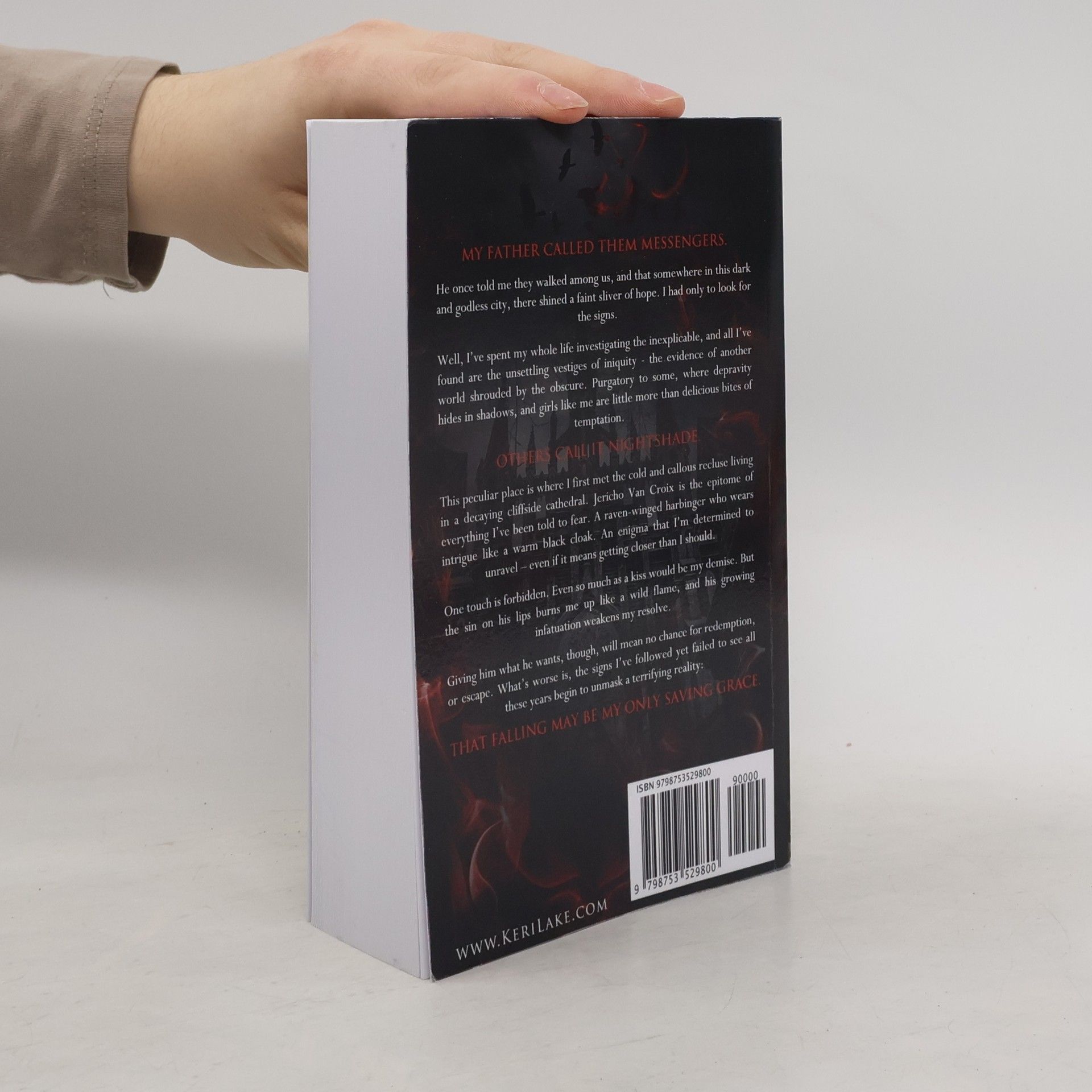 A love so forbidden, it would shake the heavens. My father called them messengers.He once told me they walked among us, and that somewhere in this dark and godless city, there shined a faint sliver of hope. I had only to look for the signs. Well, I’ve spent my whole life investigating the inexplicable, and all I've found are the unsettling vestiges of iniquity - the evidence of another world shrouded by the obscure. Purgatory to some, where depravity hides in shadows, and girls like me are little more than delicious bites of temptation. Others call it Nightshade. This peculiar place is where I first met the cold and callous recluse living in a decaying cliffside cathedral. Jericho Van Croix is the epitome of everything I’ve been told to fear. A raven-winged harbinger who wears intrigue like a warm black cloak. An enigma that I’m determined to unravel – even if it means getting closer than I should. One touch is forbidden. Even so much as a kiss would be my demise. But the sin on his lips burns me up like a wild flame, and his growing infatuation weakens my resolve. Giving him what he wants, though, will mean no chance for redemption, or escape. What's worse is, the signs I’ve followed yet failed to see all these years begin to unmask a terrifying reality: That falling may be my only saving grace.