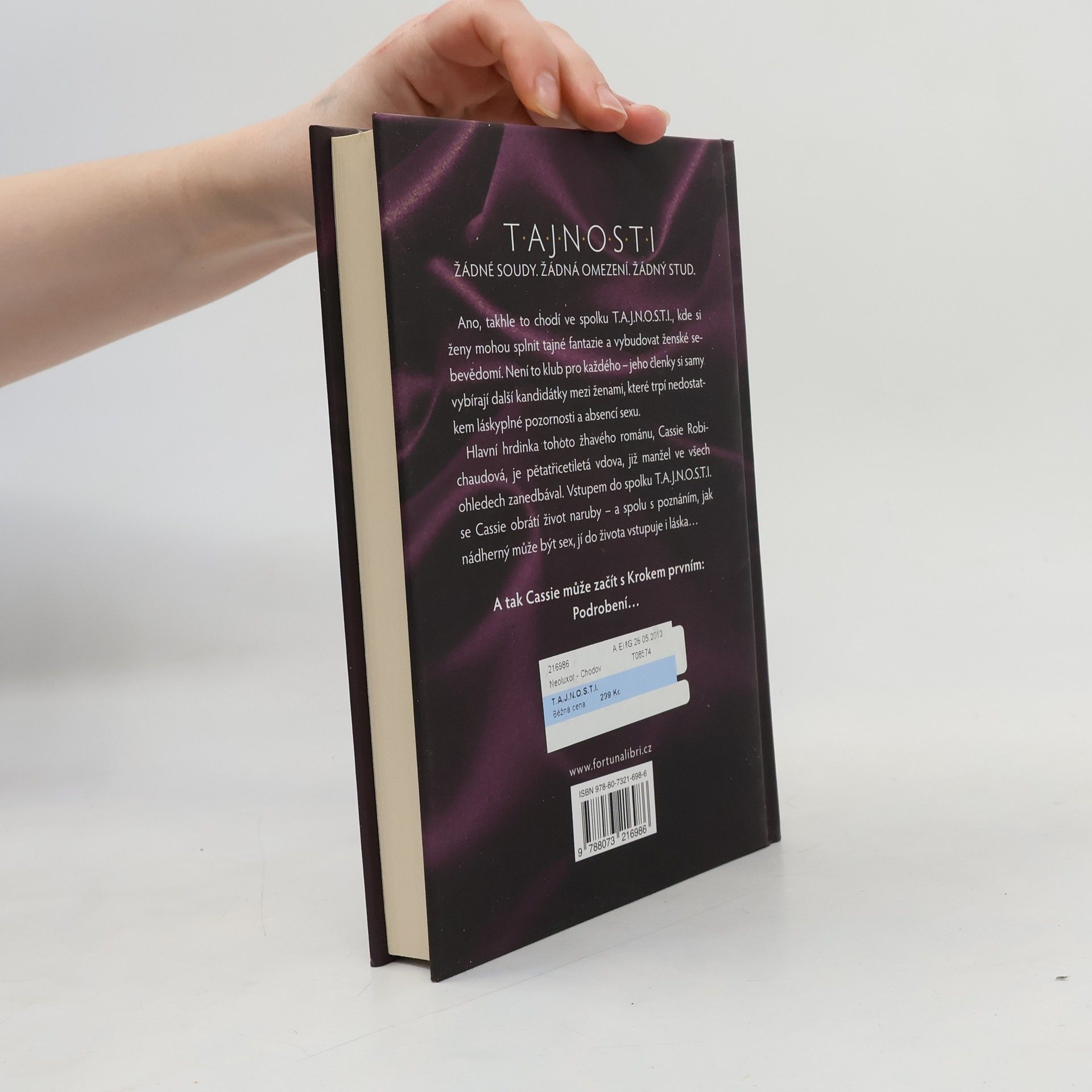 Žádné soudy. Žádná omezení. Žádný stud. Ano, takhle to chodí ve spolku T.A.J.N.O.S.T.I., kde si ženy mohou splnit tajné fantazie a vybudovat ženské sebevědomí. Není to klub pro každého – jeho členky si samy vybírají další kandidátky, mezi těmi, které trpí nedostatkem láskyplné pozornosti a absencí sexu. Hlavní hrdinka tohoto žhavého románu, Cassie Robichaudová, je pětatřicetiletá vdova, již manžel ve všech ohledech zanedbával. Vstupem do spolku T.A.J.N.O.S.T.I. se Cassie obrátí život naruby – spolu s poznáním, jak nádherný může být sex jí do života vstupuje i láska. A tak Cassie může začít s Krokem prvním: Podrobení…