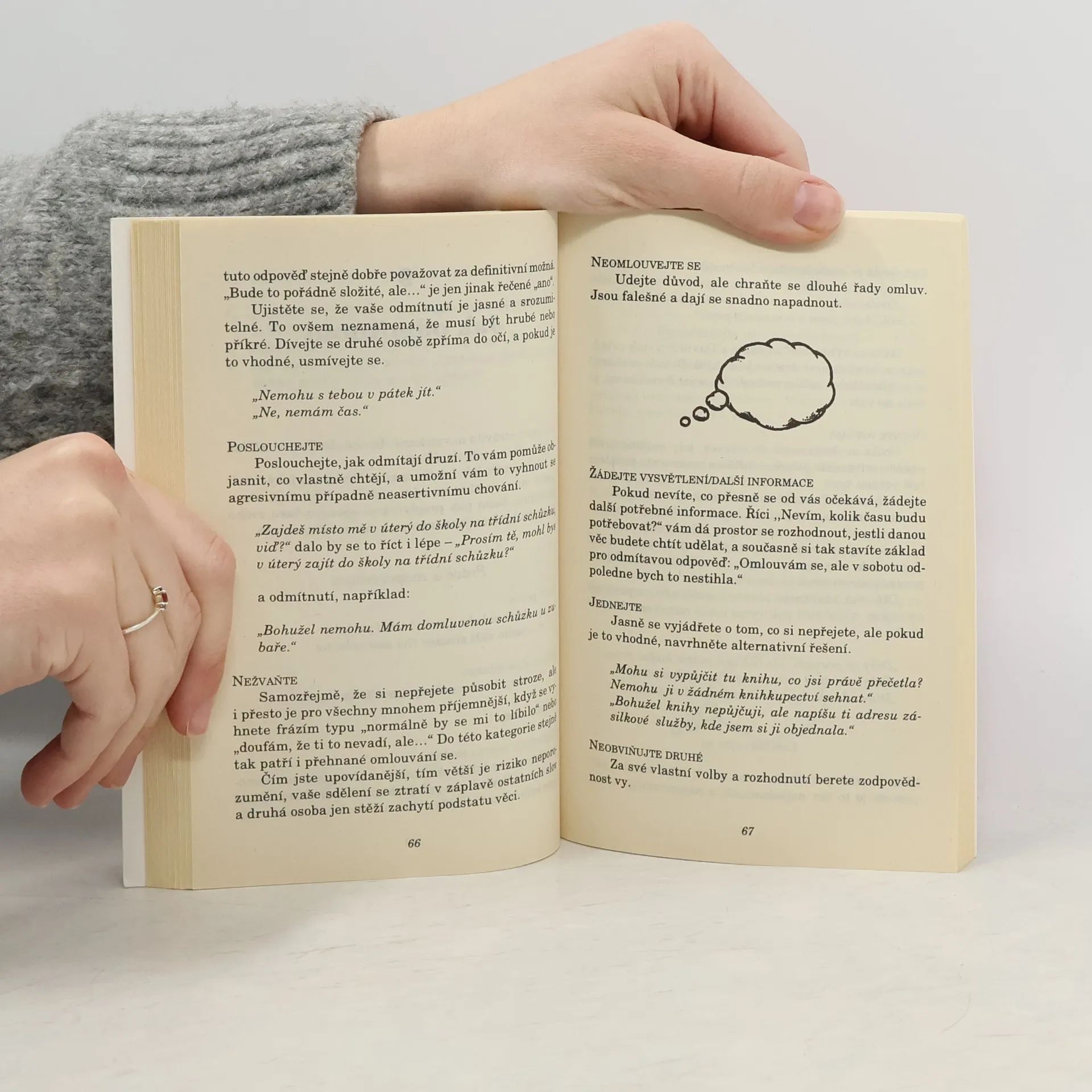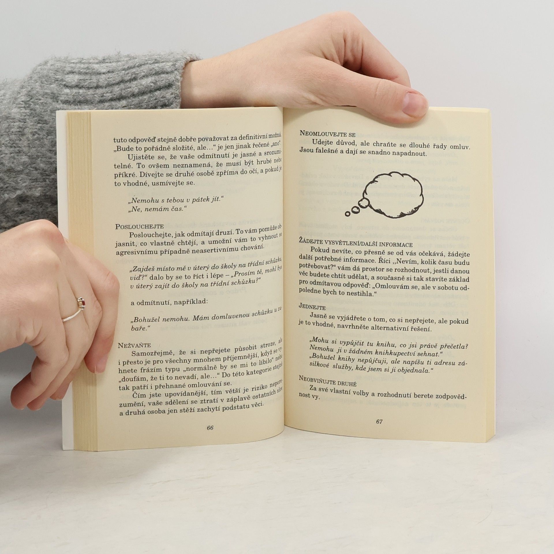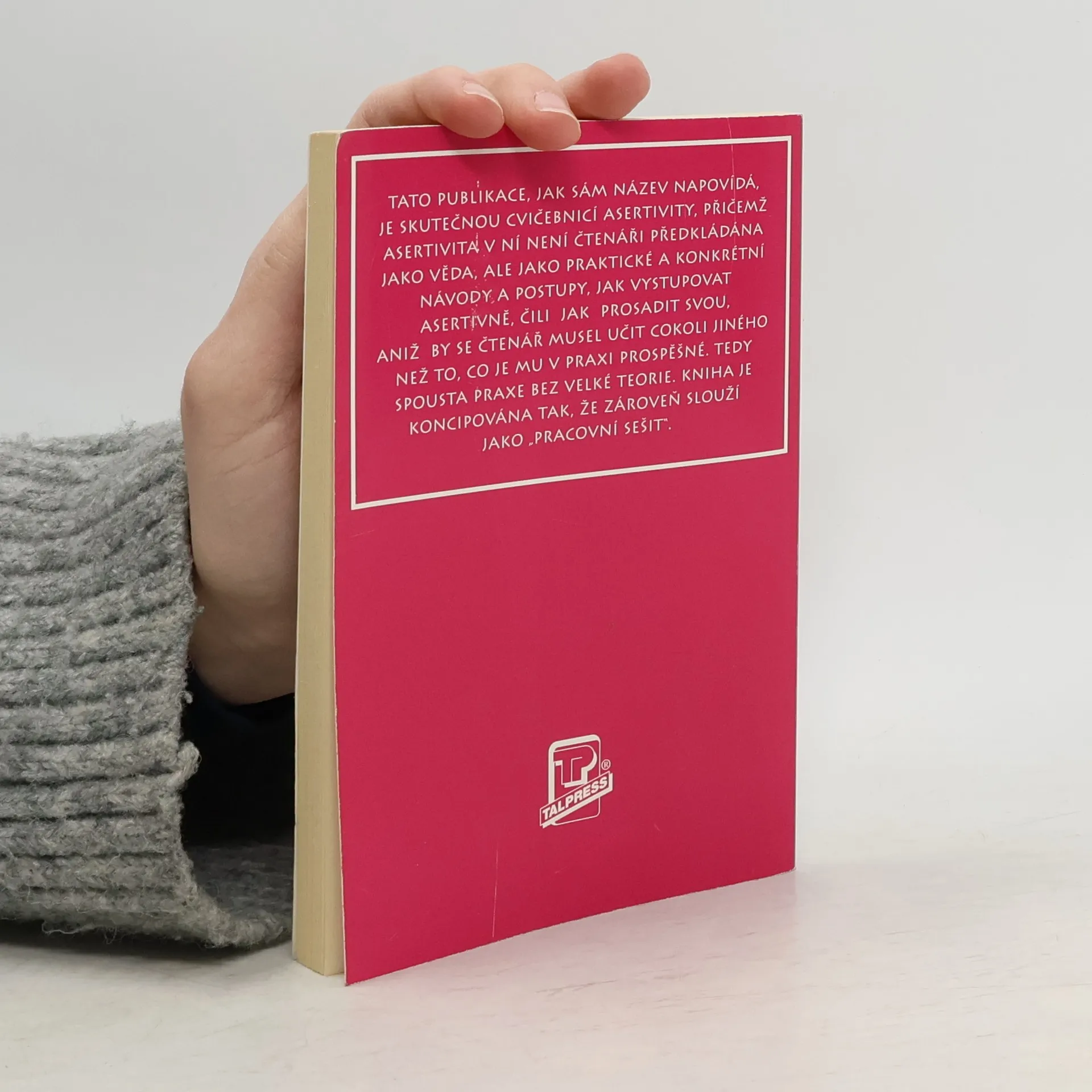 Tato publikace, jak sám název napovídá, je skutečnou cvičebnicí asertivity, přičemž asertivita v ní není čtenáři předkládána jako věda, ale jako praktické a konkrétní návody a postupy, jak vystupovat asertivně, čili jak prosadit svou, aniž by se čtenář musel učit cokoli jiného než to, co je mu v praxi prospěšné. Tedy spousta praxe bez velké teorie. Kniha je koncipována tak, že zároveň slouží jako "pracovní sešit".