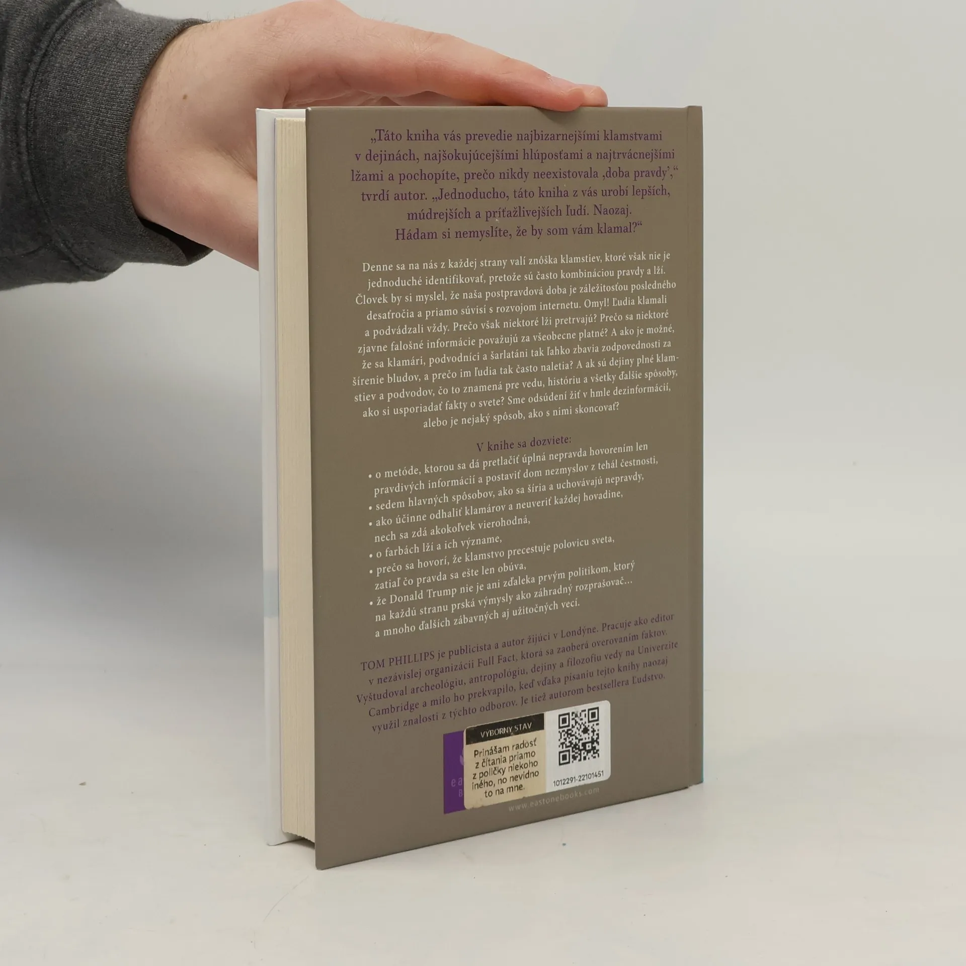 Človek by si myslel, že naša „post-pravdová“ doba je záležitosťou posledného desaťročia a priamo súvisí s rozvojom internetu. Omyl! Ľudia klamali a podvádzali vždy. Prečo však niektoré lži pretrvajú a falošné informácie sa považujú za všeobecne platné? A ak sú dejiny plné klamstiev a podvodov, čo to znamená pre vedu, históriu a všetky ďalšie spôsoby, ako si usporiadať fakty o svete? Sme odsúdení žiť v hmle dezinformácií, alebo je nejaký spôsob, ako s nimi skoncovať? V knihe sa dozviete o metóde, ktorou sa dá pretlačiť úplná nepravda hovorením len pravdivých informácií a postaviť dom nezmyslov z tehál čestnosti, spoznáte sedem hlavných spôsobov, ako sa šíria a uchovávajú nepravdy, ako účinne odhaliť klamárov a neuveriť každej hovadine, nech sa zdá akokoľvek vierohodná, a tiež o tom, že Donald Trump nie je ani zďaleka prvým politikom, ktorý na každú stranu prská výmysly ako záhradný rozprašovač a mnoho ďalších zábavných aj užitočných vecí.