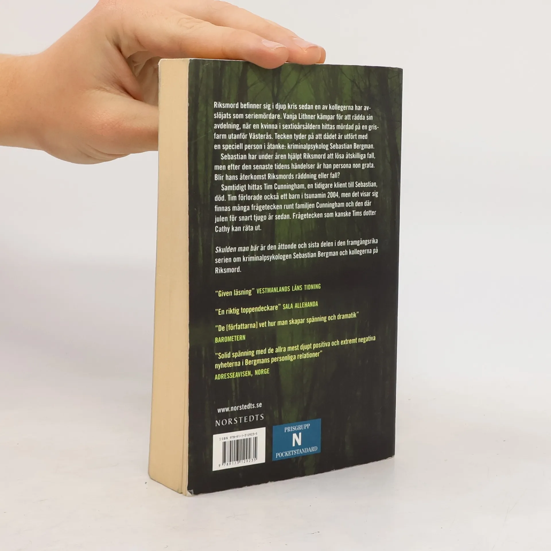 Riksmord befinner sig i djup kris sedan en av kollegerna har avslöjats som seriemördare. Vanja Lithner kämpar för att rädda sin avdelning, när en kvinna i sextioårsåldern hittas mördad på en grisfarm utanför Västerås. Tecken tyder på att dådet är utfört med en speciell person i åtanke: kriminalpsykolog Sebastian Bergman.Sebastian har under åren hjälpt Riksmord att lösa åtskilliga fall, men efter den senaste tidens händelser är han persona non grata. Blir hans återkomst Riksmords räddning eller fall?Samtidigt hittas Tim Cunningham, en tidigare klient till Sebastian, död. Tim förlorade också ett barn i tsunamin 2004, men det visar sig finnas många frågetecken runt familjen Cunningham och den där julen för snart tjugo år sedan. Frågetecken som kanske Tims dotter Cathy kan räta ut.Hjorth & Rosenfeldt tillbaka med den åttonde boken i serien om kriminalpsykologen Sebastian Bergman och poliserna på Riksmord som redan har sålt två miljoner exemplar.[Bokinfo].