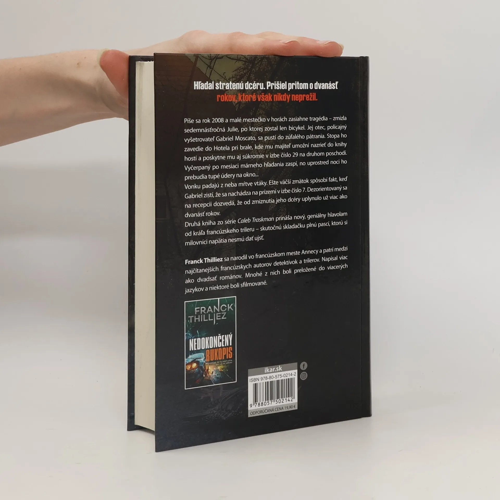 Hľadal stratenú dcéru. Stratil pritom dvanásť rokov, ktoré však nikdy neprežil. Píše sa rok 2008 a malé mestečko v horách zasiahne tragédia – zmizla sedemnásťročná Julie, po ktorej zostal len bicykel. Jej otec, poručík Gabriel Moscato, sa pustí do zúfalého pátrania. Stopa ho zavedie do Hotela pri brale, kde mu majiteľ umožní nazrieť do knihy hostí a zároveň mu ponúkne možnosť medzitým zotrvať v izbe číslo 29 na druhom poschodí. Vyčerpaný po mesiaci márneho hľadania zaspí, no uprostred noci ho prebudia tupé údery na okno... Vonku padajú z neba mŕtve vtáky. Ešte väčší zmätok spôsobí fakt, keď Gabriel zistí, že sa nachádza na prízemí v izbe číslo 7. Dezorientovaný sa na recepcii dozvedá, že od zmiznutia jeho dcéry uplynulo už viac ako dvanásť rokov. Druhá kniha zo série Caleb Traskman prináša nový, geniálny hlavolam od kráľa francúzskeho trileru – skutočnú skladačku plnú pascí, ktorú si milovníci napätia nesmú nechať ujsť.