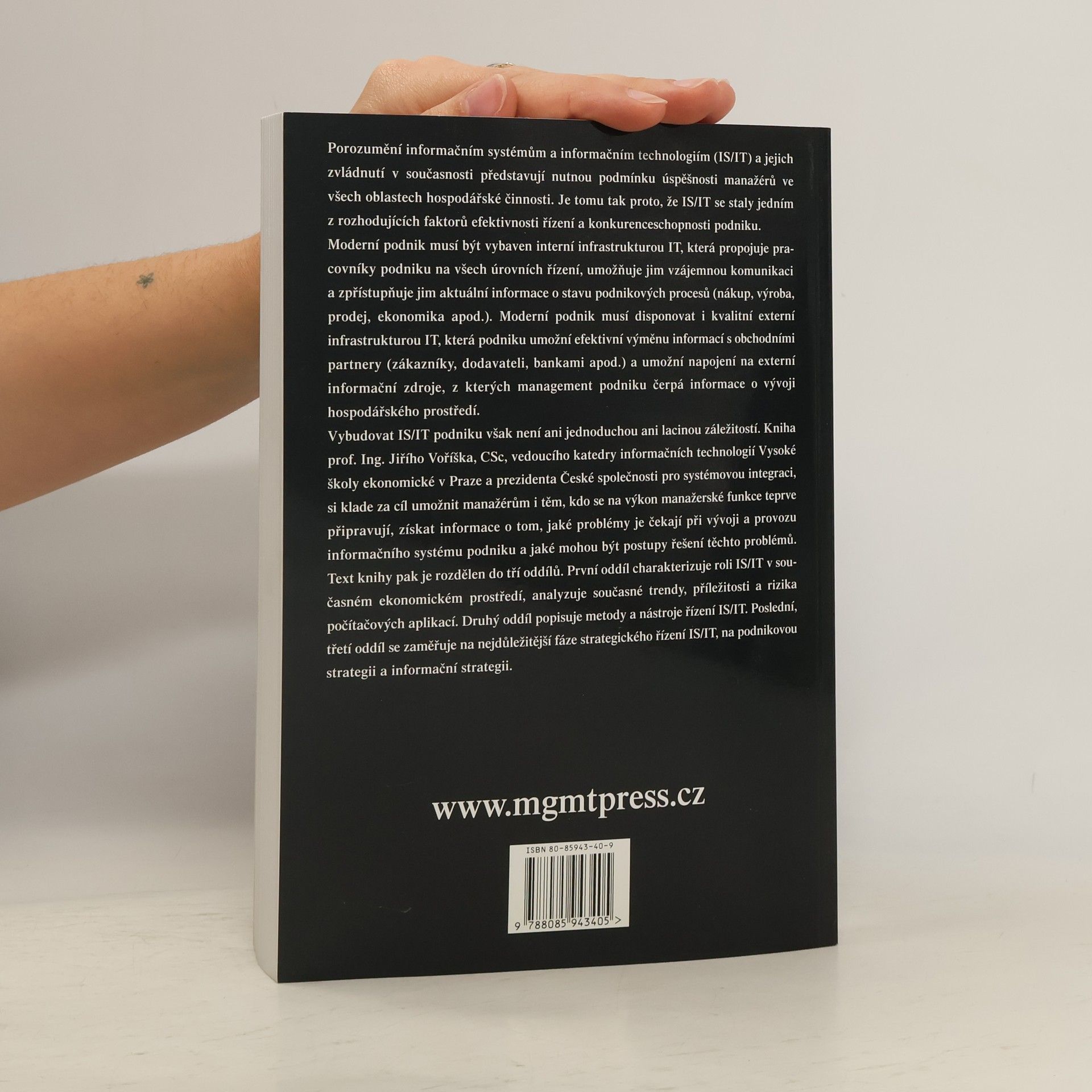 Kniha Jiřího Voříška nabízí moderní a odborně autoritativní pohled na strategické koncipování a praktické zavádění počítačem podporovaných informačních systémů (IS/IT). Jde o zevrubnou příručku, která na českém trhu nemá srovnatelnou náhradu. Autor kombinuje odborné znalosti s pedagogickým přístupem, což činí text zajímavým pro specialisty i neprofesionály, jako jsou manažeři a studenti. V deseti kapitolách shrnuje světově uznávané názory a doporučení pro zavádění a ekonomické využívání IS/IT v hospodářské sféře. Kniha se zaměřuje na manažerskou účelnost a ekonomickou efektivnost integrovaných informačních systémů. Vysvětluje, jak konkurenceschopnost podniků vyžaduje interní infrastrukturu založenou na informačních technologiích a jaké jsou předpoklady pro ekonomické zhodnocení těchto investic. Správně založená informační infrastruktura propojuje interní pracovníky a má klíčový význam pro hodnotu výrobní činnosti. Pomáhá zabezpečit informační potřeby manažerů a jejich spolupracovníků. Autor také spojuje teoretické poznatky s domácími podmínkami a poskytuje cenná doporučení pro propojení IS/IT s podnikatelskou strategií. Publikaci ocení vedoucí pracovníci, informační manažeři, odborníci ze softwarových a konzultačních firem, a také pedagogové a studenti vysokých škol.