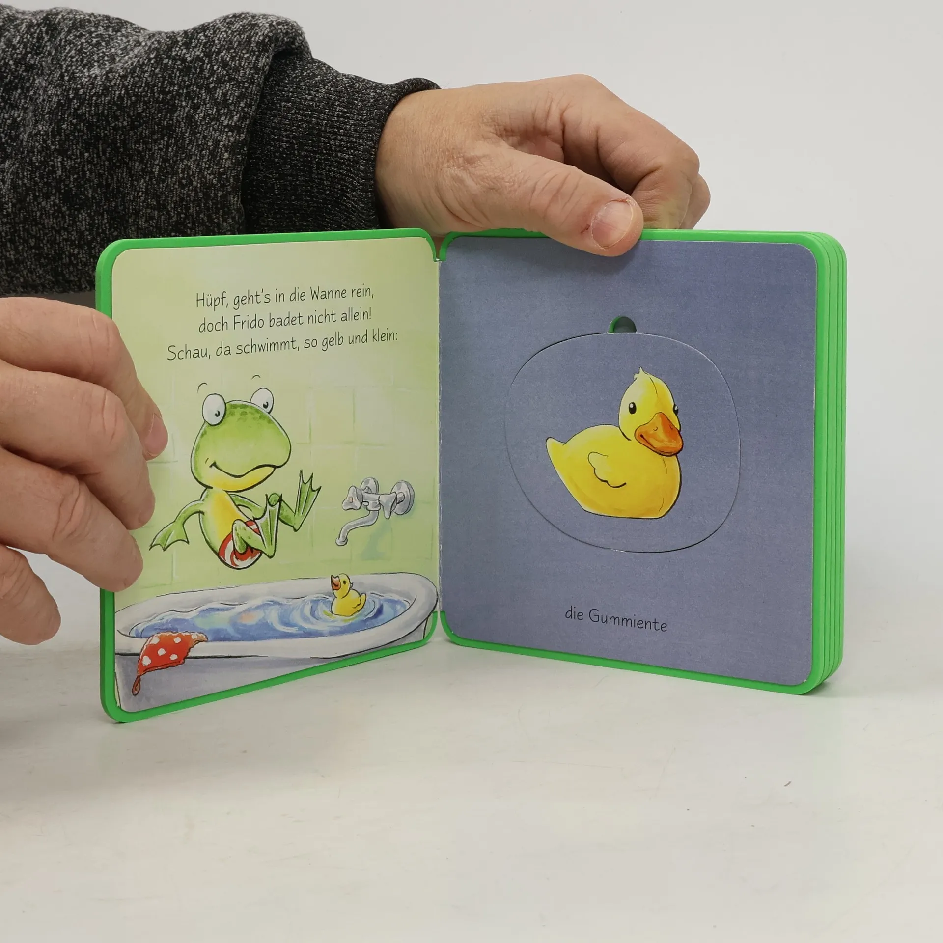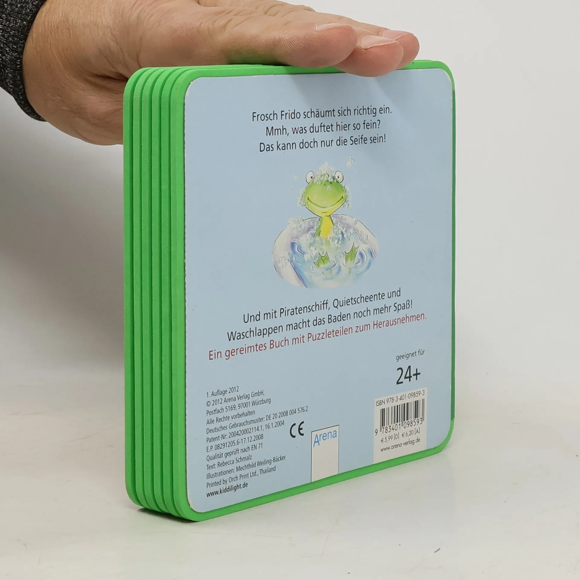 Der kleine Frosch geht baden. Was braucht er alles? Natürlich die Gummiente! Und ein Waschlappen darf auch nicht fehlen. Alle Gegenstände lassen sich als Puzzleteile herausnehmen. Das macht den Allerkleinsten Spaß!