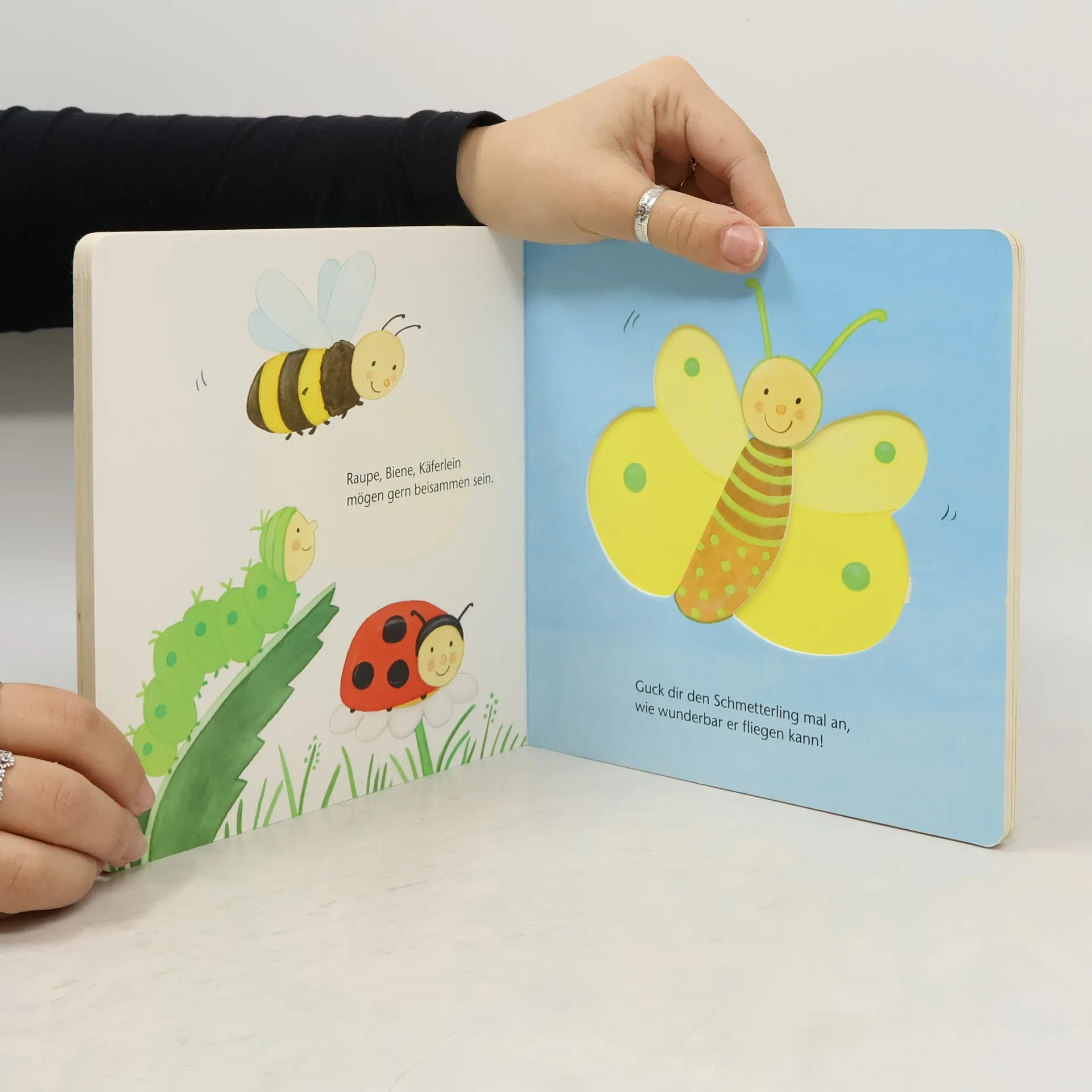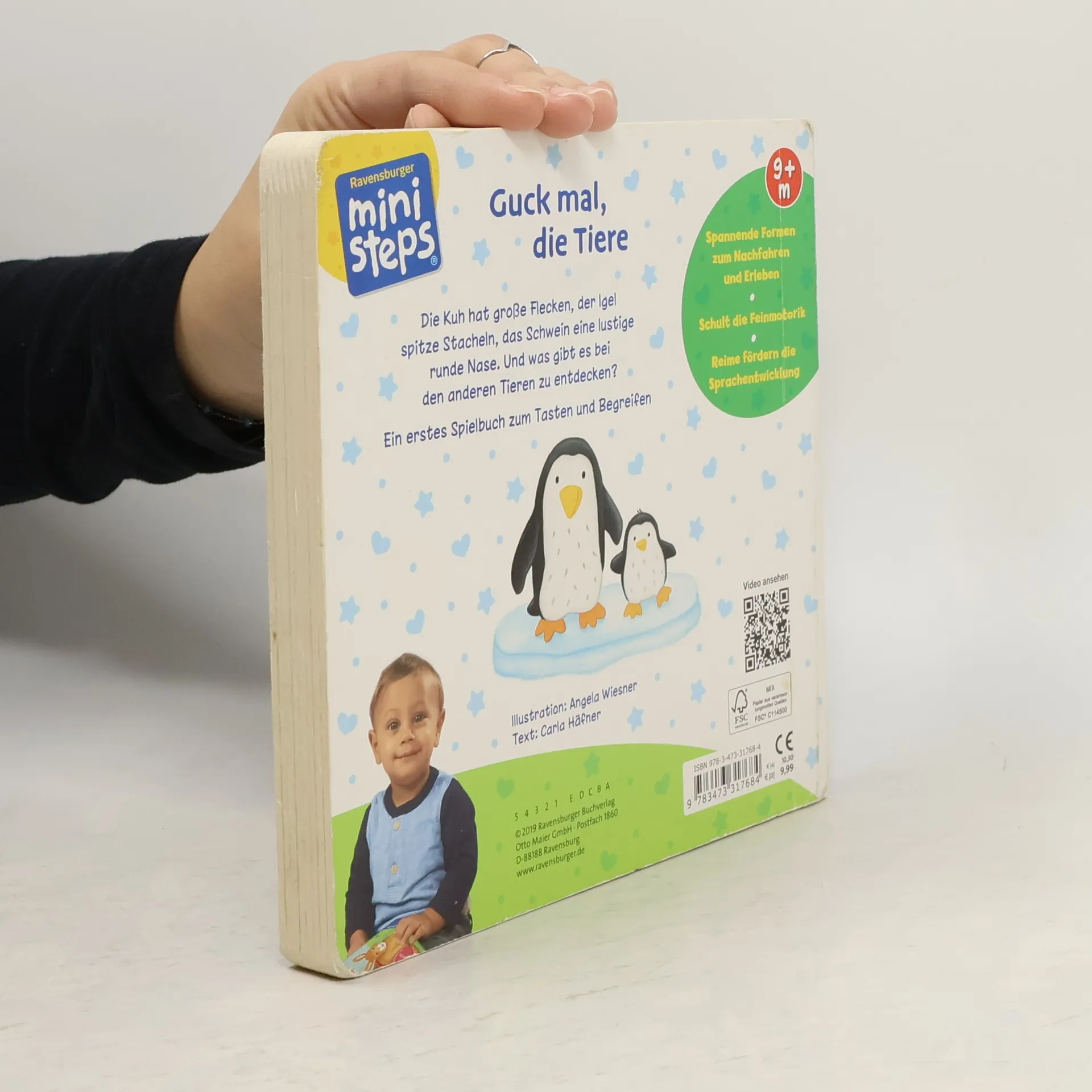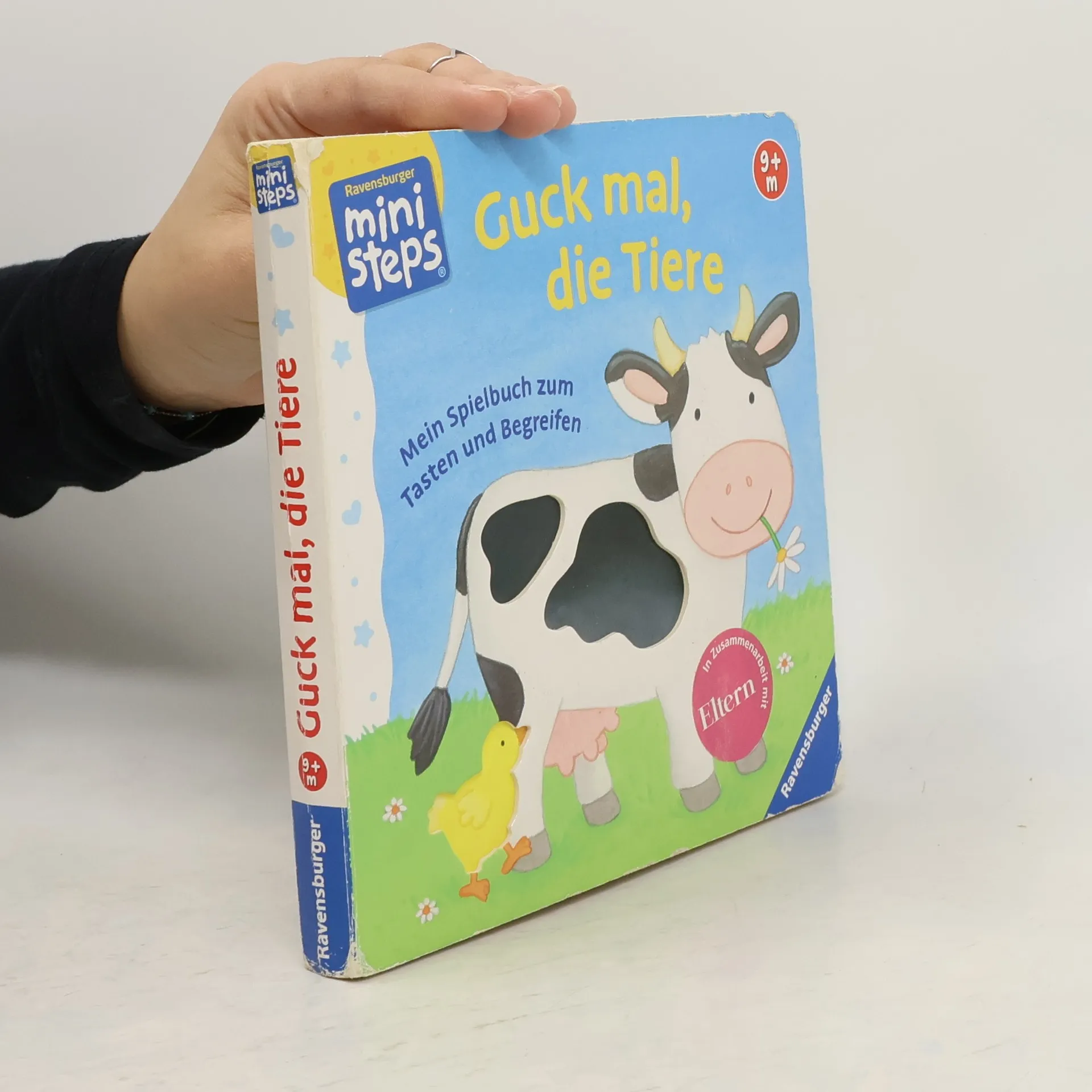 Kennst du schon die Tiere? Die Kuh hat schwarze Flecken. Der Löwe hat eine wuschelige Mähne. Der Elefant hat riesige Ohren. Und der Igel? Der hat spitze Stacheln, die man in diesem Buch sogar ertasten kann. Die plakativen Bilder und kurzen Reime in diesem Buch sind genau auf die Bedürfnisse der Kinder abgestimmt. Auf allen Seiten sind spannende Vertiefungen, die Babys ab 9 Monaten begreifen können: Mit ihren Fingerchen ertasten sie die Besonderheiten der verschiedenen Tiere. Das macht Spaß und fördert ganz nebenbei die Feinmotorik der Kinder. Dieses Spielbuch zum Tasten und Begreifen ist etwas ganz Besonderes für Kleinkinder. Auf jeder Seite werden andere Tiere gezeigt. Aber nicht nur das! Spannende Vertiefungen laden schon die Kleinsten dazu ein, mit ihren Fingern die Besonderheiten der Tiere zu entdecken. Schon auf dem Umschlag des Buches können Kinder ab 9 Monaten die Flecken der Kuh erfühlen oder das kleine gelbe Küken ertasten. Durch Befühlen der Vertiefungen sammeln Kinder spannende Erfahrungen. Was ist rund, was ist eckig? Was ist groß und was klein? Die Mähne des Löwen und die Stacheln des Igels sind stachelig, das Ohr des Elefanten ist riesig. Aber der Wal ist noch viel größer. Und wie fühlt sich die Nase des Schweinchens an? Die haptischen Erlebnisse in diesem Spielbuch helfen Kindern, das Gelernte besser zu verarbeiten und zu behalten.Die abwechslungsreichen Tierbilder werden von kurzen lustigen Reimen begleitet, die noch mehr über die verschiedenen Tiere erzählen. Diese animieren zum genauen Hinsehen und mit der Zeit auch zum Mitsprechen beim gemeinsamen Betrachten der Bilder. „Guck mal, die Tiere“ ist genau auf die Entwicklung von Kleinkindern abgestimmt. Es wurde von Pädagogen entwickelt und fördert Kinder altersgerecht und mit viel Spaß!