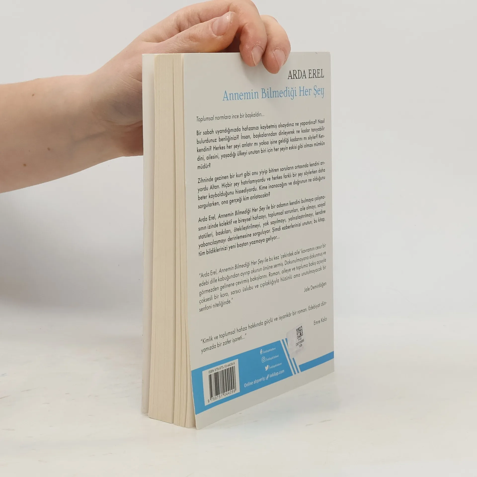 Toplumsal normlara ince bir başkaldırı… Bir sabah uyandığınızda hafızanızı kaybetmiş olsaydınız ne yapardınız? Nasıl bulurdunuz benliğinizi? İnsan, başkalarından dinleyerek ne kadar tanıyabilir kendini? Herkes her şeyi anlatır mı yoksa işine geldiği kadarını mı söyler? Kendini, ailesini, yaşadığı ülkeyi unutan biri için her şeyin eskisi gibi olması mümkün müdür? Zihninde gezinen bir kurt gibi onu yiyip bitiren soruların ortasında kendini arıyordu Altan. Hiçbir şey hatırlamıyordu ve herkes farklı bir şey söylerken daha beter kaybolduğunu hissediyordu. Kime inanacağını ve doğrunun ne olduğunu sorgularken, ona gerçeği kim anlatacaktı? Arda Erel, Annemin Bilmediği Her Şey ile bir adamın kendini bulmaya çalışmasının izinde kolektif ve bireysel hafızayı, toplumsal sorunları, aile olmayı, sosyal statüleri, baskıları, ötekileştirilmeyi, yok sayılmayı, yalnızlaştırılmayı, kendine yabancılaşmayı derinlemesine sorguluyor. Şimdi ezberlerinizi unutun; bu kitap, tüm bildiklerinizi yeni baştan yazmaya geliyor… “Arda Erel, Annemin Bilmediği Her Şey ile bu kez ‘çekirdek aile’ kavramını cesur bir edebi dille kabuğundan ayırıp okurun önüne sermiş. Dokunulmayana dokunmuş ve görmezden gelinene çevirmiş bakışlarını. Roman, aileye ve topluma bakış açısıyla çoksesli bir koro, sarsıcı üslubu ve çıplaklığıyla hüzünlü ama unutulmayacak bir senfoni niteliğinde.” Jale Demirdöğen “Kimlik ve toplumsal hafıza hakkında güçlü ve isyankâr bir roman. Edebiyat dünyamızda bir zafer işareti...” Emre Kalcı