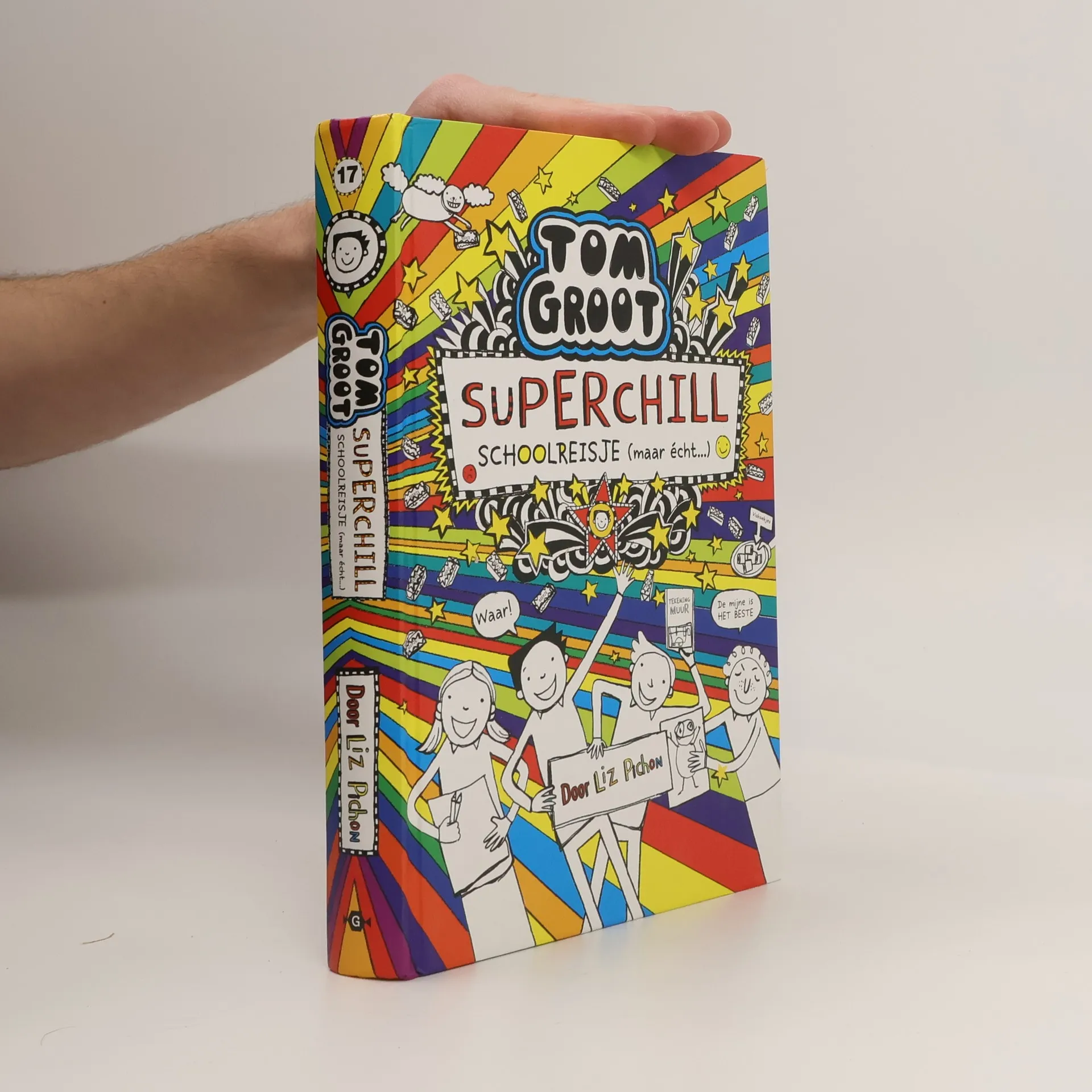 Tom Groot 17 – Superchill schoolreisje (maar écht…) is het 17e deel in de enorm populaire serie van Tom Groot, geschreven door Liz Pichon. Tom doet heel erg zijn best om uit de problemen te blijven, echt… Maar op de een of andere manier heeft hij het voor elkaar gekregen om DRIE(!) verdrietige gezichtjes op zijn rapport te krijgen. Als Tom er nog één verdrietig gezichtje bij krijgt, mag hij van meneer Fullerman niet mee op SCHOOLREIS! Kan het nog erger? Ja, die irritante Marcus maakt alles nog veel erger, om over Toms humeurige zus Delia maar niet te spreken. Misschien kan zijn beste vriend Dirk hem nog redden. Het zou al een stuk schelen als Haan de hond eens ophield met Toms huiswerk opeten! Tom Groot is een enorm populaire serie kinderboeken in de stijl van Het leven van een loser: een dagboek met de grappigste avonturen, geïllustreerd met lollige tekeningetjes. Tom is een dagdromer, een groot striptekenaar en een meester in het verzinnen van smoesjes. Wereldwijd zijn er al meer dan 6,5 miljoen exemplaren verkocht in de serie over de waanzinnige wereld van Tom Groot.