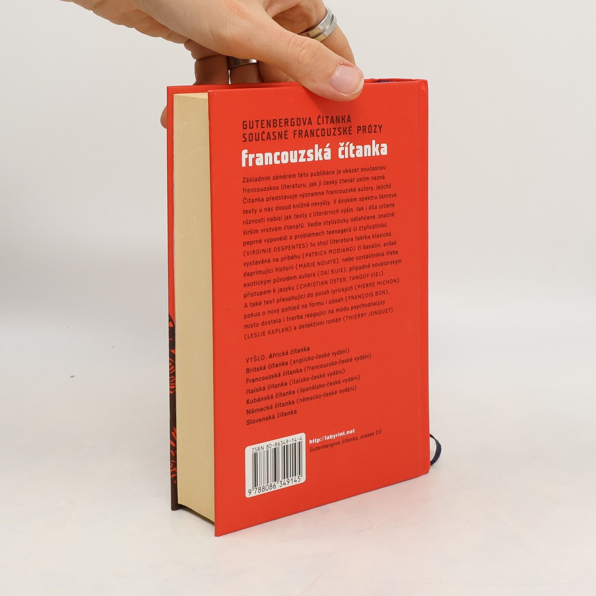 Gutenbergova čítanka současné francouzské prózy. Hlavním záměrem dvojjazyčné publikace je představit rozpětí současné francouzské prózy především ukázkami z děl významných, dosud u nás nepřeložených autorů. Výběr zahrnuje ukázky z díla deseti osobností, jak mladých, tak i známých autorů, jejichž knihy vyšly ve francouzštině v časovém rozmezí let 1994-2004. Editoři se snažili obsáhnout široké spektrum žánrové různorodosti současné francouzské tvorby a tak je v antologii kromě literatury náročné a téměř klasické zastoupena i próza zábavná a oddechová. Publikace, která samozřejmě nemůže být vyčerpávajícím přehledem, je doplněna medailony autorů, medailony překladatelů, bibliografií a komentářem. 1. vyd.