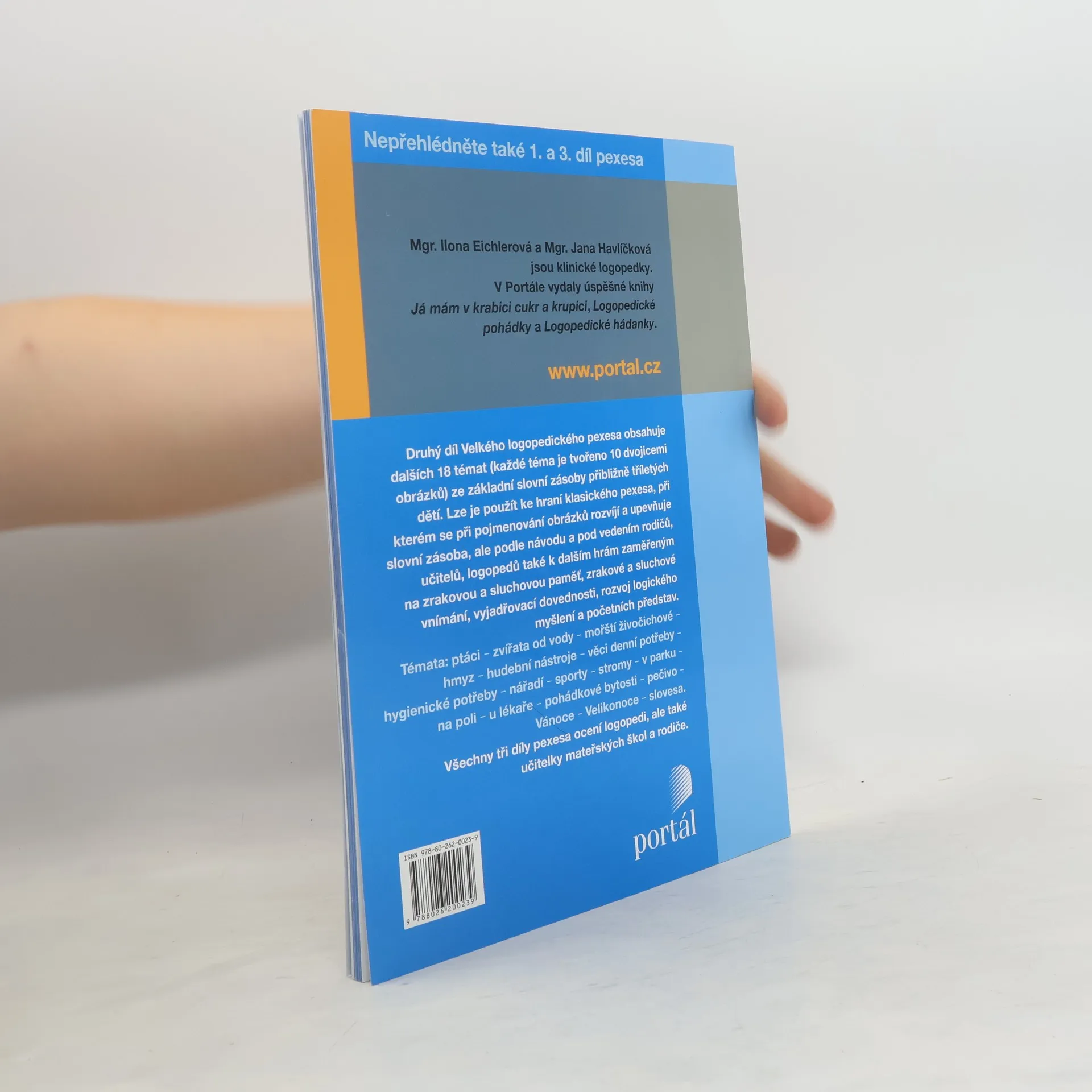 Velké logopedické pexeso obsahuje ve třech dílech 54 témat ze základní slovní zásoby přibližně tříletých dětí. Každé téma je tvořeno 10 dvojicemi obrázků. Lze je použít ke hraní klasického pexesa, při kterém se při pojmenování obrázků rozvíjí a upevňuje slovní zásoba, ale podle návodu a pod vedením rodičů, učitelů či logopedů také k dalším hrám zaměřeným na zrakovou a sluchovou paměť, zrakové a sluchové vnímání, vyjadřovací dovednosti, rozvoj logického myšlení a početních představ. Mezi využitá témata patří domácí zvířata, dopravní prostředky, ovoce, nábytek, oblečení, hudební nástroje, sporty, hmyz, stromy, dopravní značky, počasí, protiklady ad. Knihu ocení logopedi, ale také učitelky mateřských škol. Seznam témat třetího dílu: ovoce, škola, budovy a obydlí, boty, šperky, dopravní značky, přírodní útvary, počasí, plavidla, elektrospotřebiče, sladkosti, povolání, slovesa, zvířecí příbytky, mláďata, předložky, pravo-levá orientace, části domu. Mgr. Ilona Eichlerová a Mgr. Jana Havlíčková jsou klinické logopedky, autorky knihy Já mám v krabici cukr a krupici (Portál, 2009).