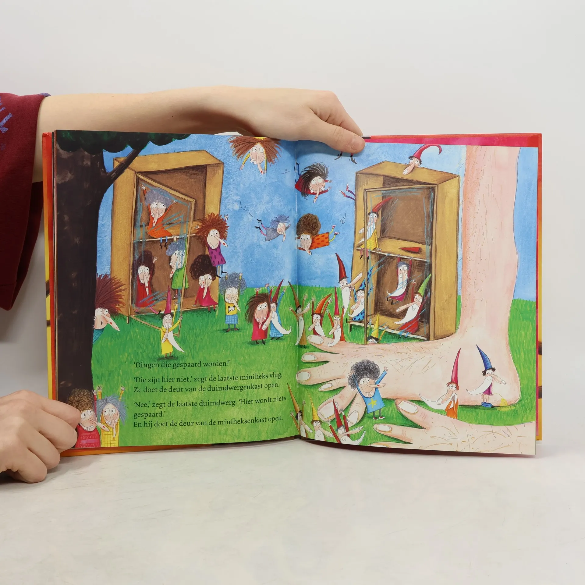 Minhiheksen toveren alles om in iets anders, maar toch verandert er niets en vervelen ze zich. De duimdwergen vervelen zich nooit. En hoe zit het met de rimpelreus? Prentenboek met paginagrote humoristische kleurenillustraties. Vanaf ca. 5 jaar.