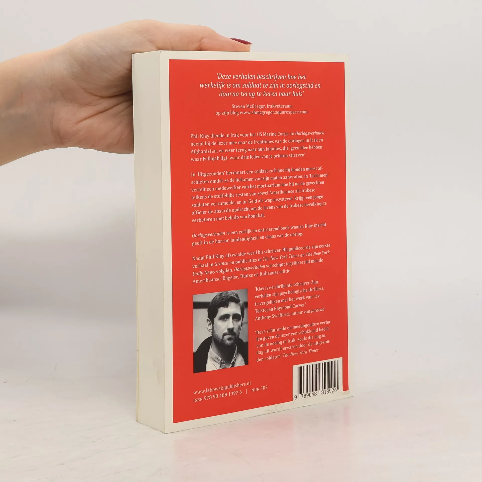 Ex-marinier Phil Klay brengt zijn lezers met Oorlogsverhalen naar de frontlinies van de oorlogen in Irak en Afghanistan, om ons te laten begrijpen wat daar gebeurd is en wat er geworden is van de soldaten die terugkeerden. Thema’s als hoop, schuld, angst en overlevingsdrang zijn nauw verweven in zijn personages, die te midden van alle chaos en verwoesting worstelen met de vraag wat de oorlog voor zin heeft. Phil Klay diende in Irak voor het US Marine Corps. In Oorlogsverhalen neemt hij de lezer mee naar de frontlinies van de oorlogen in Irak en Afghanistan, en weer terug naar hun families, die ‘geen idee hebben waar Fallujah ligt, waar drie leden van je peloton stierven’. In ‘Uitgezonden’ herinnert een soldaat zich hoe hij honden moest afschieten omdat ze de lichamen van zijn maten aanvraten; in ‘Lichamen’ vertelt een medewerker van het mortuarium hoe hij na de gevechten telkens de stoffelijke resten van zowel Amerikaanse als Irakese soldaten verzamelde; en in ‘Geld als wapensysteem’ krijgt een jonge officier de absurde opdracht om de levens van de Irakese bevolking te verbeteren met behulp van honkbal.