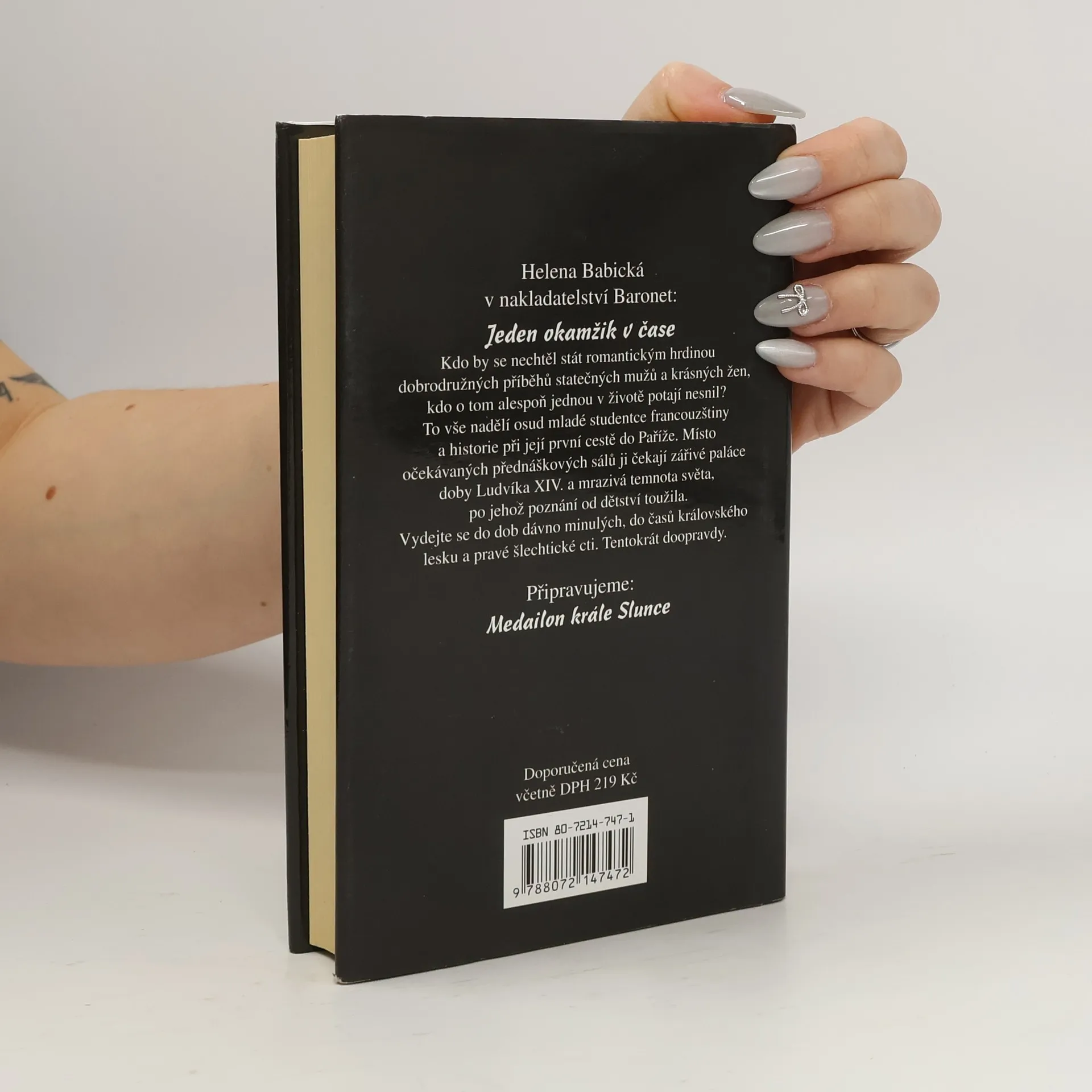 Jaké by to bylo narodit se v dobách dřívějších, uniknou před moderní ale všední realitou, poznat pravé rytířství, hrdinství a čestnost? Kdo by se nechtěl stát romantickým hrdinou dobrodružných příběhů statečných mužů a krásných žen, kdo o tom alespoň někdy potajmu nesnil? To vše nadělí osud mladé studentce francouzštiny a historie při její první cestě do Paříže. Místo očekávaných přednáškových sálů ji čekají paláce doby Ludvíka XIV a doba, po jejímž poznání od dětství snila. Nezůstane však jen vzdálenou pozorovatelkou, je zatažena do probíhajících událostí, dvorských intrik a konfliktů. A potkává i novou lásku, markýze Filipa de Grazac, královského maršálka, muže ztělesňujícího všechny její dívčí sny, muže, který ji k sobě okamžitě připoutá. A tak se nakonec musí hrdinka vydat na dobrodužnou cestu za zmizelým medailonem Krále slunce, který jediný může pomoci jejímu markýzovi v nebezpečí a zachránit čest jeho rodu. Jeden okamžik v čase čtenáři nejen připomene jeho sny o dobrodružství a lásce, ale seznámí jej i s dobovými osobnostmi a událostmi. Pokračování příběhu je připraveno k vydání.