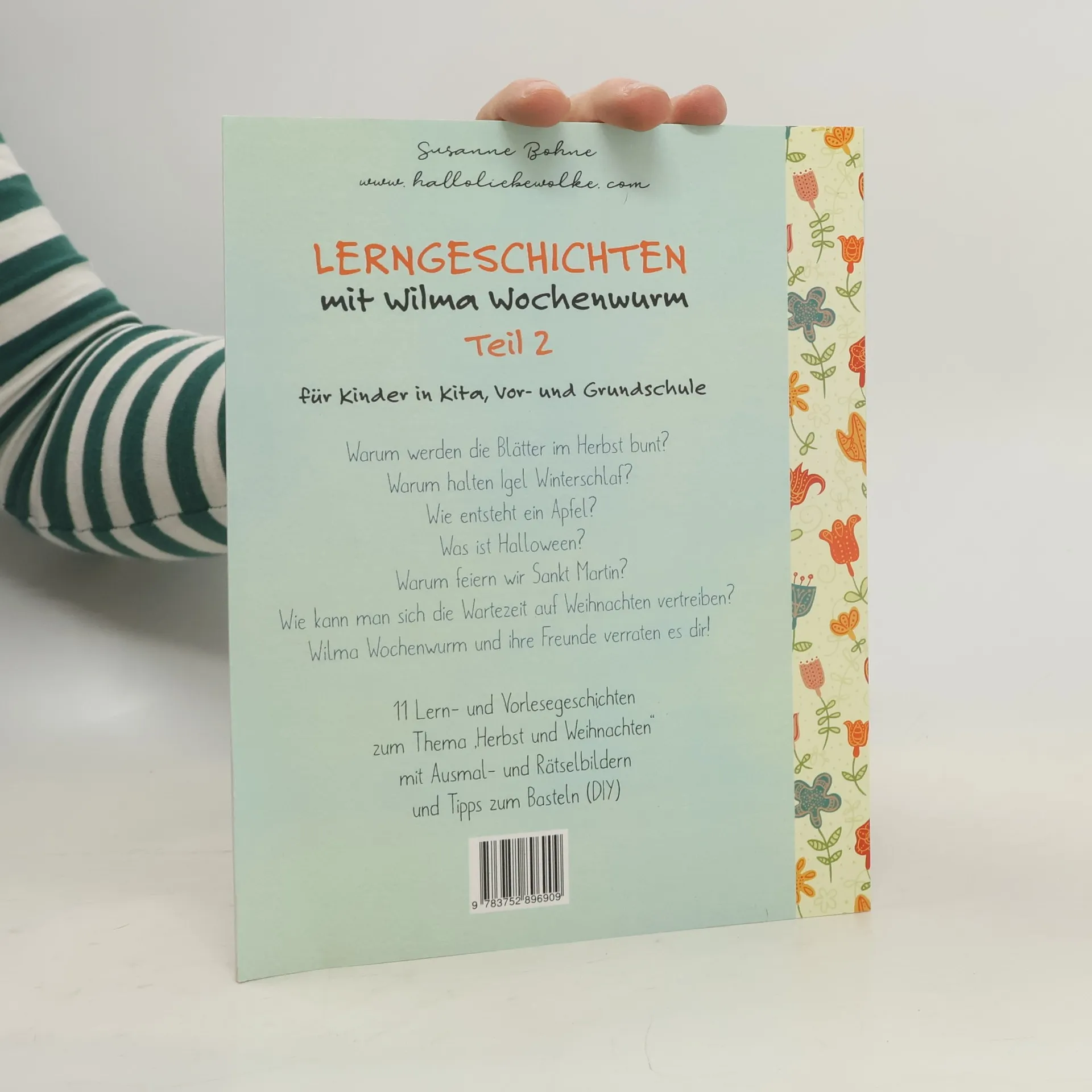 Warum werden die Blätter im Herbst bunt? Warum halten Igel Winterschlaf? Wie entsteht ein Apfel? Was ist Halloween? Warum feiern wir Sankt Martin? Wie kann man sich die Wartezeit auf Weihnachten vertreiben? Wilma Wochenwurm und ihre Freunde verraten es in ihrem Lernheft mit liebevollen Illustrationen und Anregungen. Spielerisch und mit ganz viel Spaß lernen Kinder in Kita, Kindergarten, Vorschule und Grundschule, warum die Blätter im Herbst bunt werden, und was passiert, wenn man einen Apfelkern in die Erde pflanzt. Spannend ist auch, warum wir Halloween und Sankt Martin feiern - und wieso Igel Winterschlaf halten. Mit Pia Pilzwurm kann man durch den Herbstwald spazieren und lernt etwas über giftige Pilze, wie man einen Traumfänger bastelt und Vogelfutter herstellt. Elli Eichhörnchen zeigt, wie man mit Eicheln das Addieren lernen kann - und der kleine Drache Paul, der Angst vor dem Fliegen hatte, lernt, dass man immer an sich glauben muss. Und um die Wartezeit auf Weihnachten zu verkürzen, malt und bastelt man mit Maja viele tolle Dinge. Da wird es Kindern ab 4 Jahren in der Herbst- und Weihnachtszeit sicher nicht langweilig. Inhalt: 11 Lerngeschichten und Vorlesegeschichten mit Ausmal- und Rätselbildern und Tipps zum Basteln (DIY) zum Thema „Herbst und Weihnachten“ Das Lernbuch ist auch für den Einsatz in Kitas und Kindergärten als Lehr- und Spielmaterial konzipiert.