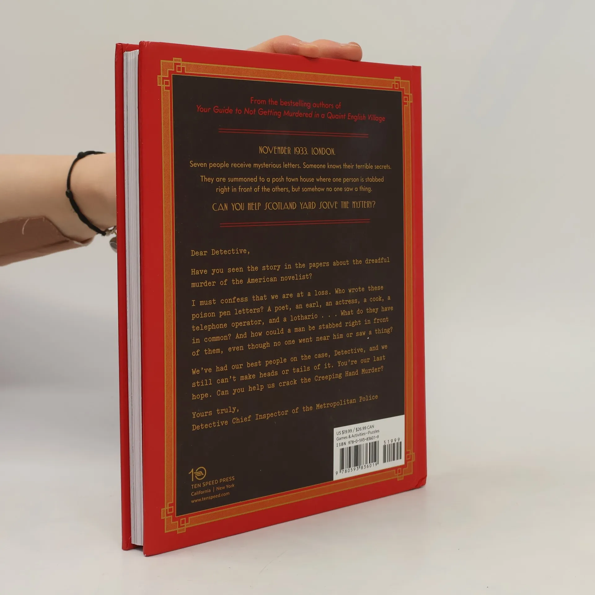 November 1933. London. Seven people receive mysterious letters. Someone knows their terrible secrets. They are summoned to a posh townhouse where one is stabbed right in front of the others, but somehow no one saw a thing. Can you help Scotland Yard solve the mystery? An interactive murder mystery from the bestselling author and illustrator of Your Guide to Not Getting Murdered in a Quaint English Village Dear Detective, Surely you have seen the papers and read about the dreadful murder of the American novelist—stabbed while in a room with six other people, and yet no one went near him or saw the murder occur. The crime is so devious, so logistically impossible, that it seems to have been committed not by a person but by a disembodied hand. I must confess that we are at a loss. Who wrote the poison pen letters that lured these seven people to this deadly gathering? A poet, an earl, an actress, a cook, a telephone operator, and a lothario... What do they have in common? And how could a man be stabbed in a room full of suspects, even though no one went near him or saw a thing? We have had our best people on the case, Detective, and we still can’t make heads or tails of it. We are giving this case file to you. Can you decipher the clues, decode the witness statements, and identify the murderer? You are our last hope. Can you help us crack the Creeping Hand Murder? Yours truly, Detective Chief Inspector of the Metropolitan Police