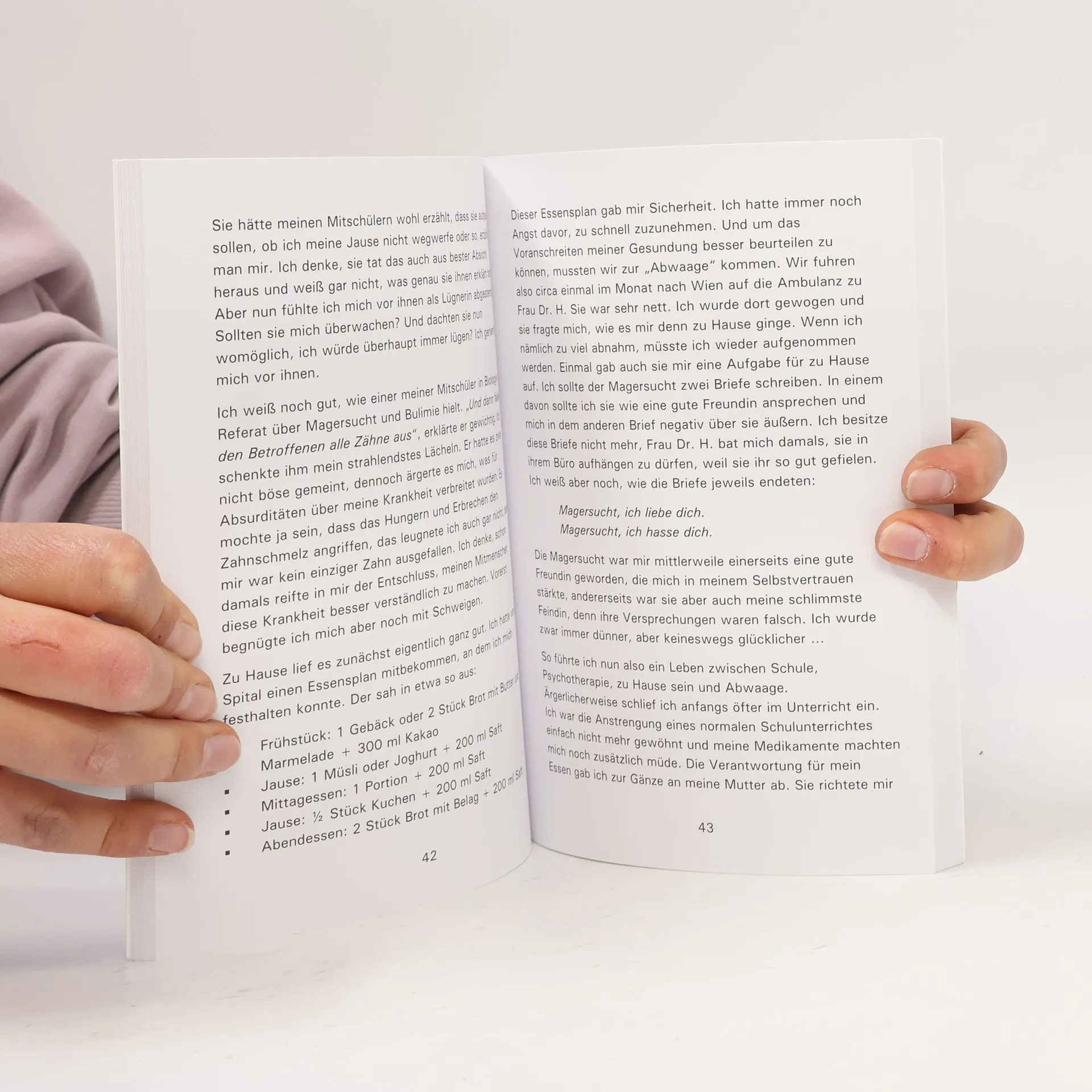 „PSYCHIATRIE stand da in großen Lettern über dem Eingang. Jetzt bringen sie dich also in die Klapse, dachte ich mir. Auch egal. Auf meinen Handgelenken klebten zwei große, weiße Pflaster. Nun konnte also jeder sehen, dass ich versucht hatte, mir die Pulsadern aufzuschneiden. Na ganz toll!...“ „Liebe geht durch den Magen“, heißt es. Aber wo geht Hass hin? Und ist Magersucht vielleicht nur eine Magenverstimmung? Dieses Buch erzählt die wahre Geschichte eines Mädchens, das losging, um seine heile Welt zu retten, mit einem reparierten Herzen zurückkehrte und endlich nach Hause fand.