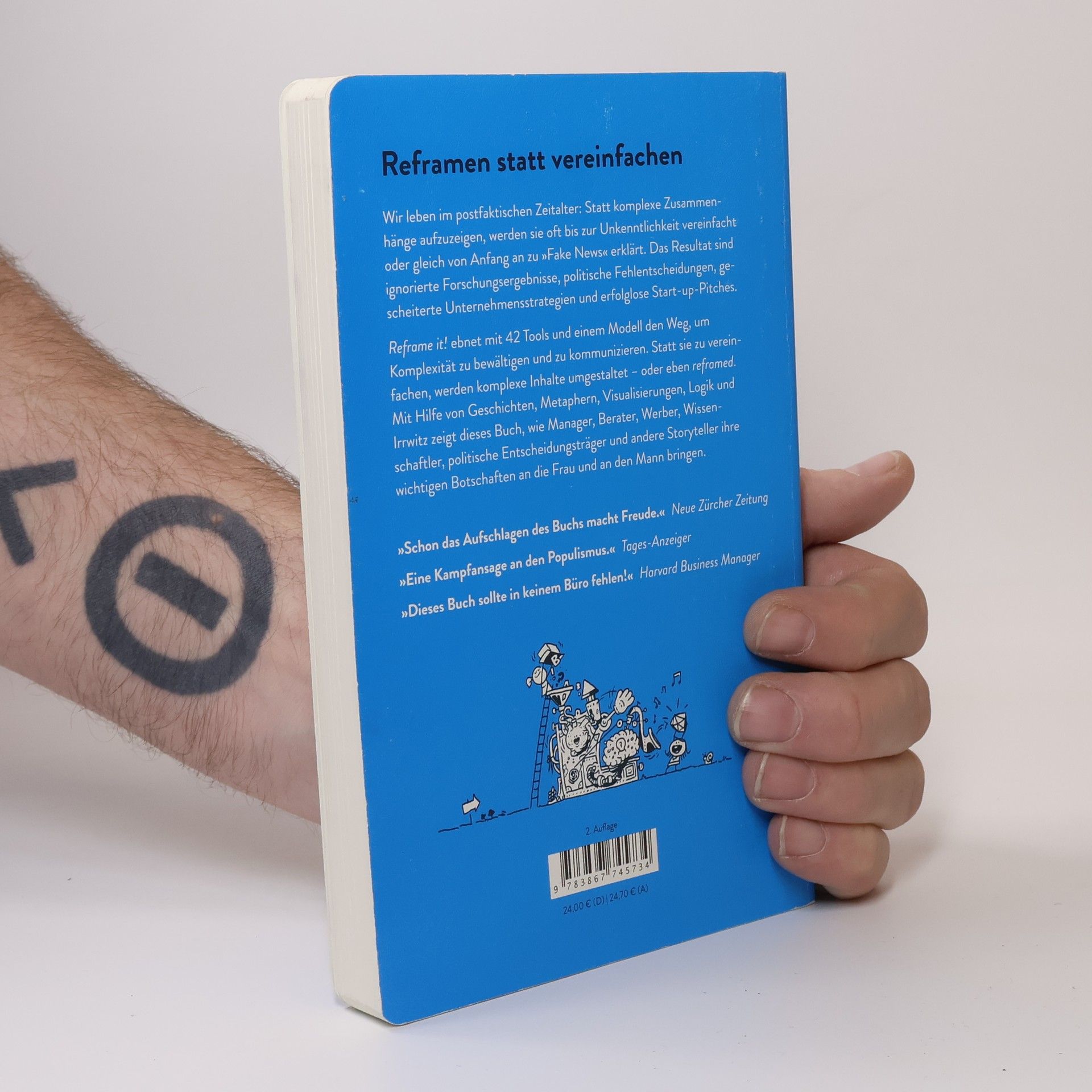 Komplexe Dinge verstehen und vermitteln? Die Lösung: Reframe it! Komplexität überfordert uns. Wenn wir komplexe Dinge verstehen und sie anderen vermitteln wollen, greifen wir deshalb meist zu einem scheinbar bewährten Mittel: Wir vereinfachen sie. Doch das ist keine Lösung, mehr noch ist es ein gefährlicher Weg. Er führt oft zu falschen Rückschlüssen, der Illusion von Sicherheit und fehlender Verankerung in der Realität. Die Welt ist nun einmal komplex! Andri und Gieri Hinnen präsentieren die bessere Methode, um Lösungen für Komplexität zu finden: das Reframing. Damit werden komplexe und komplizierte Inhalte nicht vereinfacht, sondern sorgfältig umgestaltet und neu „gerahmt“. So werden sie leichter verstanden und mit größerem Wohlwollen aufgenommen. Das Besondere: Reframing lässt sich nicht nur anwenden, um anderen komplexe Dinge zu vermitteln. Man kann komplexe Inhalte damit auch selbst besser begreifen. „Reframe it!“ ist ein inspirierendes, ungewöhnlich praxistaugliches und begeisternd gestaltetes Sachbuch. Es enthält in der aktualisierten Neuauflage 47 Tools für das Reframing, die in ein schlüssiges Gesamtmodell eingebettet sind, viele farbige Illustrationen und eine Menge unterhaltsamer und mehr oder weniger fiktiver Fallbeispiele. Denn gutes Reframing ist eine kreative und fröhliche Methode. Aktualisierte Neuauflage mit fünf neuen Tools!
