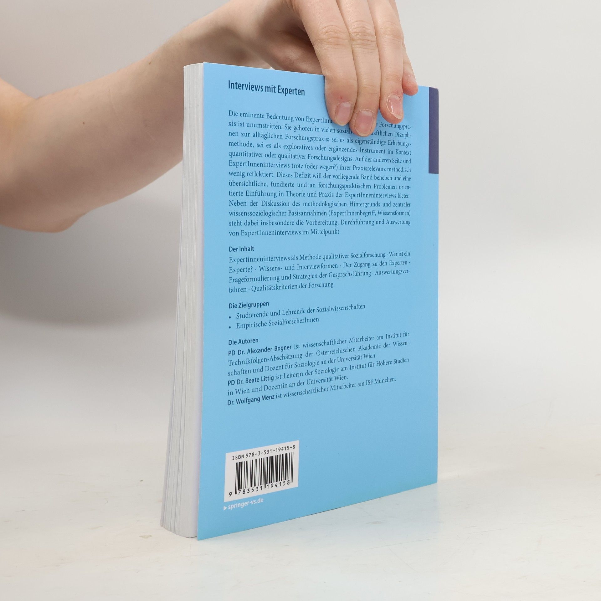 Die eminente Bedeutung von ExpertInneninterviews für die Forschungspraxis ist unumstritten. Sie gehören in vielen sozialwissenschaftlichen Disziplinen zur alltäglichen Forschungspraxis; sei es als eigenständige Erhebungsmethode, sei es als exploratives oder ergänzendes Instrument im Kontext quantitativer oder qualitativer Forschungsdesigns. Auf der anderen Seite sind ExpertInneninterviews trotz (oder wegen?) ihrer Praxisrelevanz methodisch wenig reflektiert. Dieses Defizit will der vorliegende Band beheben und eine übersichtliche, fundierte und an forschungspraktischen Problemen orientierte Einführung in Theorie und Praxis der ExpertInneninterviews bieten. Neben der Diskussion des methodologischen Hintergrunds und zentraler wissenssoziologischer Basisannahmen (ExpertInnenbegriff, Wissensformen) steht dabei insbesondere die Vorbereitung, Durchführung und Auswertung von ExpertInneninterviews im Mittelpunkt.