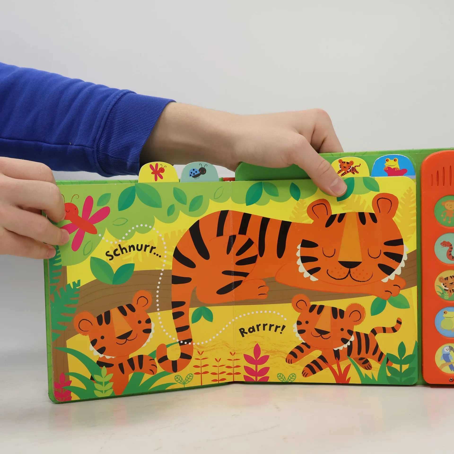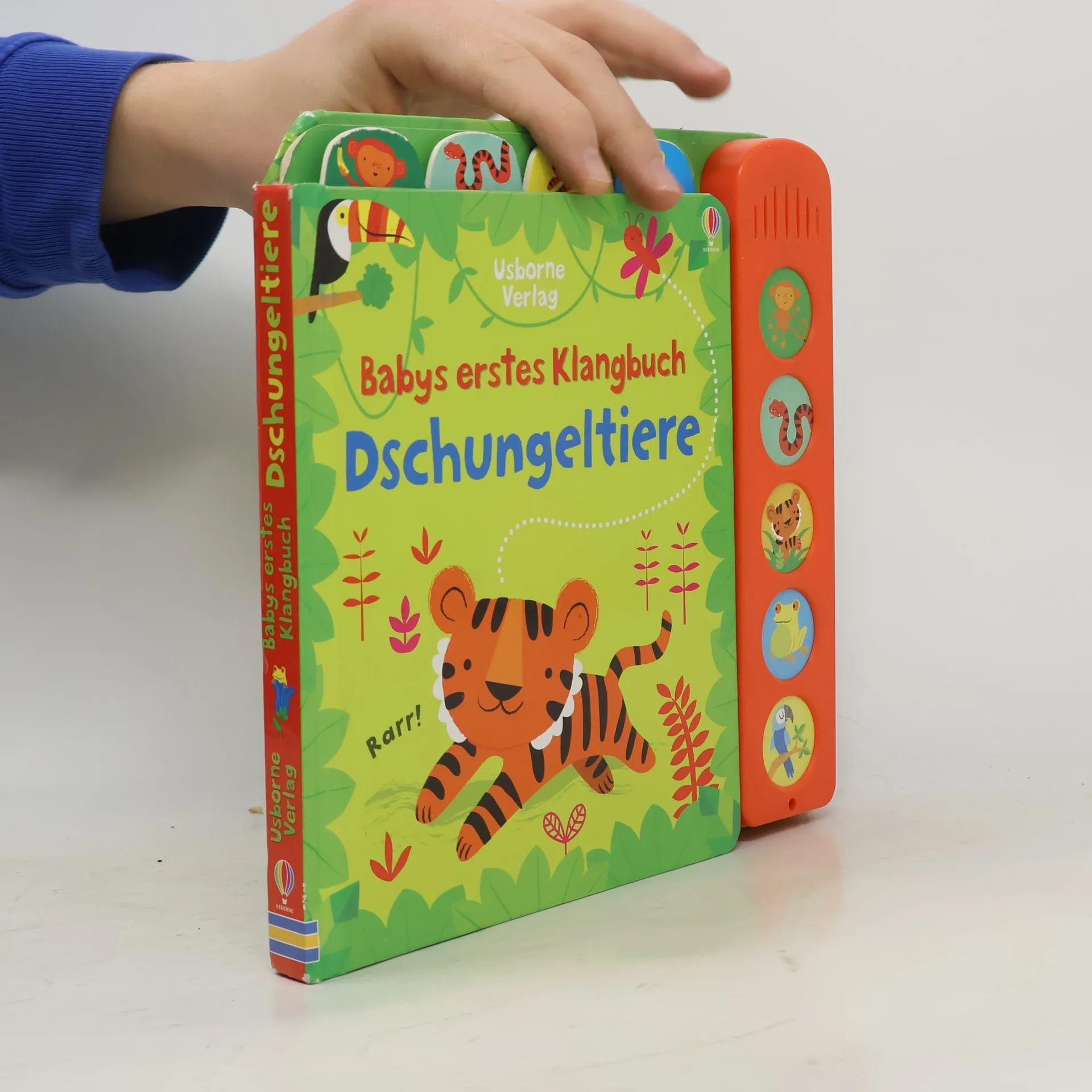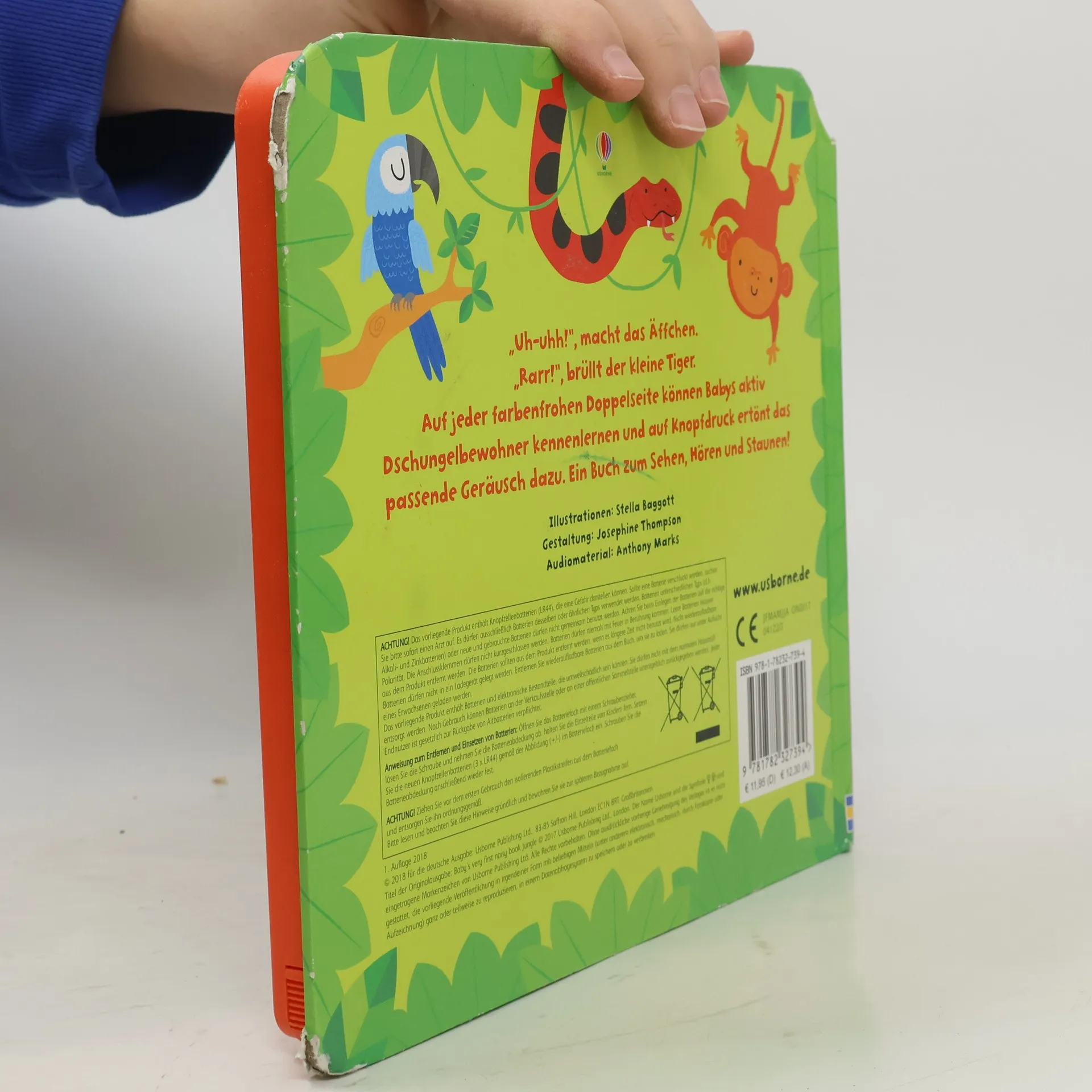 „Uh-uhh!“, macht das Äffchen. „Rarr!“, brüllt der kleine Tiger. Auf jeder farbenfrohen Doppelseite können Babys aktiv Dschungelbewohner kennenlernen und auf Knopfdruck ertönt das passende Geräusch dazu. Ein Buch zum Sehen, Hören und Staunen!