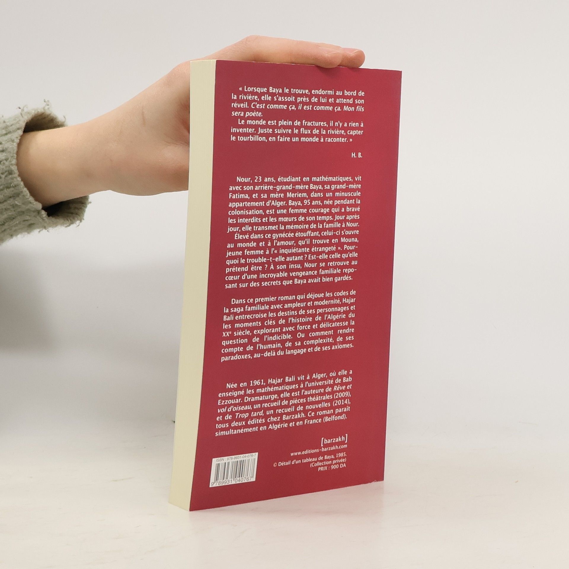 Nour, 23 ans, étudiant en mathématiques, vit avec son arrière-grand-mère, Baya, sa grand-mère, Fatima, et sa mère, Meriem, dans un minuscule appartement d'Alger. Baya, 95 ans, née pendant la colonisation, est une femme courage qui a bravé les interdits et les mœurs de son temps. Jour après jour, elle transmet la mémoire de la famille à Nour. Élevé dans ce gynécée étouffant, celui-ci s'ouvre au monde et à l'amour, qu'il trouve en Mouna, jeune femme à l'" inquiétante étrangeté ". Pourquoi le trouble-t-elle autant ? Est-elle celle qu'elle prétend être ? À son insu, Nour va se retrouver au cœur d'une incroyable vengeance familiale reposant sur des secrets que Baya avait bien gardés. Dans ce premier roman qui déjoue les codes de la saga familiale avec ampleur et modernité, Hajar Bali entrecroise les destins de ses personnages et les moments clés de l'histoire de l'Algérie du xxe siècle, explorant avec force et délicatesse la question de l'indicible. Ou comment rendre compte de l'humain, de sa complexité, de ses paradoxes, au-delà du langage et de ses axiomes.