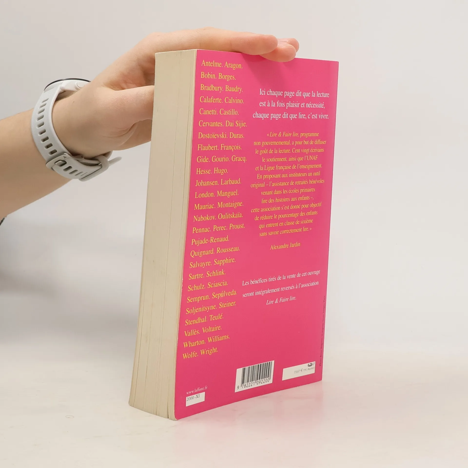 Ici chaque page dit que la lecture est à la fois plaisir et nécessité, chaque page dit que lire, c'est vivre. " Lire & Faire lire, programme non gouvernemental, a pour but de diffuser le goût de la lecture. Cent vingt écrivains le soutiennent, ainsi que l'UNAF et la Ligue française de l'enseignement. En proposant aux instituteurs un outil original - l'assistance de retraités bénévoles venant dans les écoles primaires lire des histoires aux enfants - cette association s'est donné pour objectif de réduire le pourcentage des enfants qui entrent en classe de sixième sans savoir correctement lire. " Alexandre Jardin Les bénéfices tirés de la vente de cet ouvrage seront intégralement reversés à l'association Lire & Faire lire.