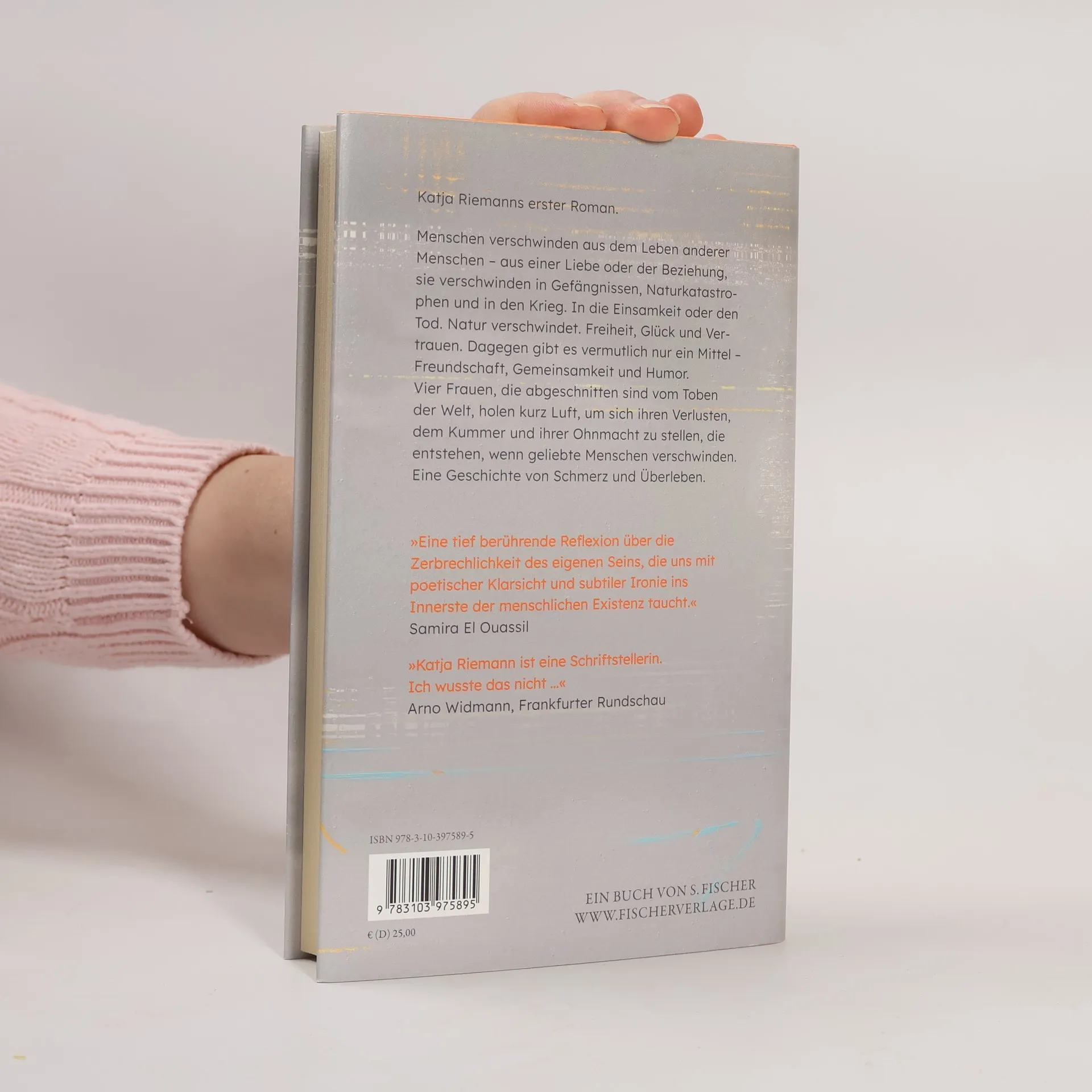 Die Musikerin Johaenne steht auf ihrem Fenstersims im fünften Stock, und der Friedhof ist praktischerweise nebenan. Der Mann, den sie unbändig geliebt hat, ist aus ihrem Leben verschwunden, die Liebe zu ihm jedoch ist geblieben. Was nun?! Es ist Nacht, nur der Mond kann sie sehen, und er hat Fragen. Johaenne begreift, dass sie keine Selbstmörderin ist, und setzt tastend ihre Schritte in ein neues Leben. Doch die Welt ist aus den Fugen: Ein Nebel bedeckt die halbe Welt, Feuersbrünste und Heuschreckenschwärme wüten. Aus der Stadt flieht Johaenne aufs Land, in den Bungalow ihres verstorbenen Vaters. Hinzu stoßen ihre neuen Freundinnen Jamal und Shenmi, die Pianistin Ayo und ein kleiner Hund. Bedrohlich wirkt das Nachbarhaus, und kann der Nebel wirklich Dinge und Lebewesen für immer verschlucken? Bald sind die Frauen abgeschnitten von allen Informationen über die Außenwelt. Während der Nebel das Haus umhüllt, klären die vier Frauen für sich die Verhältnisse. In einer Welt, in der alles verschwindet, leben sie Solidarität und Liebe. Und Johaenne erkennt, dass sie sich erlauben muss, glücklich zu sein. »Nebel und Feuer« ist Katja Riemanns erster Roman.