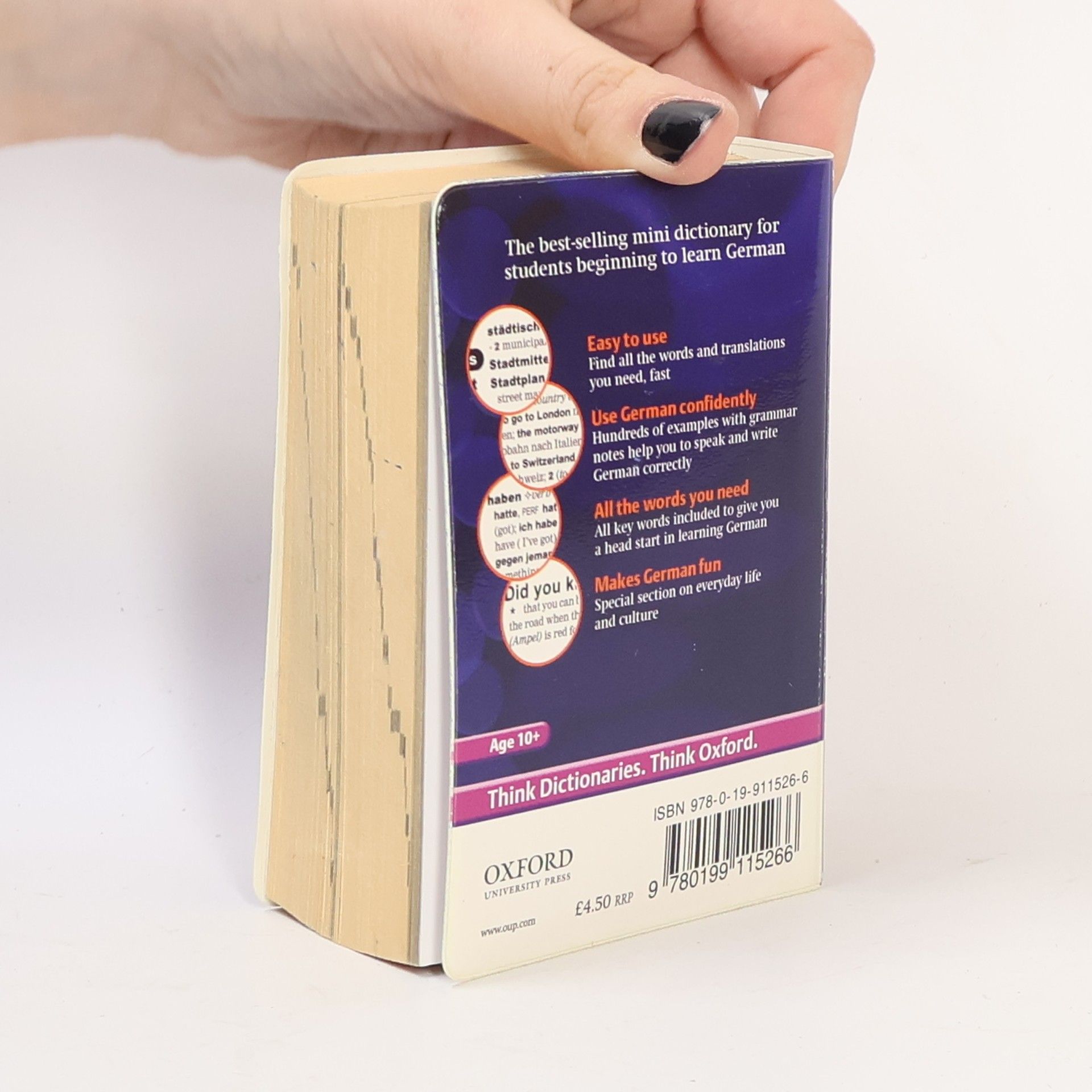 The Oxford Mini School German Dictionary is the perfect bilingual dictionary for pupils learning German. The two sides of the dictionary are clearly divided into German-English and English-German, with an essential verb table list in the centre. The headwords are carefully selected to suitbeginners, and particular attention is given to computing, word-processing, and ICT terms. In line with syllabus requirements, there is a special section dedicated to vocabulary and phrases on German life and culture. The simple layout, the alphabet down the side of each page, and the large clearprint will help pupils navigate around the dictionary and take them straight to the translation they are looking for. This dictionary comes in a handy mini-size format with a durable vinyl cover.
