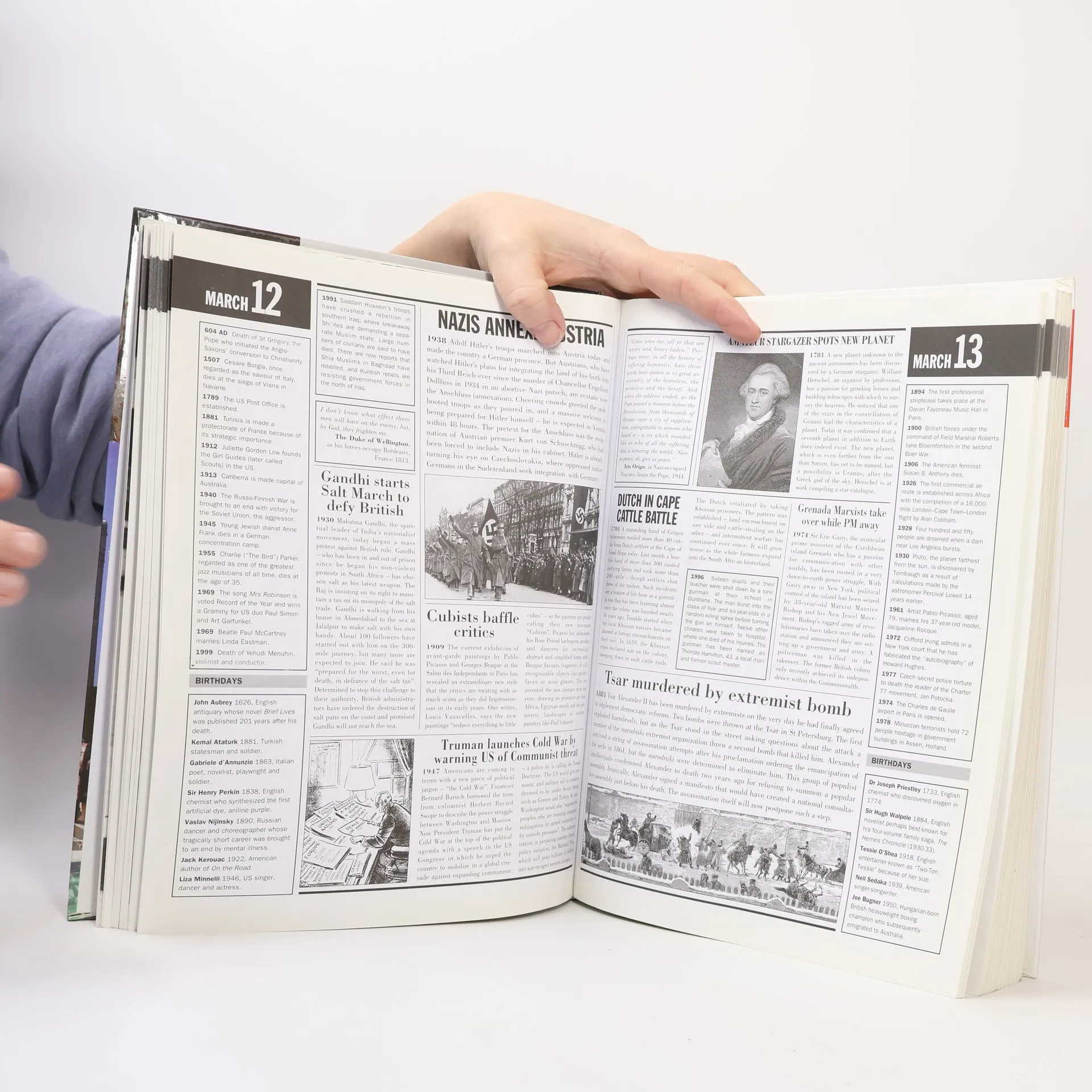 Covers the major events of world history for each day of the year. Newspaper-style articles, many of them illustrated, cover all the main news stories of the day in a lively, on-the-spot way from Julius Caesar to Mikhail Gorbachev, from the discovery of gravity to the first landing on the moon. Also included for each day are extracts from diaries, letters and speeches, amusing events and trivia, a news-in-brief column and lists of birthdays of the famous.