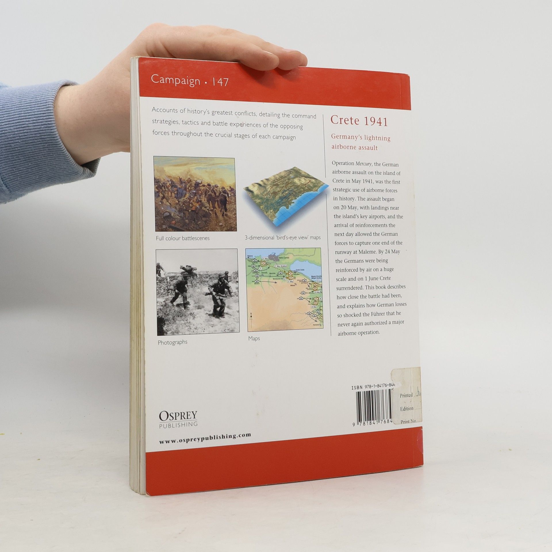Osprey's study of Operation Mercury, the German airborne assault on the island of Crete in May 1941 during World War II (1939-1945), which was the first strategic use of airborne forces in history. The assault began on 20 May, with landings near the island's key airports, and reinforcements the next day allowed the German forces to capture one end of the runway at Maleme. By 24 May, the Germans were being reinforced by air on a huge scale and on 1 June Crete surrendered. This book describes how desperately close the battle had been and explains how German losses so shocked the Führer that he never again authorised a major airborne operation.