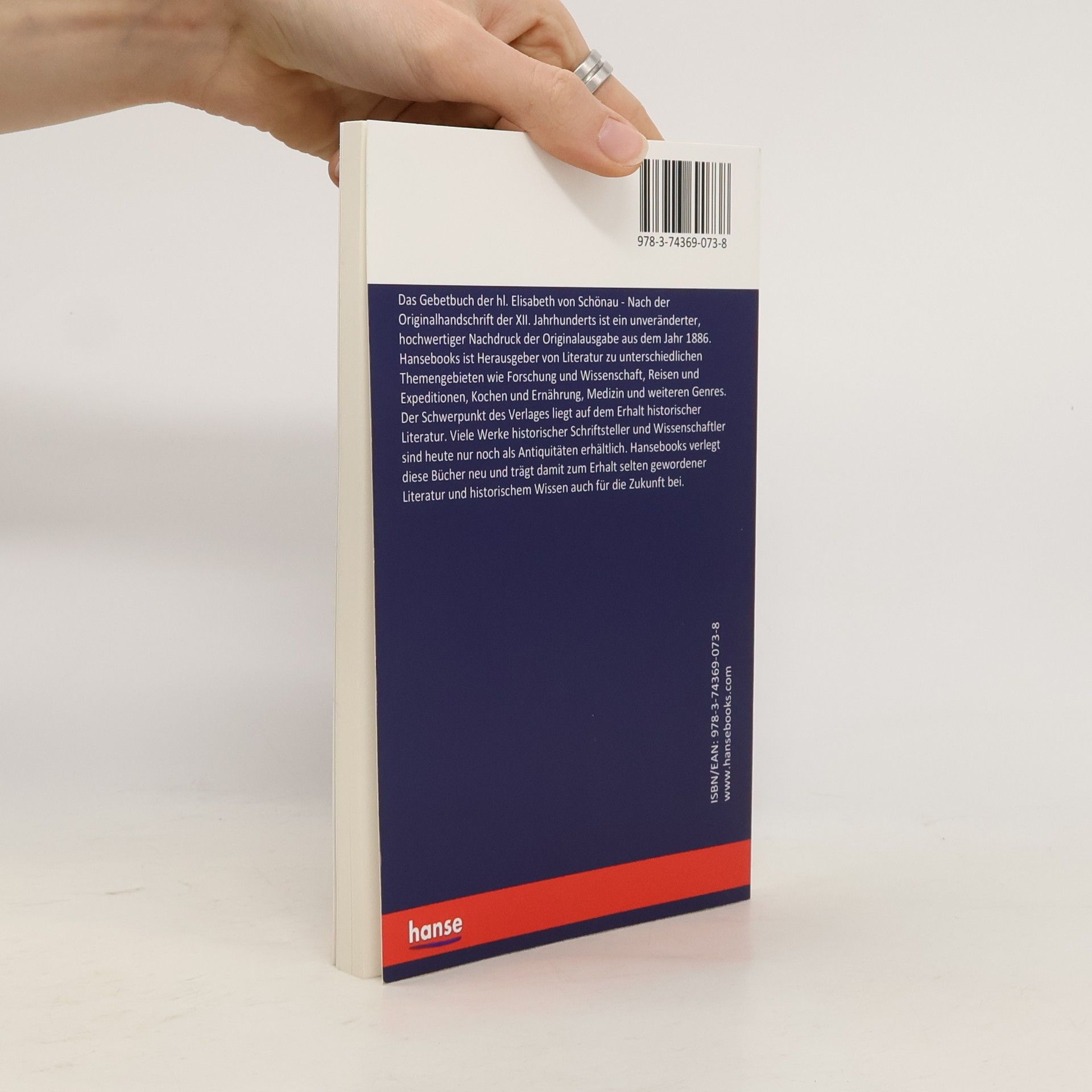 Das Gebetbuch der hl. Elisabeth von Schönau - Nach der Originalhandschrift der XII. Jahrhunderts ist ein unveränderter, hochwertiger Nachdruck der Originalausgabe aus dem Jahr 1886. Hansebooks ist Herausgeber von Literatur zu unterschiedlichen Themengebieten wie Forschung und Wissenschaft, Reisen und Expeditionen, Kochen und Ernährung, Medizin und weiteren Genres. Der Schwerpunkt des Verlages liegt auf dem Erhalt historischer Literatur. Viele Werke historischer Schriftsteller und Wissenschaftler sind heute nur noch als Antiquitäten erhältlich. Hansebooks verlegt diese Bücher neu und trägt damit zum Erhalt selten gewordener Literatur und historischem Wissen auch für die Zukunft bei.