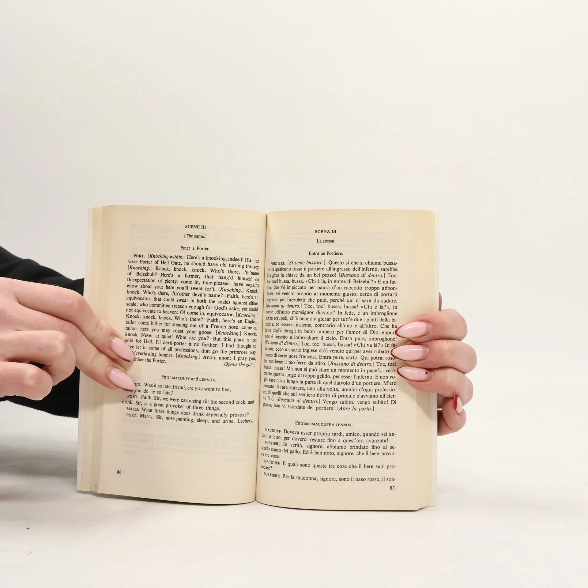 Testo originale a fronte Macbeth e Banquo, generali di Duncan, re di Scozia, incontrano tre streghe che salutano Macbeth come futuro signore di Cawdor e poi re, Banquo come progenitore di re. Lady Macbeth spinge il marito ad uccidere Duncan giunto nel loro castello, mentre i figli del re riescono a fuggire. Nominato re, Macbeth elimina Banquo, dalla cui ombra sarà però perseguitato. Interroga poi le streghe che gli profetizzano che non sarà mai vinto da "nato da donna" e che regnerà finché la foresta di Birnam non si muoverà. Malcolm e Macduff muovono contro Macbeth che fa ucccidere la moglie e i figli di Macduff. Lady Macbeth impazzisce e si uccide, il marito è ucciso da Macduff (tolto anzitempo dal ventre materno), mentre l'esercito avanza, coperto da rami e fronde.