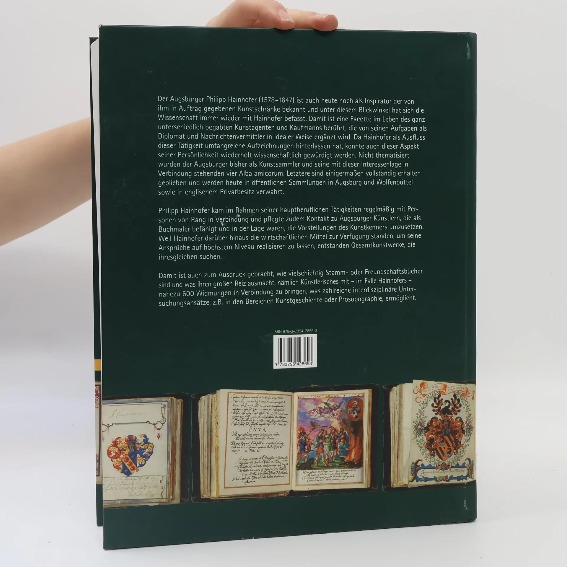 Der Augsburger Philipp Hainhofer (1578–1647) ist bekannt für die von ihm in Auftrag gegebenen Kunstschränke, was das Interesse der Wissenschaft auf seine Rolle als Kunstagent und Kaufmann lenkt. Seine Aufgaben als Diplomat und Nachrichtenvermittler ergänzen dieses Bild. Hainhofer hinterließ umfangreiche Aufzeichnungen, die seine Persönlichkeit beleuchten. Weniger thematisiert wurde jedoch seine Rolle als Kunstsammler und seine vier Alba amicorum, die größtenteils erhalten sind und heute in öffentlichen Sammlungen in Augsburg und Wolfenbüttel sowie in englischem Privatbesitz aufbewahrt werden. Im Rahmen seiner beruflichen Tätigkeiten pflegte Hainhofer Kontakte zu ranghohen Personen und Augsburger Künstlern, die in der Buchmalerei tätig waren und seine Vorstellungen umsetzen konnten. Dank seiner finanziellen Mittel konnte er seine hohen Ansprüche verwirklichen, was zu einzigartigen Gesamtkunstwerken führte. Die Vielfalt der Stamm- oder Freundschaftsbücher, die nahezu 600 Widmungen enthalten, bietet zahlreiche interdisziplinäre Ansätze für Untersuchungen in Bereichen wie Kunstgeschichte oder Prosopographie.
