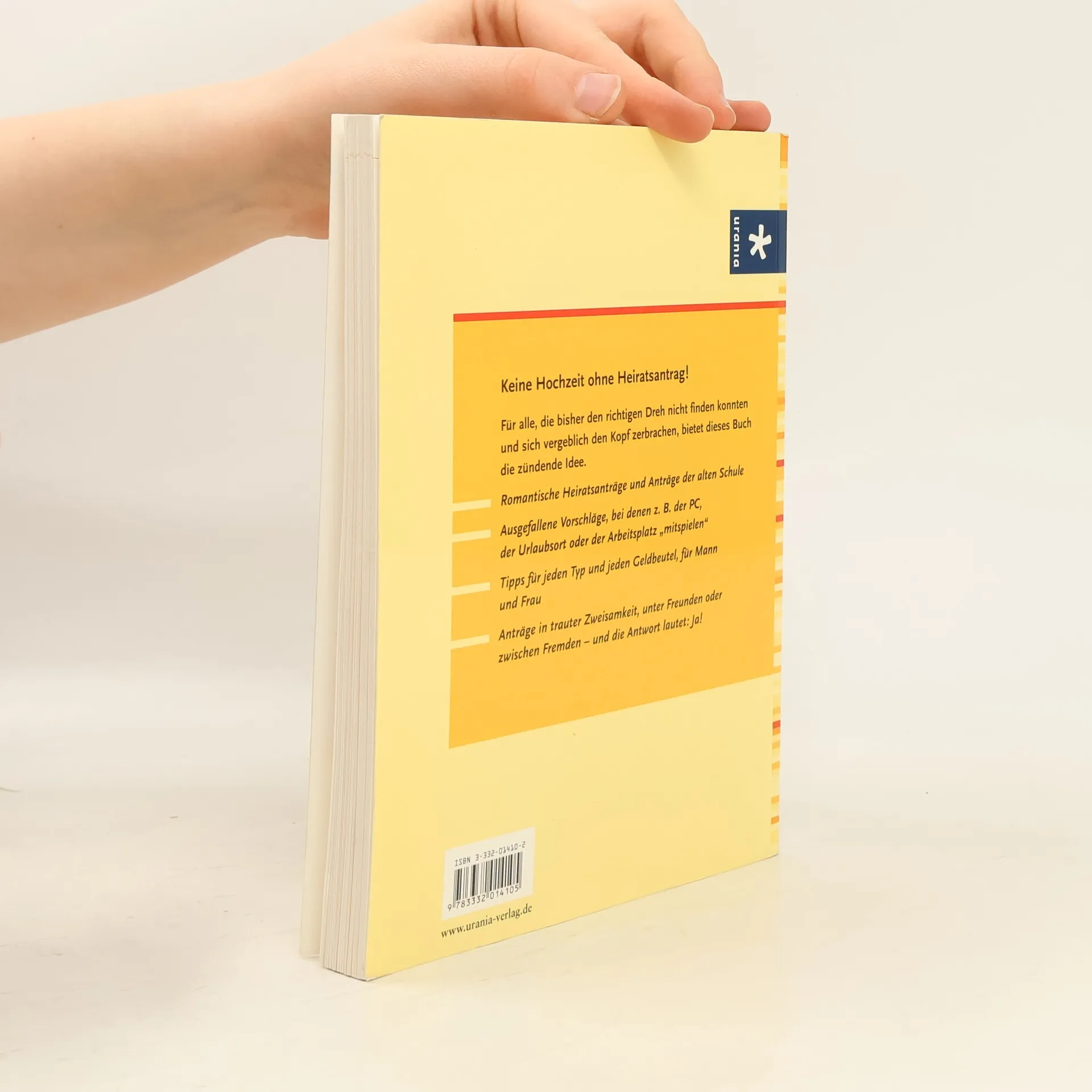 Anregungen für eine fantasiereiche Gestaltung eines besonderen Augenblicks. Fast 50 Vorschläge, wie man einen Heiratsantrag inszenieren kann. Es geht nicht um Reden oder Formulierungen, sondern um fantasiereiche, z.T. aufwendige Gestaltungen eines besonderen Augenblicks, z.B. Auslegen des Antrags mit Holzplanken am Strand und mit der Freundin einen Rundflug buchen. Möglich in der Gruppe "Hochzeitsgestaltung". (2)