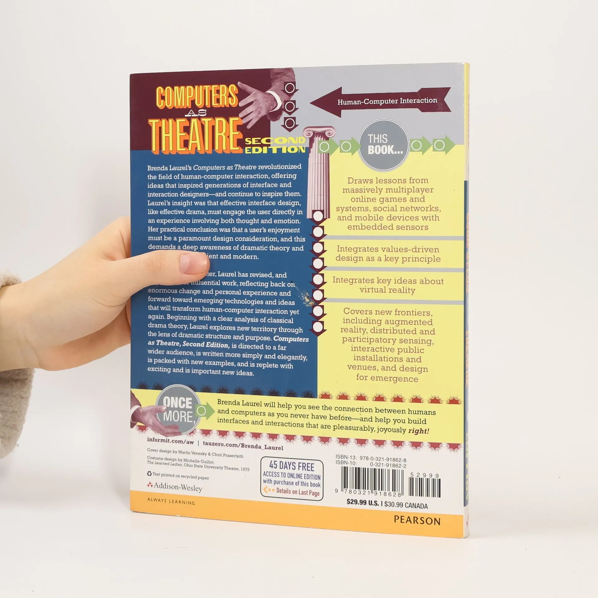 Brenda Laurel's "Computers as Theatre" revolutionized the field of human-computer interaction, offering ideas that inspired generations of interface and interaction designers-and continue to inspire them. Laurel's insight was that effective interface design, like effective drama, must engage the user directly in an experience involving both thought and emotion. Her practical conclusion was that a user's enjoyment must be a paramount design consideration, and this demands a deep awareness of dramatic theory and technique, both ancient and modern. Now, two decades later, Laurel has revised and revamped her influential work, reflecting back on enormous change and personal experience and forward toward emerging technologies and ideas that will transform human-computer interaction yet again. Beginning with a clear analysis of classical drama theory, Laurel explores new territory through the lens of dramatic structure and purpose. " Computers as Theatre, Second Edition, " is directed to a far wider audience, is written more simply and elegantly, is packed with new examples, and is replete with exciting andimportant new ideas. This book Draws lessons from massively multiplayer online games and systems, social networks, and mobile devices with embedded sensors Integrates values-driven design as a key principle Integrates key ideas about virtual reality Covers new frontiers, including augmented reality, distributed and participatory sensing, interactive public installations and venues, and design for emergence Once more, Brenda Laurel will help you see the connection between humans and computers as you never have before-and help you build interfaces and interactions that are pleasurably, joyously right!"