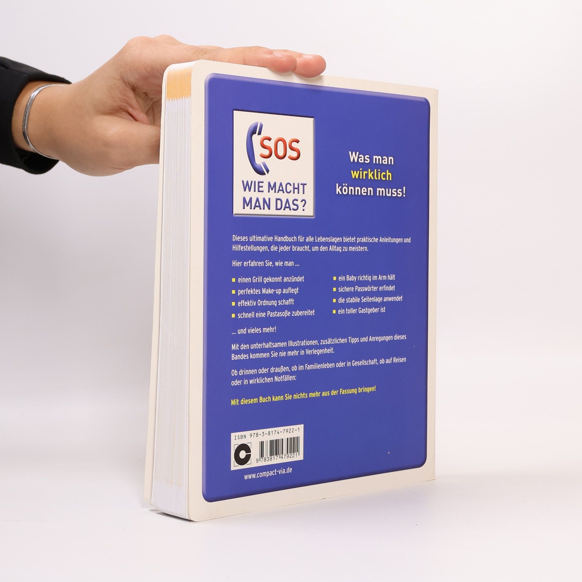 Dieses Handbuch bietet praktische Anleitungen und Hilfestellungen, die jeder braucht, um den Alltag zu meistern. Ob drinnen oder draußen, ob im Familienleben oder in Gesellschaft, ob auf Reisen oder in wirklichen Notfällen: Mit diesem Buch kann Sie nichts mehr aus der Fassung bringen! Hier erfahren Sie, wie man Krawattenknoten bindet, Knöpfe annäht, Wettervorhersagen anhand von Wolken trifft, einen unbekannten Hund begrüßt, Verbrennungen behandelt, ein Baby richtig wickelt, einen Grill gekonnt anzündet, effektiv Ordnung schafft, die stabile Seitenlage anwendet, sichere Passwörter erfindet, und vieles mehr. - das ultimative Handbuch für Alltag und Freizeit - praktisches Wissen und Hilfestellung für alle Lebenslagen - mit Schritt-für-Schritt-Anleitungen und Hintergrundinfos - Themenbereiche: Männersache, Frauenliga, Kinderabteilung, Indoor, Outdoor, Schreibkram, Reisebegleiter, Erste Hilfe und Stilregeln