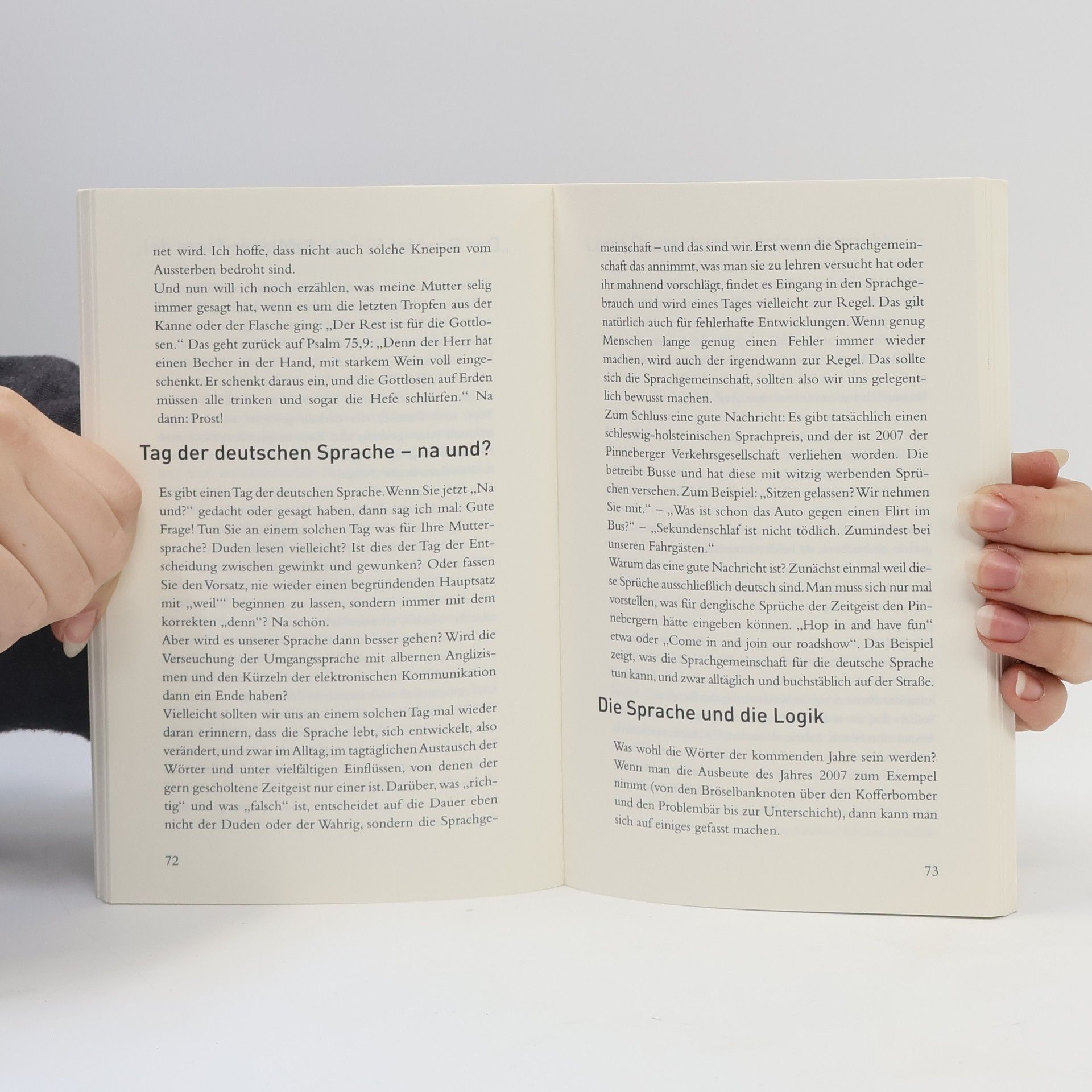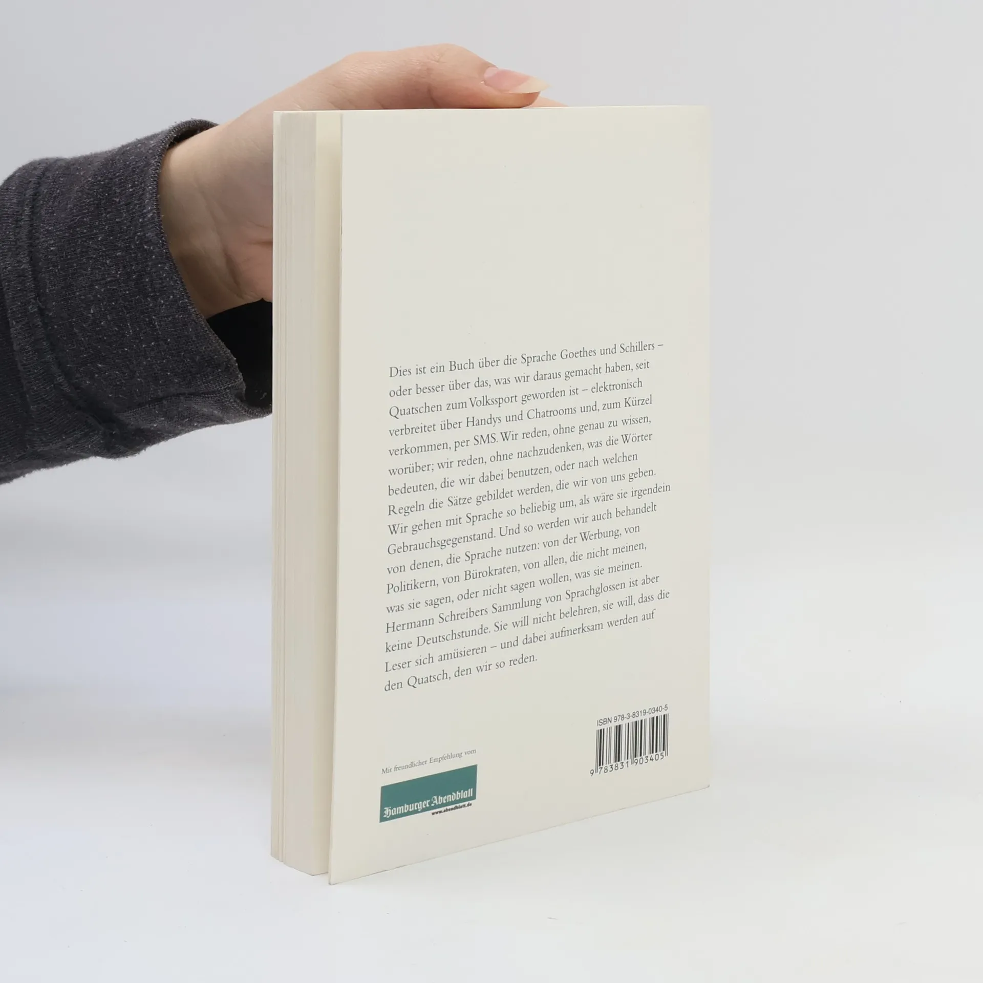 Dies ist ein Buch über die Sprache Goethes und Schillers – oder besser über das, was wir daraus machen, seit Quatschen zum Volkssport geworden ist, elektronisch verbreitet über Handys und Chatrooms und, zum Kürzel verkommen, per SMS. Wir reden, ohne genau zu wissen, worüber; wir reden, ohne nachzudenken, was die Wörter bedeuten, die wir dabei benutzen, oder nach welchen Regeln die Sätze gebildet werden, die wir von uns geben. Wir gehen mit Sprache so beliebig um, als wäre sie irgendein Gebrauchsgegenstand. Und so werden wir auch behandelt von denen, die Sprache nutzen, um uns zum Kaufen zu animieren oder uns Vorschriften zu machen: von der Werbung, von Politikern, von Bürokraten, von allen, die nicht meinen, was sie sagen, oder nicht sagen wollen, was sie meinen. Diese Sammlung von Sprachglossen, die Hermann Schreiber jeden Samstag auf Seite 1 des Hamburger Abendblatts veröffentlicht, ist aber keine Deutschstunde. Sie will nicht belehren, sie will, dass die Leser sich amüsieren – und dabei aufmerksam werden auf den Quatsch, den wir täglich daherreden