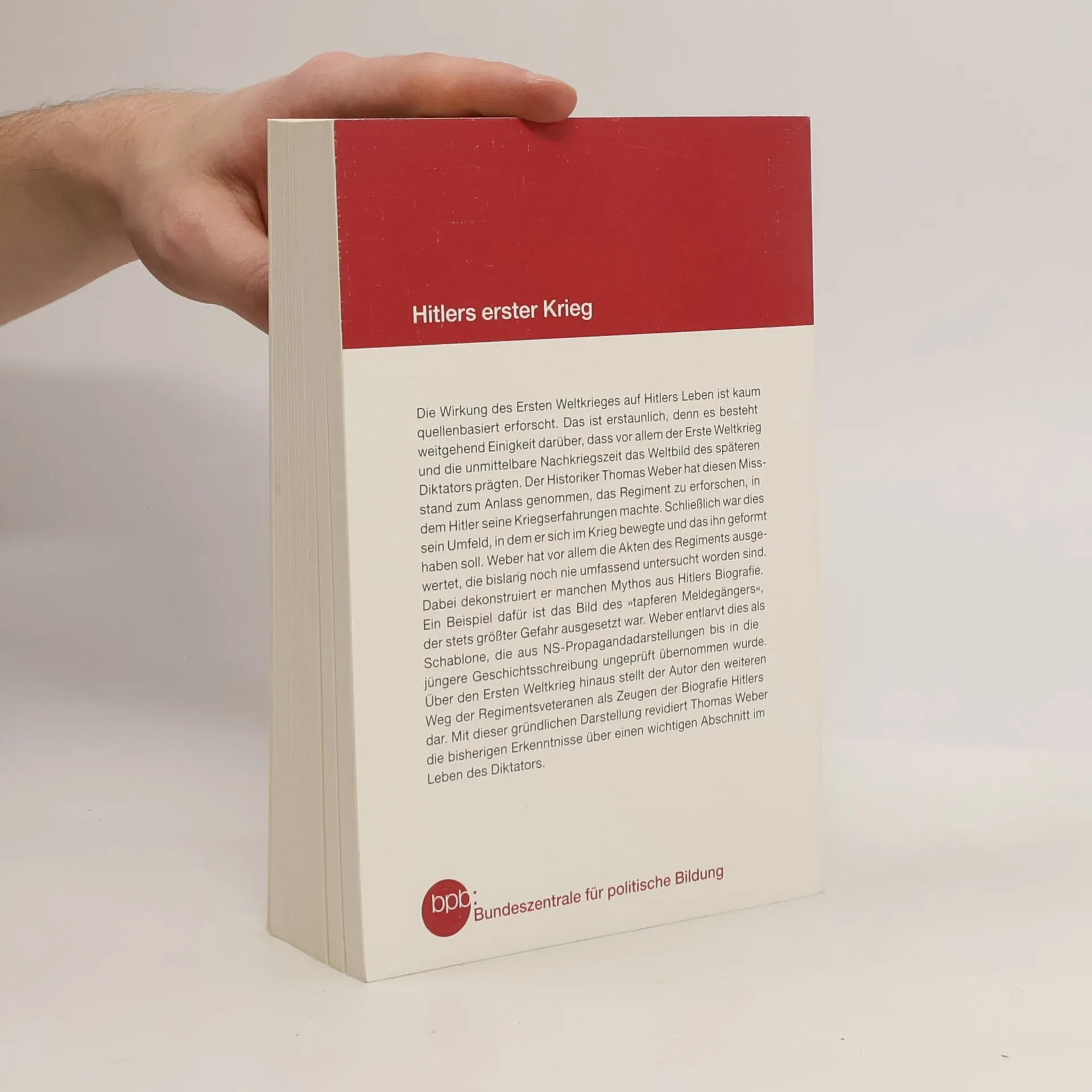Die Wirkung des Ersten Weltkrieges auf Hitlers Leben war bislang wenig bekannt. Der Historiker Thomas Weber hat dies zum Anlass genommen, das Regiment zu erforschen, in dem der spätere Diktator seine Kriegserfahrungen machte und das ihn geformt haben soll. Dabei dekonstruiert er manchen Mythos aus Hitlers Biografie als Schablone, die aus NS-Propagandadarstellungen ungeprüft bis in die jüngere Geschichtsschreibung übernommen wurde. Über den Ersten Weltkrieg hinaus stellt der Autor den weiteren Weg der Regimentsveteranen als Zeugen der Biografie Hitlers dar. Mit dieser gründlichen Untersuchung revidiert Thomas Weber die bisherigen Erkenntnisse über einen wichtigen Abschnitt im Leben Hitlers. Quelle: bpb.de