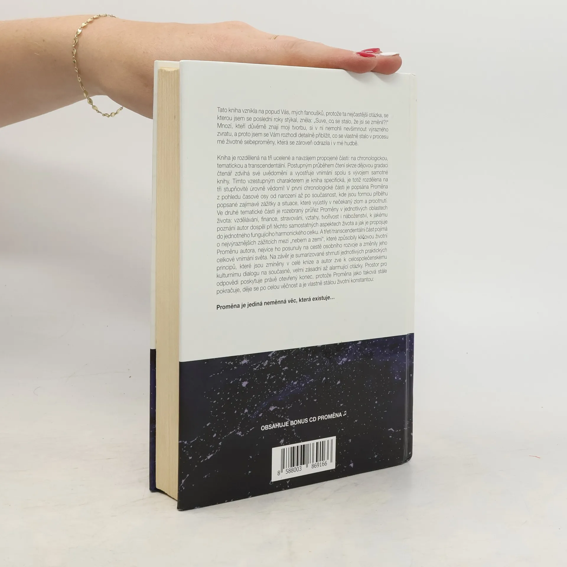 Tato kniha vznikla na popud fanoušků, kteří se často ptali, co způsobilo mou změnu. Mnozí si všimli výrazného zvratu v mé tvorbě, a proto jsem se rozhodl podělit o proces své životní proměny, která se odrazila i v mé hudbě. Kniha je rozdělena na tři propojené části: chronologickou, tematickou a transcendentální. Postupným čtením se zvyšuje uvědomění a vnímání, což je charakteristické pro vzestupný charakter textu, rozděleného na tři úrovně vědomí. V první části je popsána Proměna od narození po současnost, zahrnující zajímavé zážitky a situace, které vedly k nečekanému zvratu. Druhá část se zaměřuje na Proměnu v oblastech jako vzdělávání, finance, stravování, vztahy, tvořivost a náboženství, a zkoumá, jak se tyto aspekty propojují do harmonického celku. Třetí část se věnuje nejvýraznějším zážitkům mezi „nebem a zemí“, které zásadně ovlivnily mou cestu osobního rozvoje a vnímání světa. Na závěr je shrnuto několik praktických principů a autor vyzývá k dialogu o aktuálních a zásadních otázkách. Otevřený konec naznačuje, že Proměna je neustálý proces, který trvá věčně, neboť je jedinou neměnnou konstantou v životě.