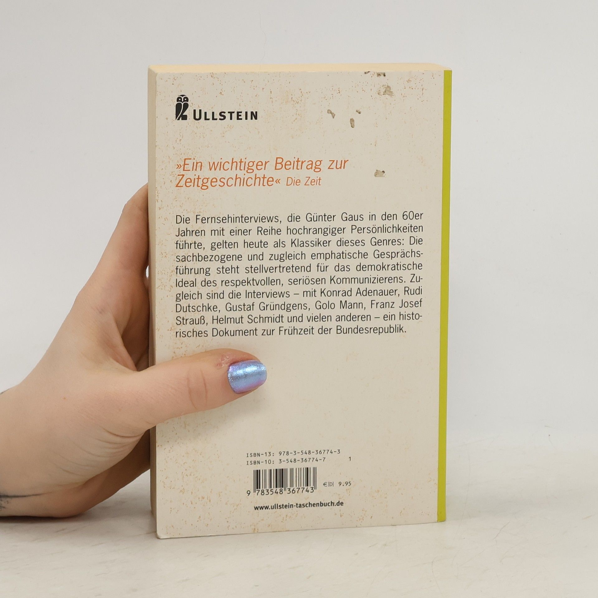 Die Fernsehinterviews, die Günter Gaus in den 60er Jahren mit einer Reihe hochrangiger Persönlichkeiten führte, gelten heute als Klassiker dieses Genres: Die sachbezogene und zugleich emphatische Gesprächsführung steht stellvertretend für das demokratische Ideal des respektvollen, seriösen Kommunizierens. Zugleich sind die Interviews - mit Konrad Adenauer, Rudi Dutschke, Gustaf Gründgens, Thomas Mann, Franz Josef Strauß, Helmut Schmidt und anderen - ein historisches Dokument zur Frühzeit der Bundesrepublik.