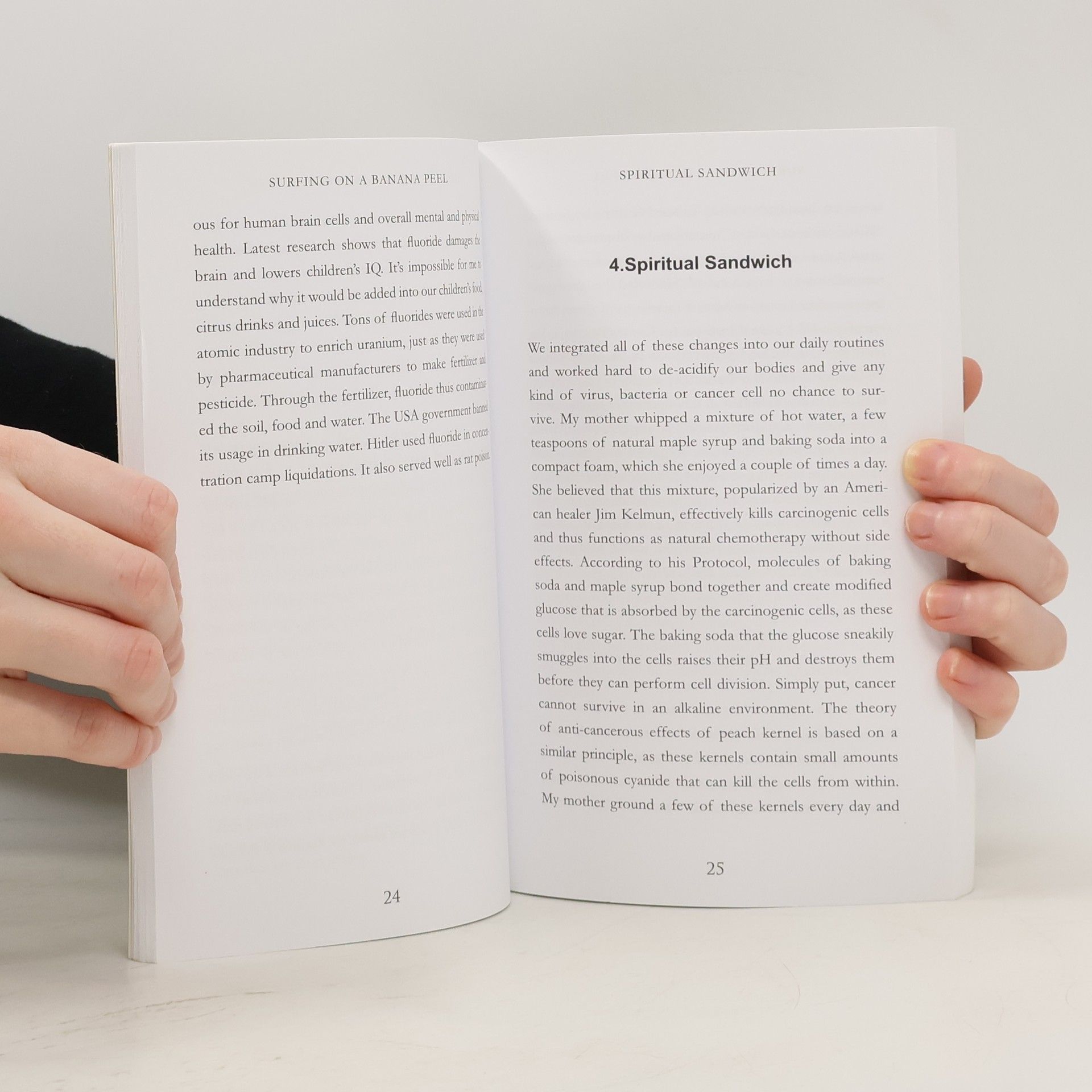 SURFING ON A BANANA PEEL tells the true story of a person on a spiritual path that took an entirely unexpected and extraordinary direction while dealing with a serious illness in her family. She cleanses herself from spiritual mud she plunged into with good intentions in her past, and she spontaneously discovers a new point of view, absorbs previously unknown energy, peeks behind the hidden line of this world and receives truthful information from a new source. Her endeavor leads on a journey to spiritual evolution all while learning of alternative ways to cure and prevent cancer and other diseases. The first part of SURFING ON A BANANA PEEL, the narrator focuses too much on the physical circumstances of her life. She is angry and disappointed by lies and manipulations she used to genuinely believe. She separates seed from chaff in all areas of life and fills trashcans with the unneeded, not realizing the positive impact the whole disaster will bring. This, part one, also extensively describes alternative methods to preventing cancer and other diseases. The first part is narrated in past tense, symbolizing the outdated state of mind and her efforts to overcome it. Part two is narrated in present time, where physical circumstances no longer have power, the narrator simply accepts them and doesn't try to fight them, thanks to a new point of view. This second part is written in a diary form. That what may appear scattered is intentional, as it expresses the most important thought, feeling or information of the given day. A leap between days is present because each day brings only that, what we deserve. The progress of days the narrator passes through with a different approach not only creates an interesting narration of her spiritual evolvement, but also inspires you, the readers, with solutions to your life crises, problems, and search for inner peace. Surfing smoothly, without falling, is simply possible even on the surface of a stormy ocean, as long as we know how. This petite book is not a guide to surfing, but a companion offering ways to find the balance needed to discover the true path to personal evolution while preventing and treating cancer and other diseases.