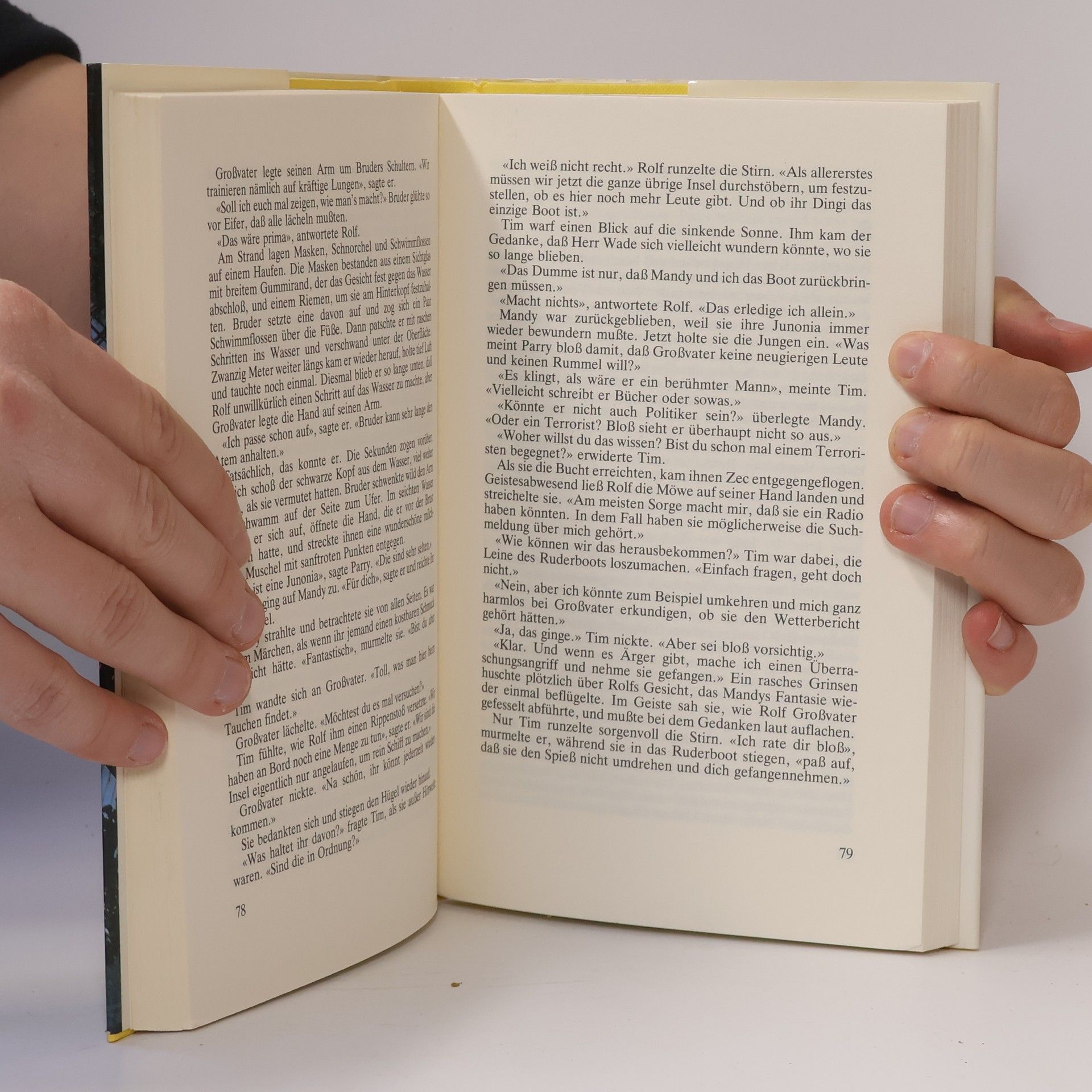 Auf einer zauberhaften Insel im Karibischen Meer treffen Tim und Mandy, die aus Chicago in den USA stammen, mit dem blonden Rolf zusammen — einem geheimnisvollen Jungen, der sich versteckt und mit seiner zahmen Möwe und seinem Segelboot nach einem fernen Ziel unterwegs ist. Dieses fesselnde Buch schildert ihre Freundschaft und ihre aufregenden Erlebnisse beim Segeln, Schwimmen un Tauchen — und einem verheerend den Hurrikan! Ein packendes Lesevergnügen! Wie herrlich muß es sein, auf einer Insel im Karibischen Meer am Strand zu liegen, zu planschen und zu schwimmen und den ganzen Tag zu faulenzen! Tim und Mandy jedoch — ein Junge und seine Schwester aus der fernen Millionenstadt Chicago — waren gar nicht dieser Ansicnt. Sie langweilten sich, weil ihre Eltern nie Zeit für sie hatten und weil sie nicht mit einem Boot hinausfahren durften — hinaus in die weite Bucht und über das tiefblaue Wasser zu den palmenbestanden Koralleninseln am Horizont. Als die beiden auf der großen Felsklippe herumkletterten und Tim einer Möwe helfen wollte, die von einder Schar anderer Möwen angegriffen wurde, ahnten sie noch nicht, wie bald sich ihr sehnlichster Wunsch erfüllen sollte. Denn zunächst kam es zu einer Prügelei — mit einem fremden, weißblonden Jungen. Er stürzte sich auf Tim, drosch auf ihn los und verschwand mit der Möwe so plötzlich wie er aufgetaucht war. Nach einem mitternächtlichen Treffen aber zwischen Tim und Mandy und dem blonden Jungen, der Rolf hieß, schlossen die drei dicke Freundschaft, weil sich erstens herausstellte, daß die zahme Möwe Rolf gehörte, und weil dieser zweitens ganz allein ein großes Segelboot besaß! Wie es weitergeht und welch tollw und aufregende Erlebnisse sich folgten, beim Segeln, Schwimmen und Tauchen, bei der Erkundung der Koralleninseln mit der alten Zuckermühle und der Hütte von Großvater, PArry und Bruder und ganz zuletzt bei dem fürchterlichen Wirbelsturm — das schildert alles dieses spannende Buch. Die jungen Leser (und gewiß auch viele ältere) werden sich bestimmt vom Zauber der tropischen Meeresinsel und der fesselnden Handlung gern berükken lassen und schließlich auch Rolfs Geheimnis entdecken; den großen Traum und das Leid des Jungen mit der Möwe.