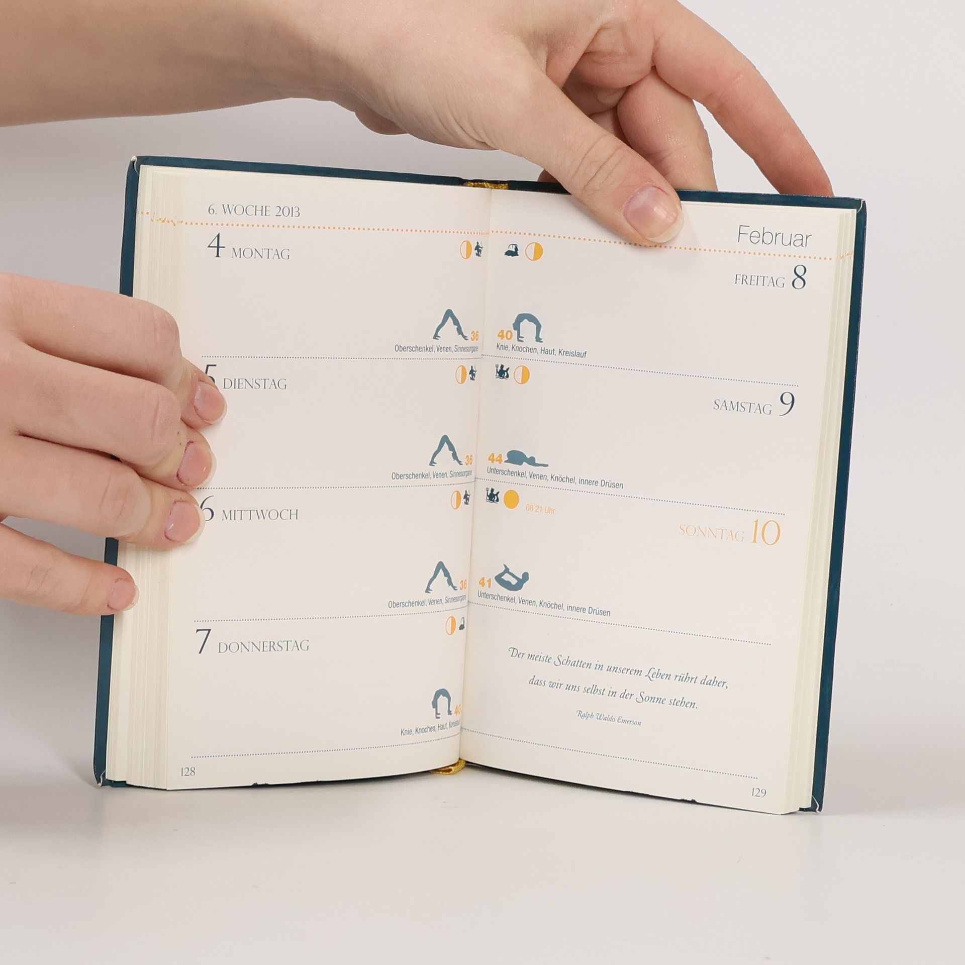 Mond-Yoga - noch mehr sanfte Energie mit der Kraft des Mondes Yoga ist populärer denn je. Wer seine positiven Effekte auf Körper und Geist intensivieren möchte, kann die Wahl der Übungen auf die Kräfte des Mondes abstimmen. Denn je nachdem, ob der Mond zu- oder abnimmt, ob Vollmond oder Neumond herrscht, kann Bewegung mehr entspannend oder eher kräftigend sein. Wichtig zu wissen ist, dass die Tierkreiszeichen, die der Mond in einem Monat durchwandert, unterschiedliche Organsysteme und Körperregionen 'regieren'. Alle diese Konstellationen werden bei den Yogaübungen in diesem Kalender berücksichtigt. So findet man für jeden Tag die besten und wirkungsvollsten Übungen - immer im Einklang mit dem Rhythmus des Mondes.