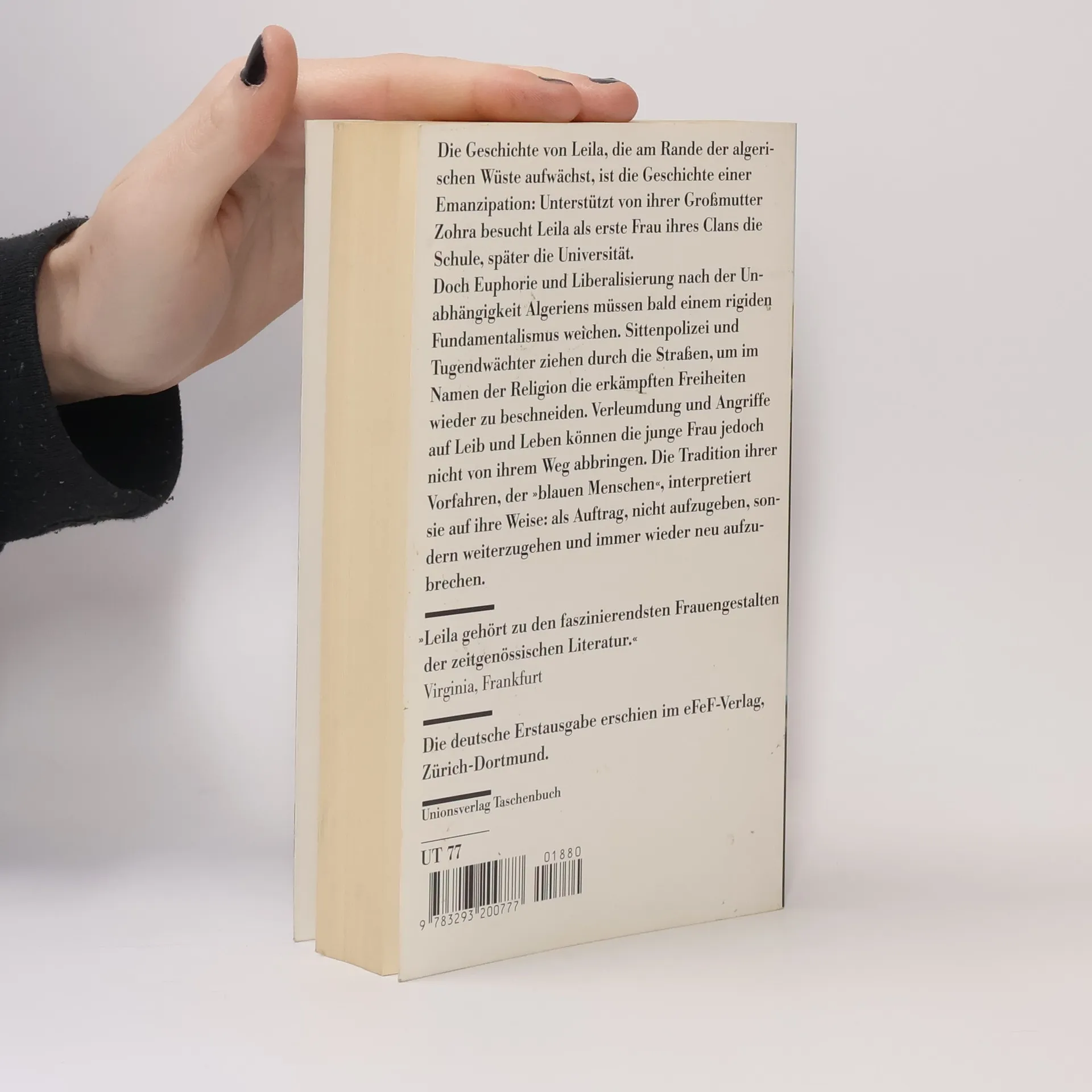 Die Geschichte von Leila, die am Rande der algerischen Wüste aufwächst, ist die Geschichte einer Emanzipation: Unterstützt von ihrer Großmutter Zohra, einer sesshaft gewordenen Nomadin, widersetzt sich Leila erfolgreich der Verheiratung und besucht als erste Frau ihres Clans die Schule, später die Universität. Doch die Liberalisierung nach der Unabhängigkeit Algeriens muss bald einem rigiden Fundamentalismus weichen, der die Frauen wieder unter den Schleier und ins Haus zurückdrängen will. Verleumdung, Verachtung und Angriffe auf Leib und Leben können die junge Frau jedoch nicht von ihrem Weg abbringen. Die Tradition ihrer Vorfahren, der »blauen Menschen«, interpretiert sie auf ihre Weise: als Auftrag, nicht aufzugeben, sondern weiterzugehen und immer wieder neu aufzubrechen.